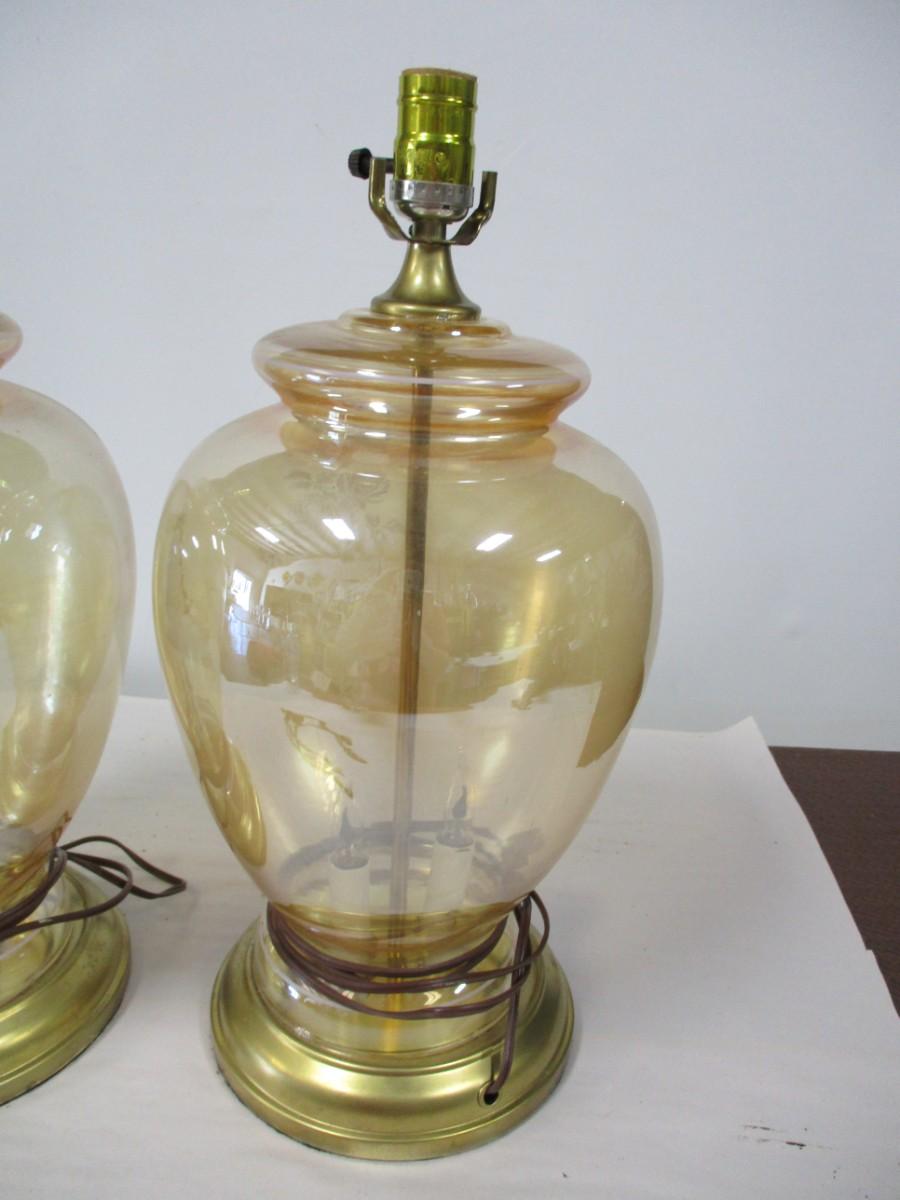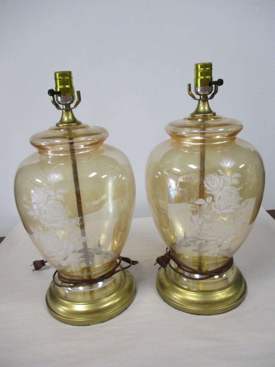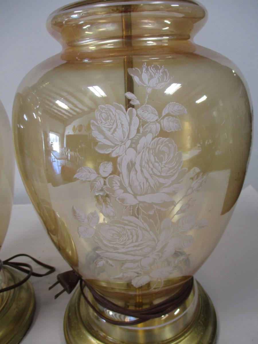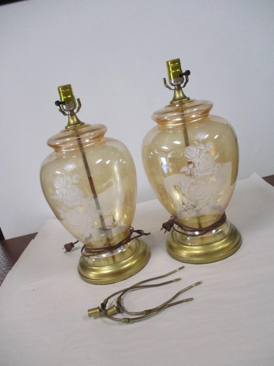 Pair Of Floral Etched Glass Iridescent Table Lamps