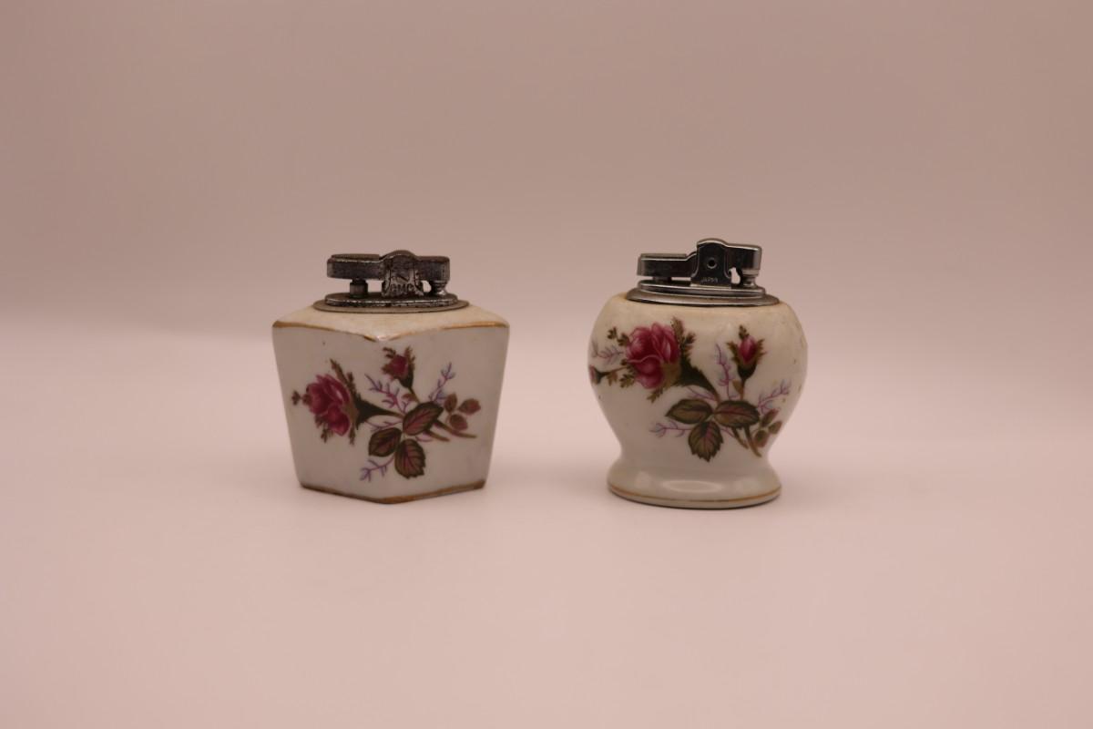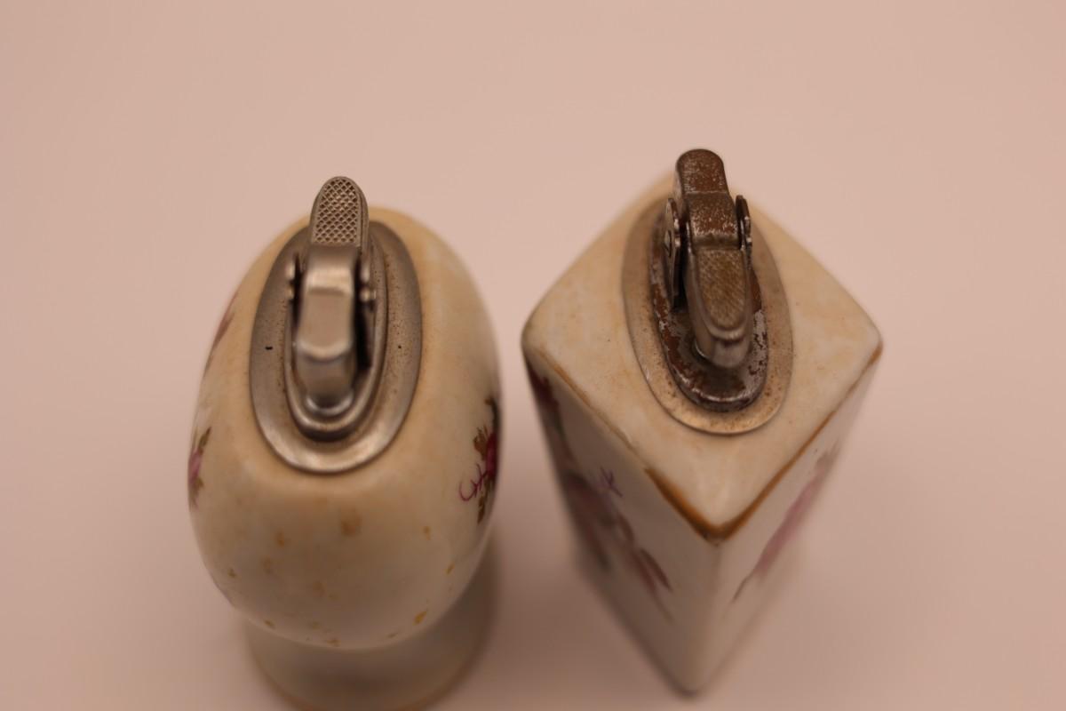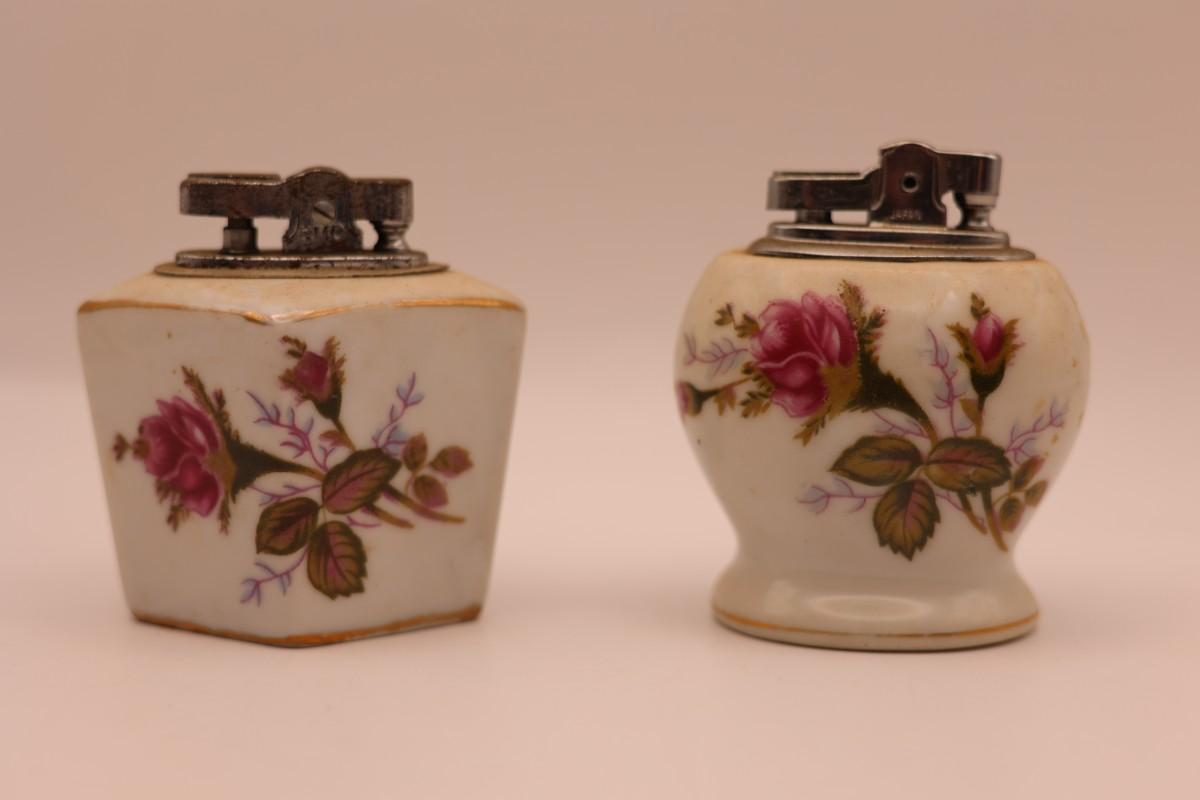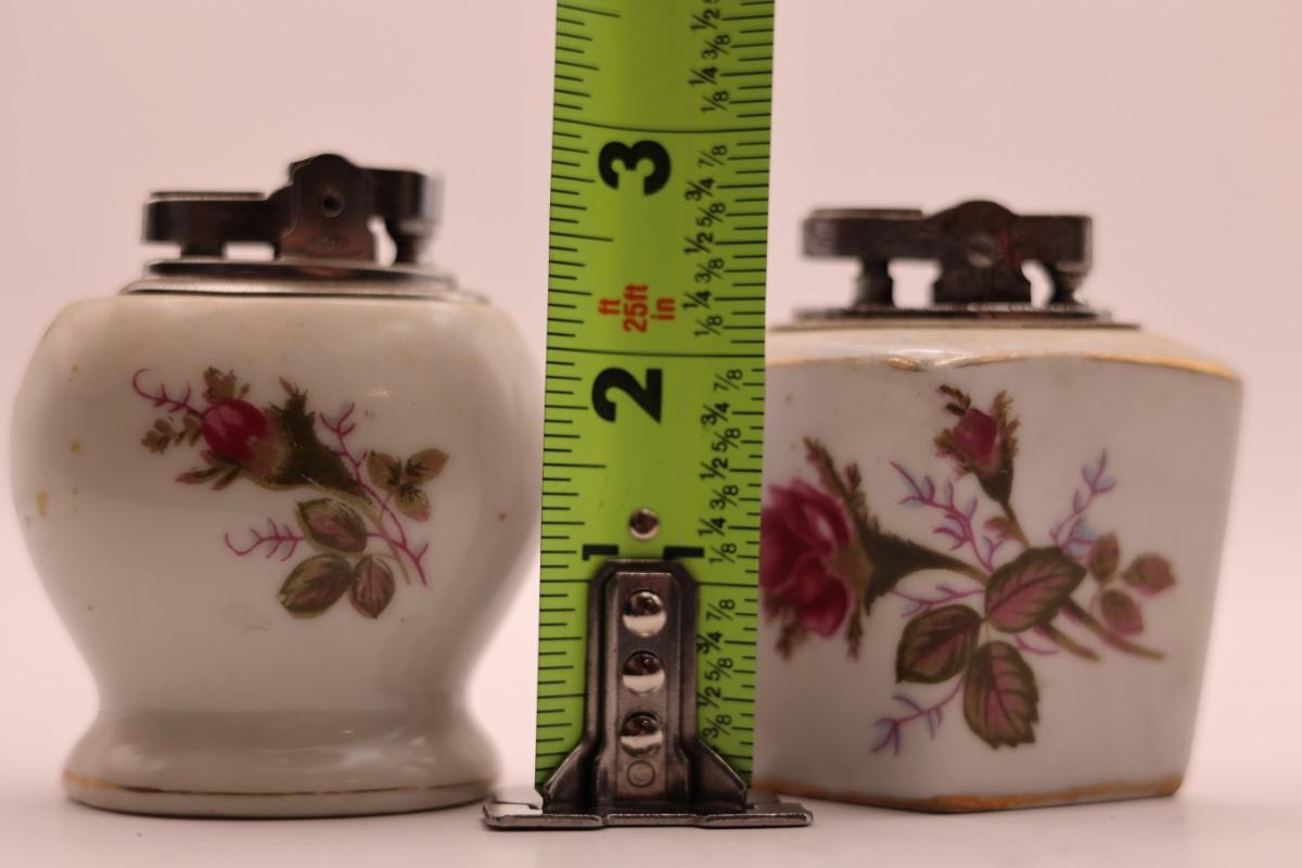 Pair of small porcelain table lighters with floral decoration and metal tops. Decorative vintage-style accessories. Untested. See photos for details and condition.