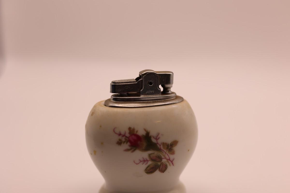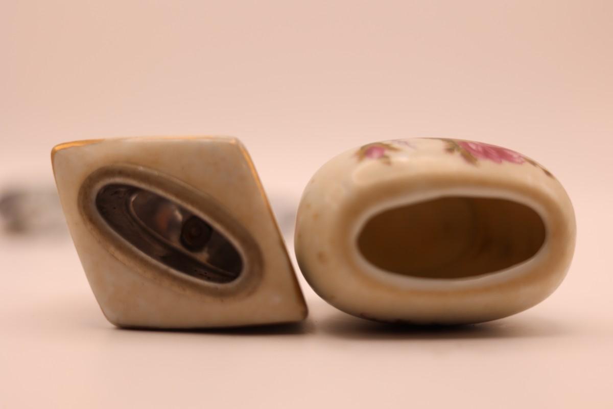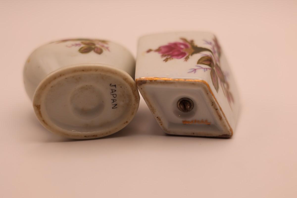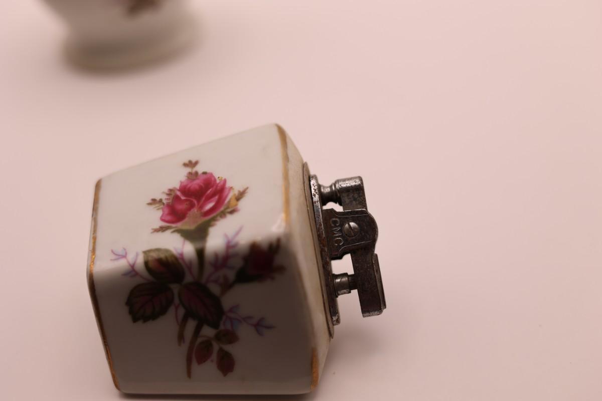 Pair of small porcelain table lighters with floral decoration and metal tops. Decorative vintage-style accessories. Untested. See photos for details and condition.