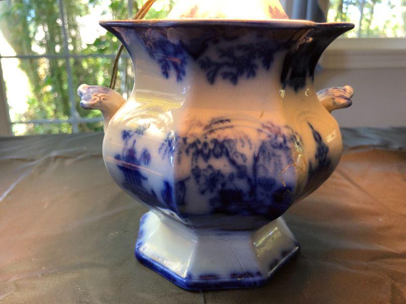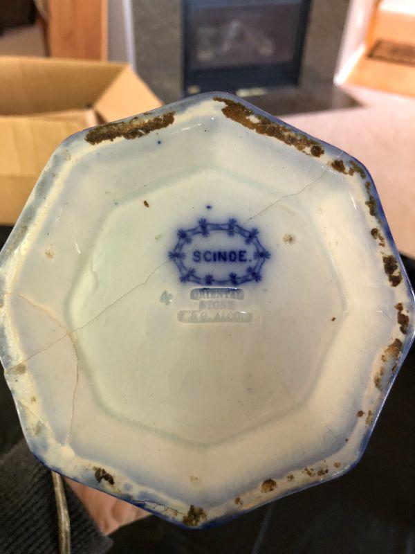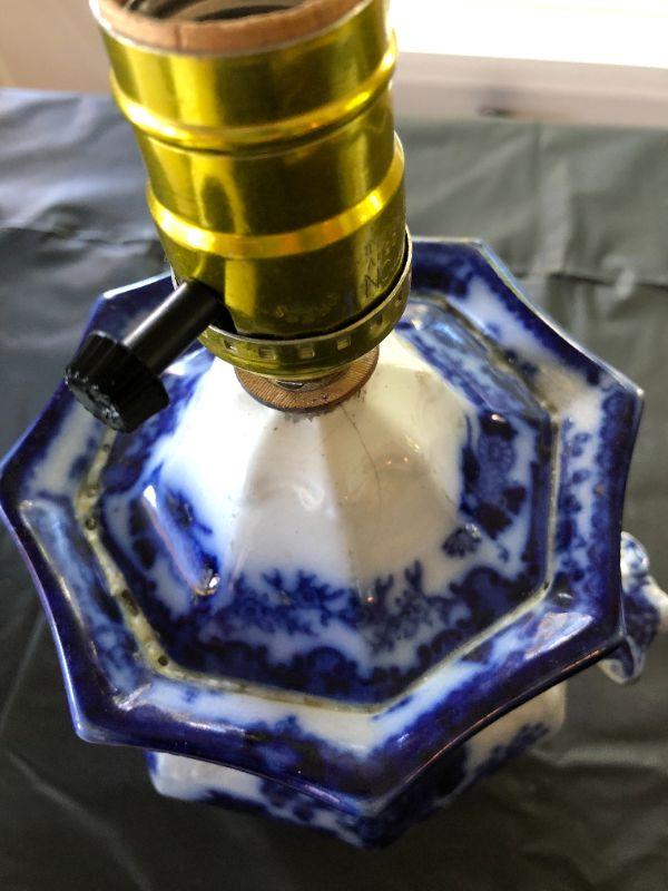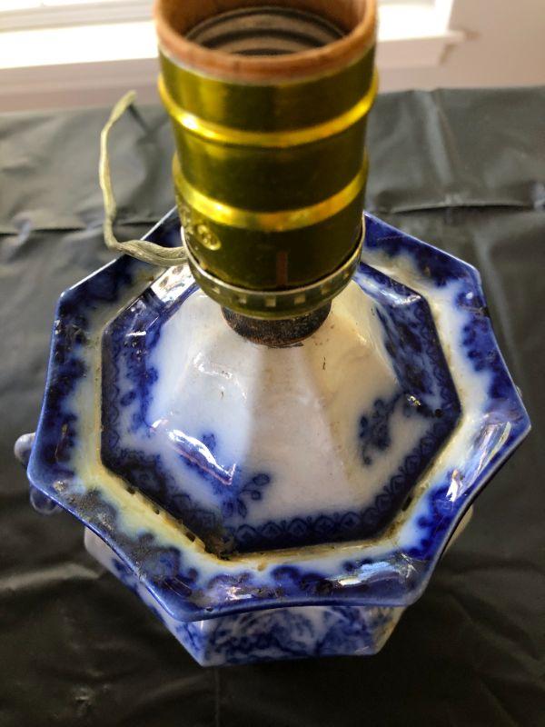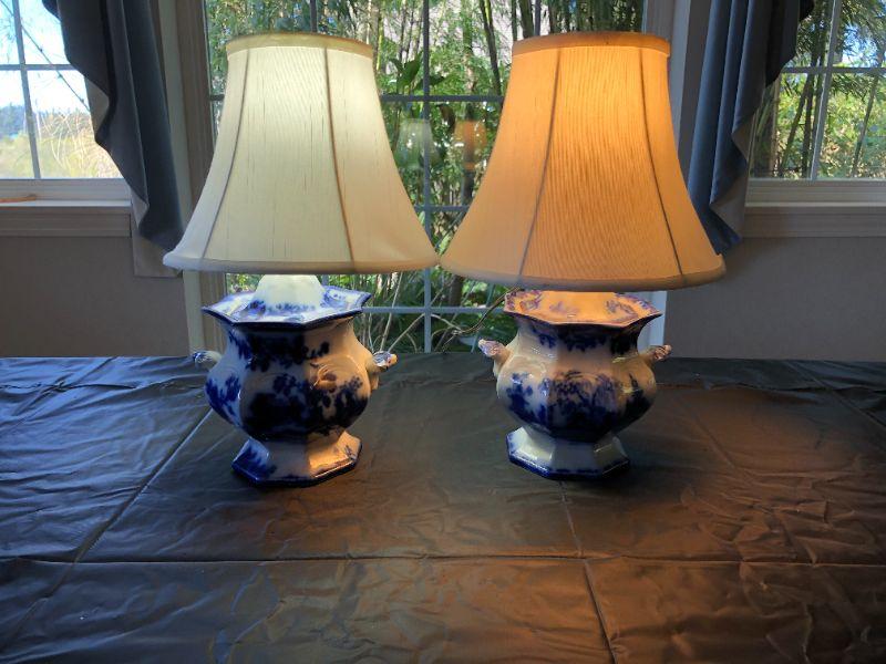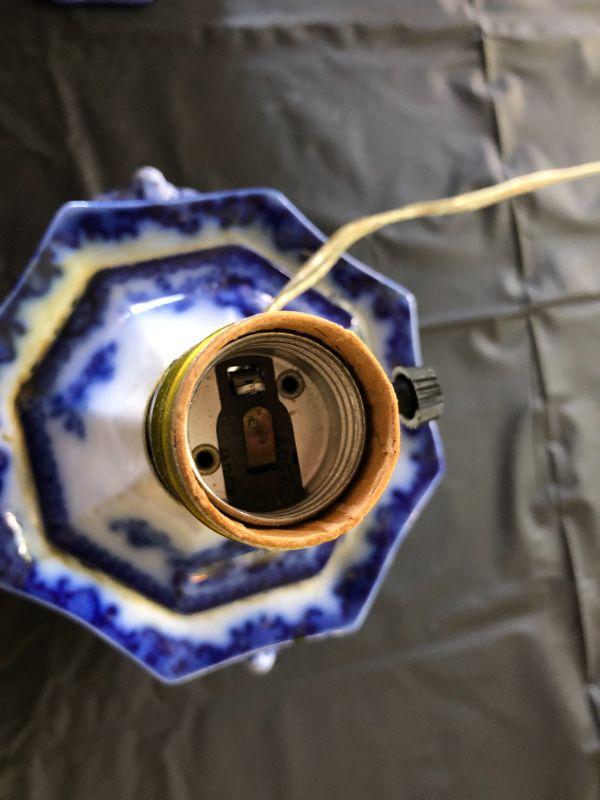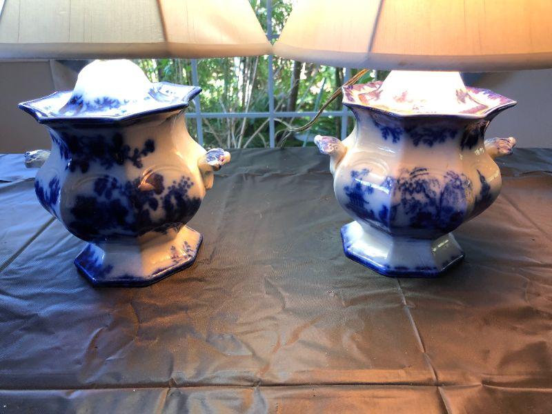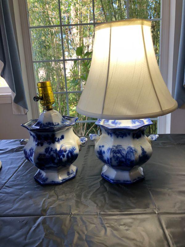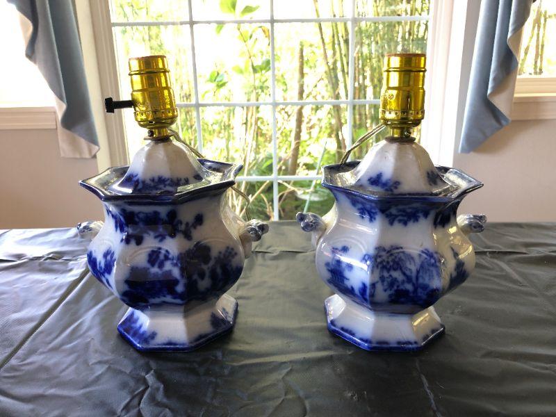 Beautiful pair of flow blue porcelain lamps, both in good working condition (one of the bulb fittings is loose and should be reinforced). They appear to be a set, however one is stamped Scinde Oriental Stone J&G Alcock on the bottom, and the other has a blue dot/mark with no stamp (as shown in photos).