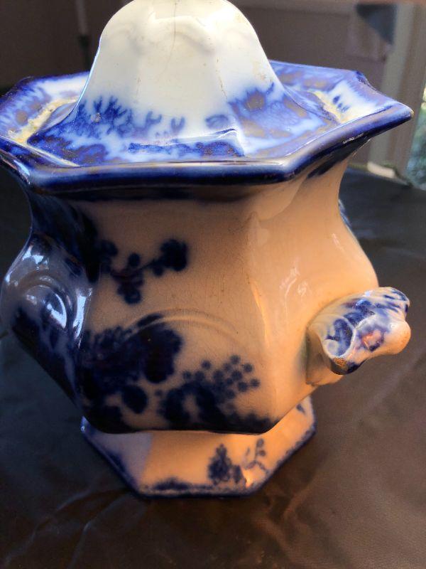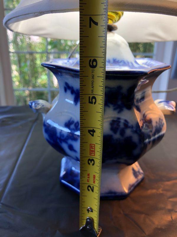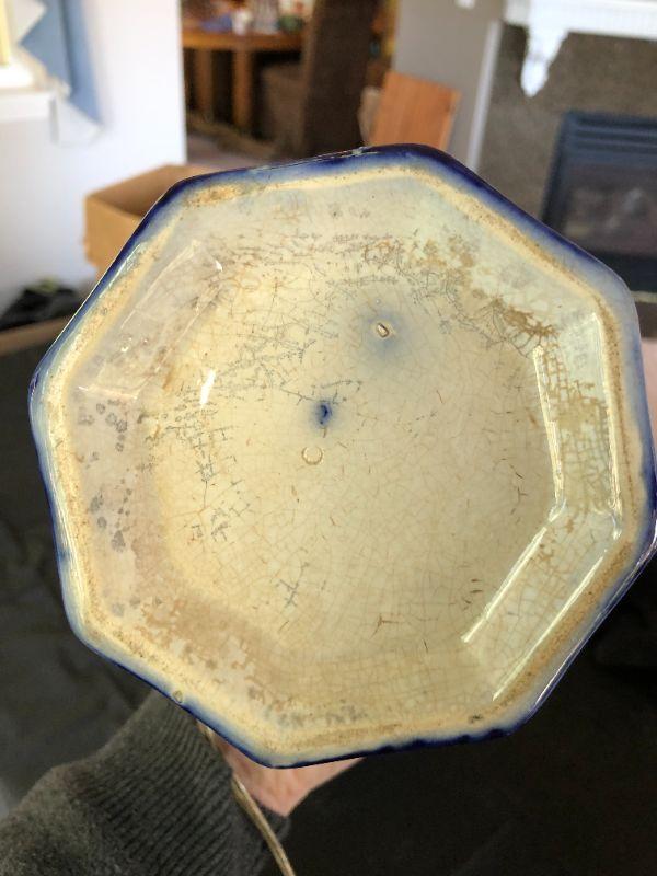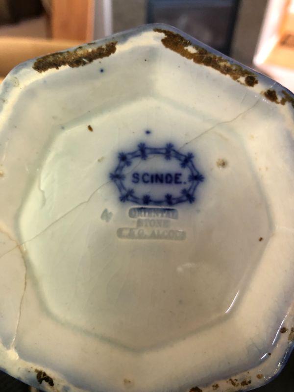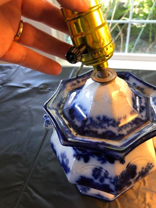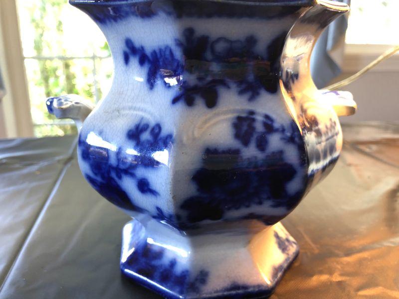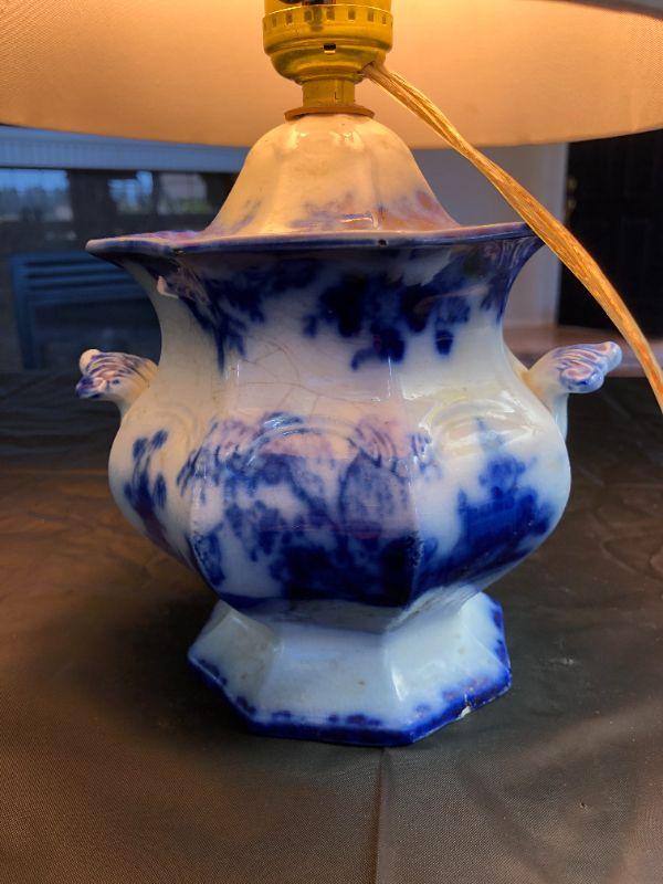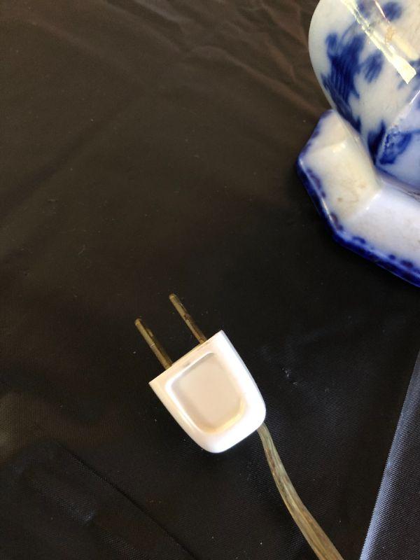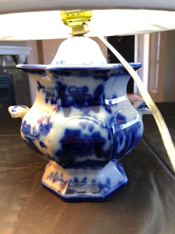 Beautiful pair of flow blue porcelain lamps, both in good working condition (one of the bulb fittings is loose and should be reinforced). They appear to be a set, however one is stamped Scinde Oriental Stone J&G Alcock on the bottom, and the other has a blue dot/mark with no stamp (as shown in photos).