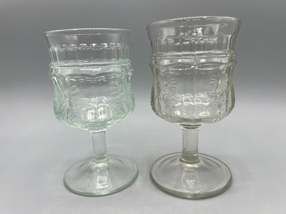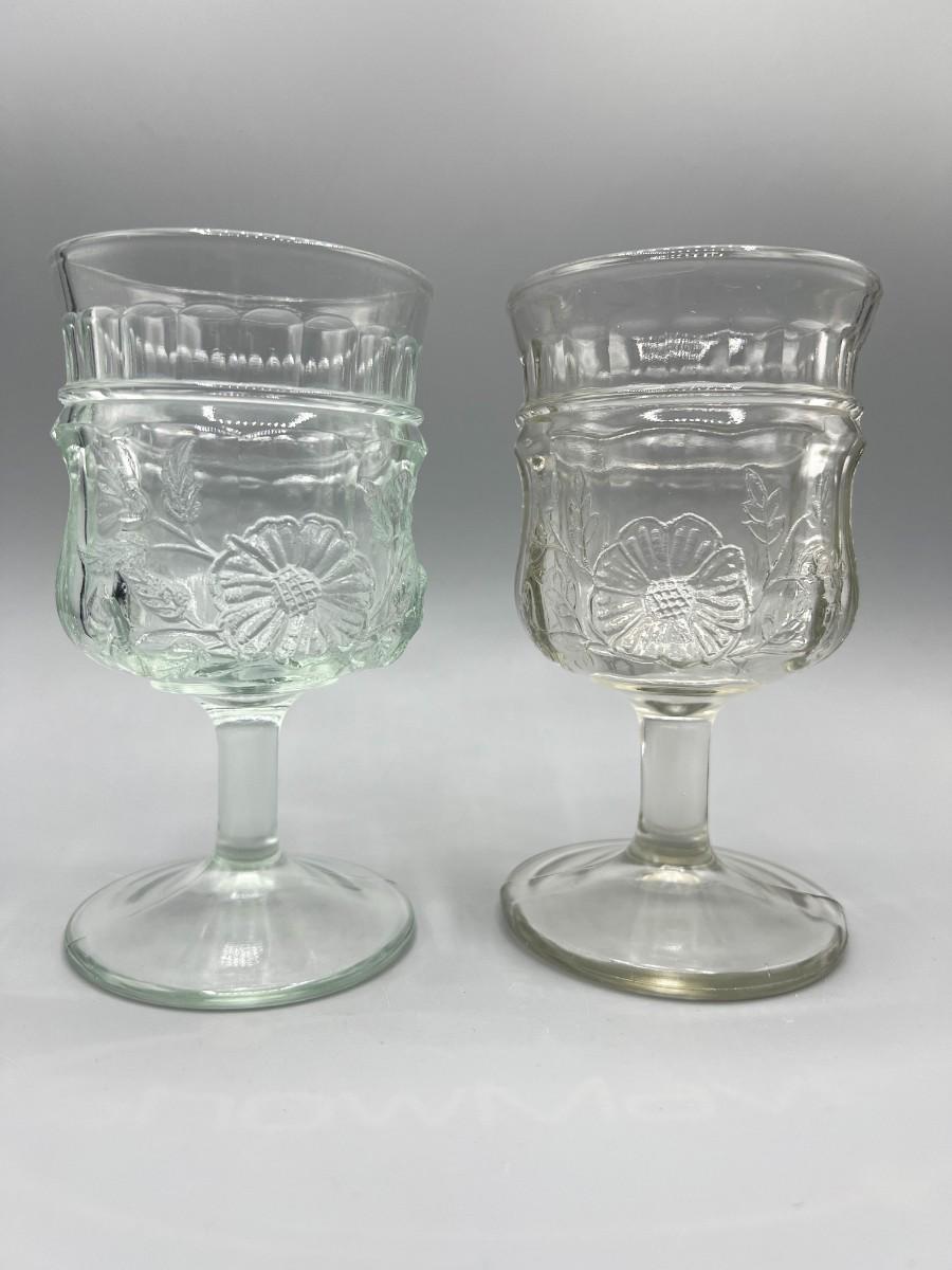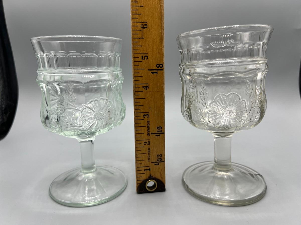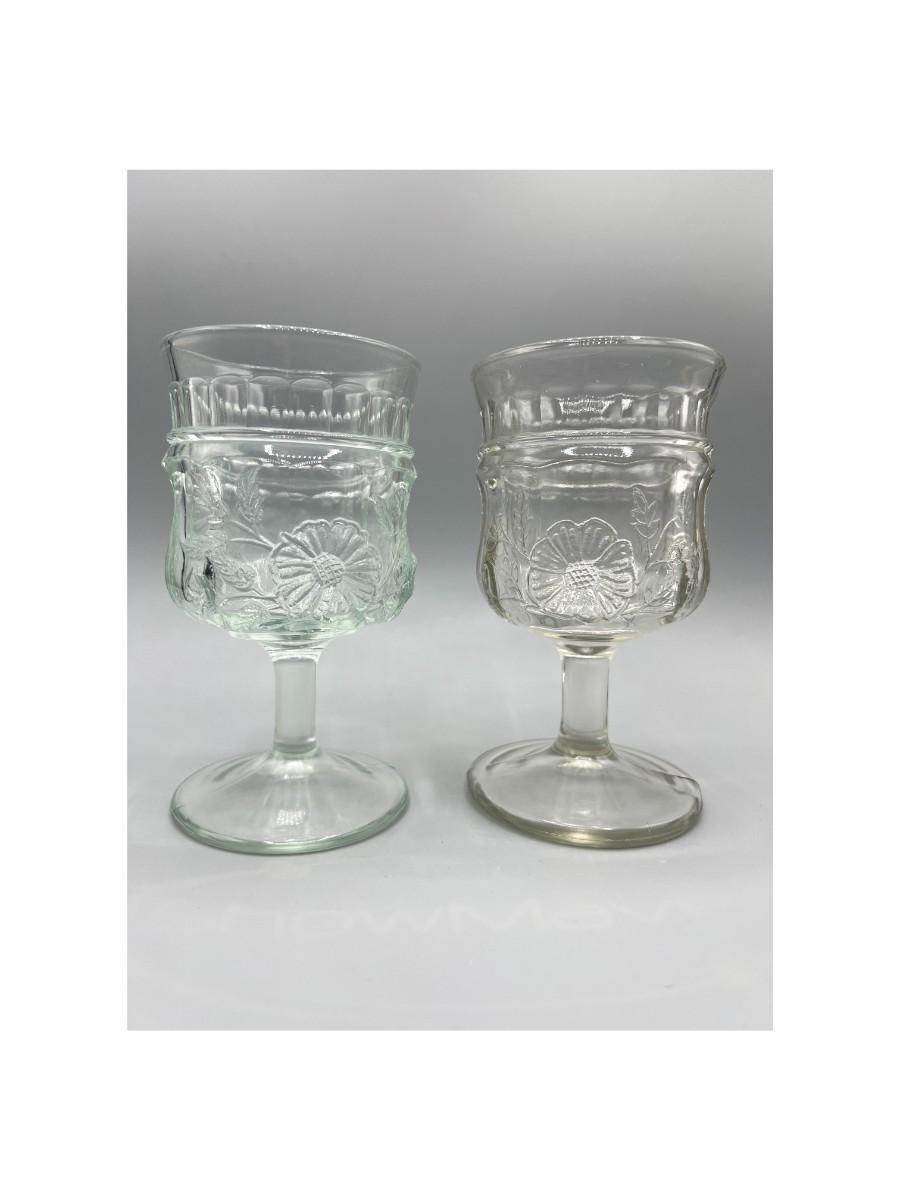 Pair of Flower Design Glass Drinking Goblets, there is no significant damage to the glass and is in good useable condition. Check pictures for more details and for sizing.
