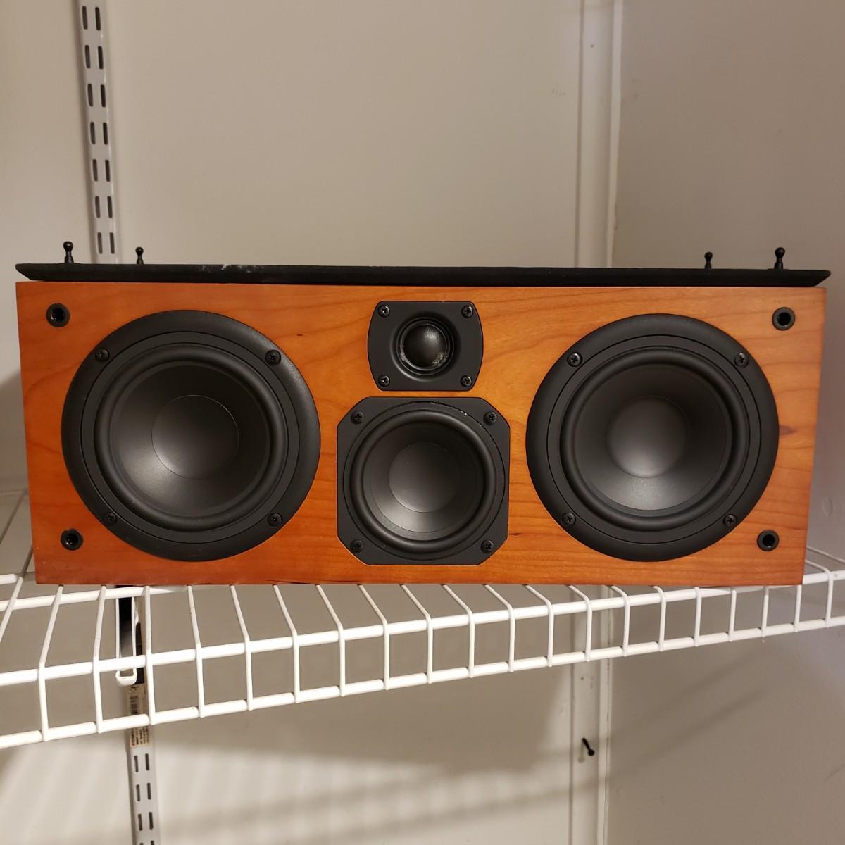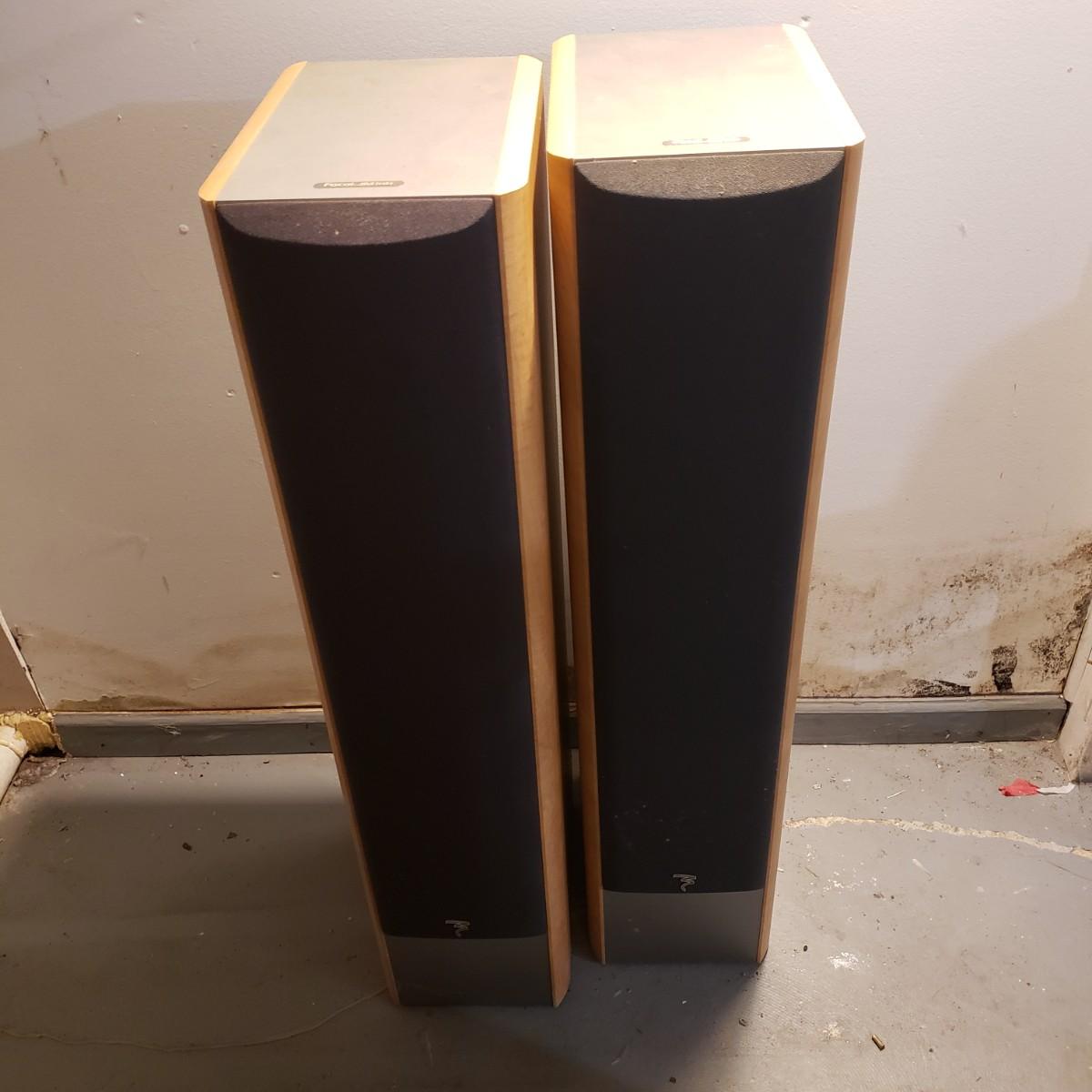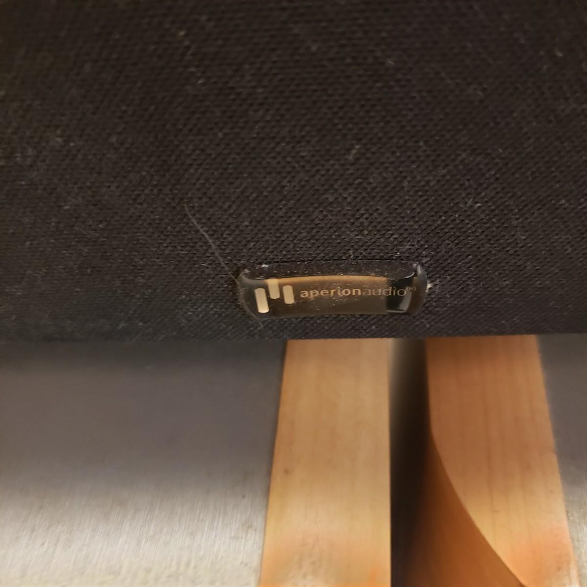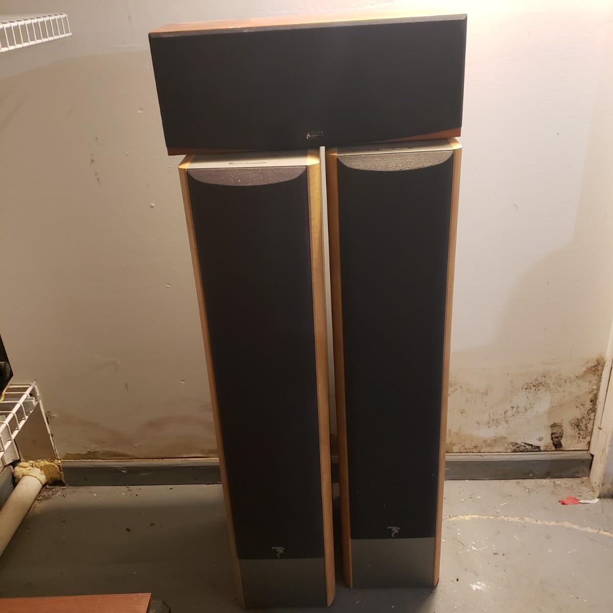 This lot features a pair of Focal.JM lab floor speakers and a Aperion center speaker. These three items have not been tested. The Focal.JMlab speakers measure 9" x 13" x 39"H. They have a light wood finish on the sides and a grey top. The Aperion 533-Vac center speaker has a vertical array. The speaker measures 19" x 9" x 8"H. It is a heavy speaker with a cherry finish. Instruction manual included.