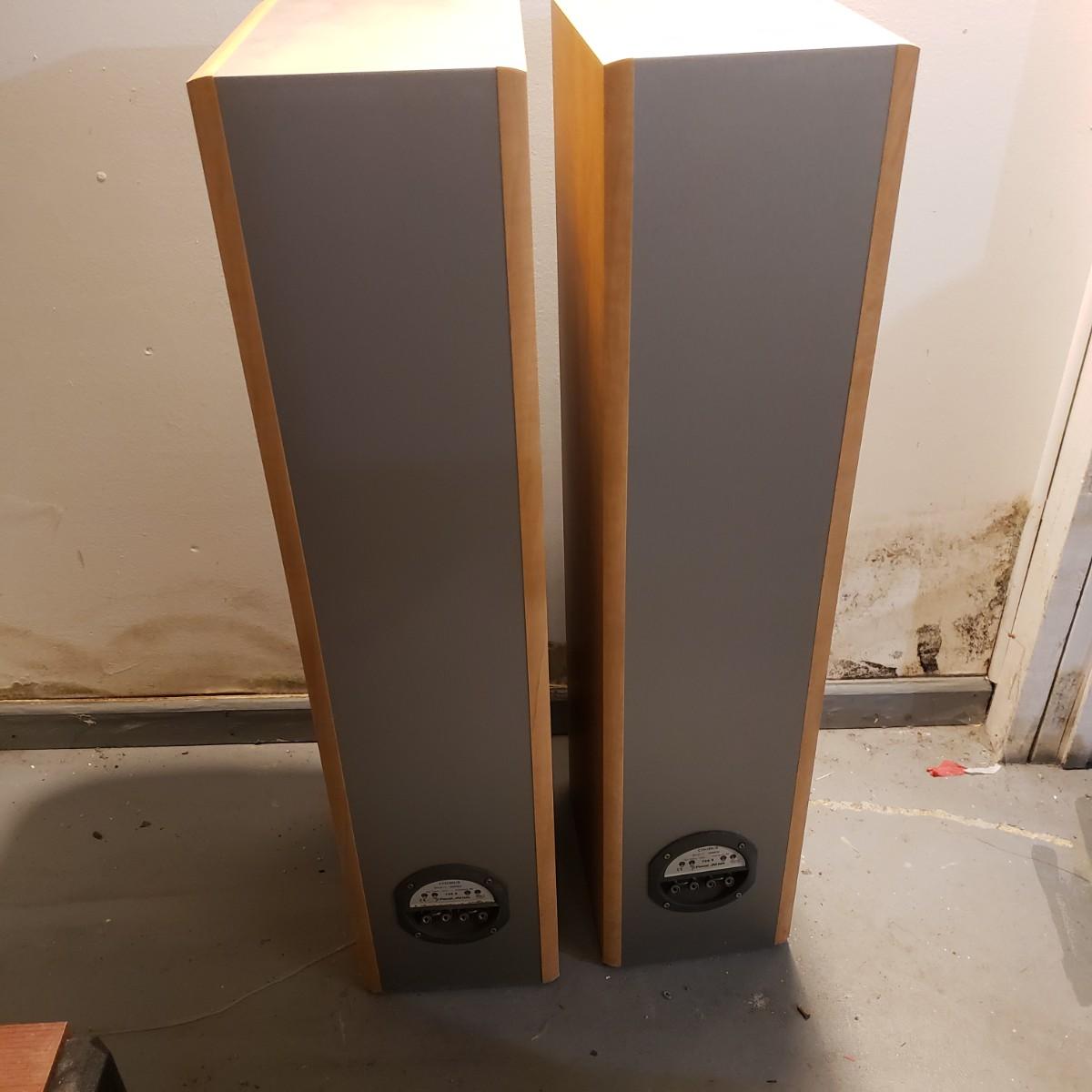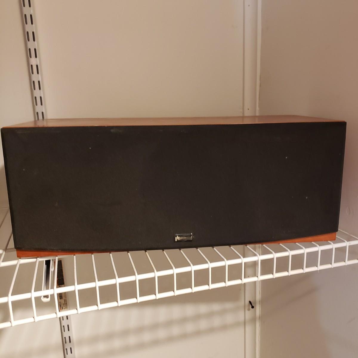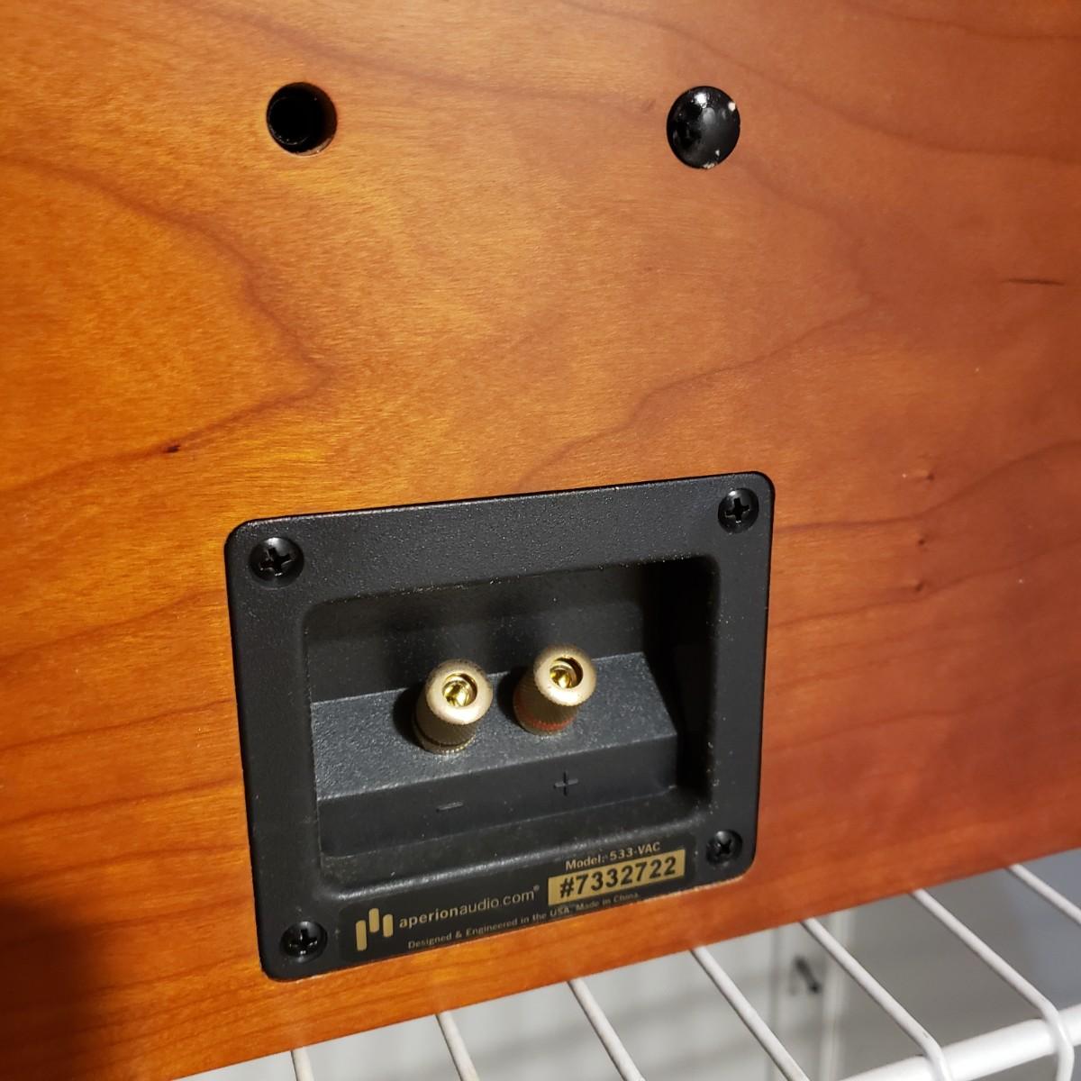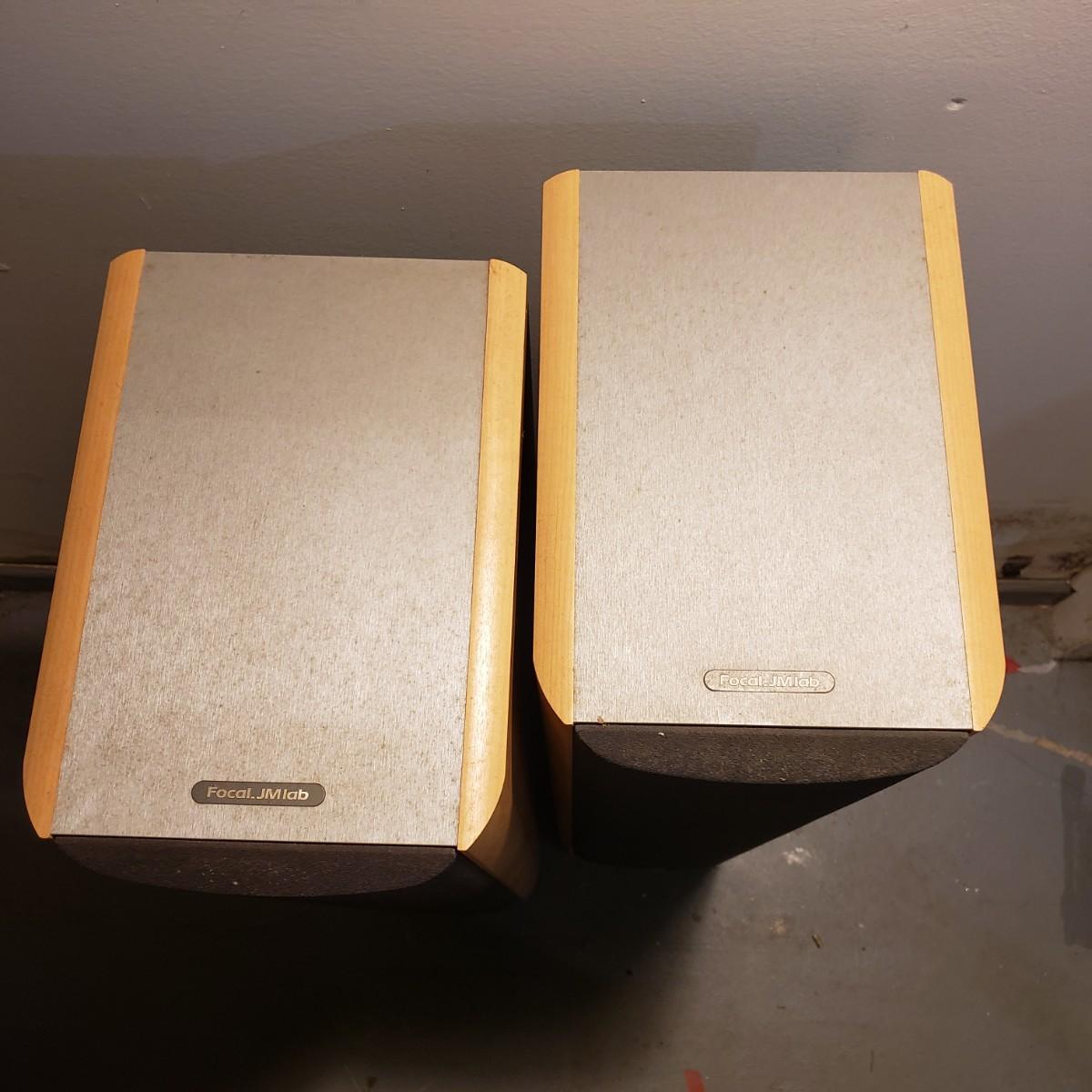 This lot features a pair of Focal.JM lab floor speakers and a Aperion center speaker. These three items have not been tested. The Focal.JMlab speakers measure 9" x 13" x 39"H. They have a light wood finish on the sides and a grey top. The Aperion 533-Vac center speaker has a vertical array. The speaker measures 19" x 9" x 8"H. It is a heavy speaker with a cherry finish. Instruction manual included.