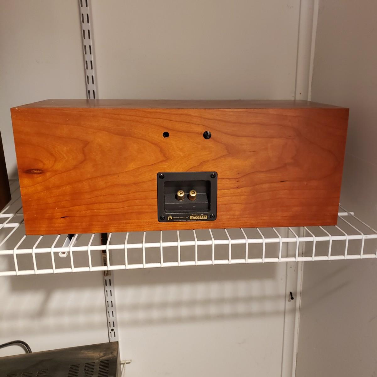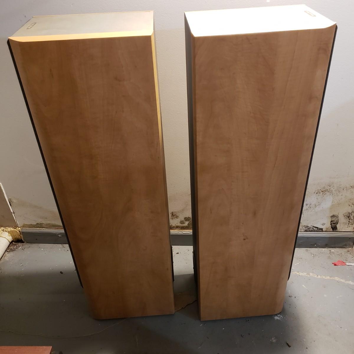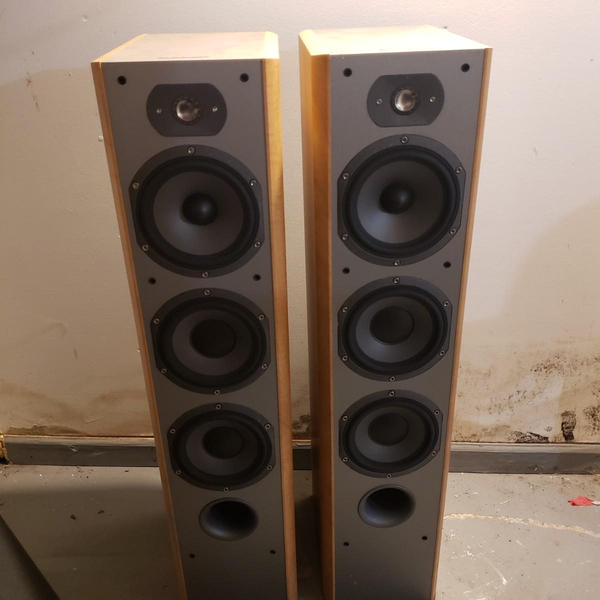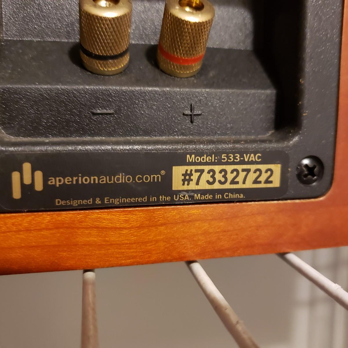 This lot features a pair of Focal.JM lab floor speakers and a Aperion center speaker. These three items have not been tested. The Focal.JMlab speakers measure 9" x 13" x 39"H. They have a light wood finish on the sides and a grey top. The Aperion 533-Vac center speaker has a vertical array. The speaker measures 19" x 9" x 8"H. It is a heavy speaker with a cherry finish. Instruction manual included.