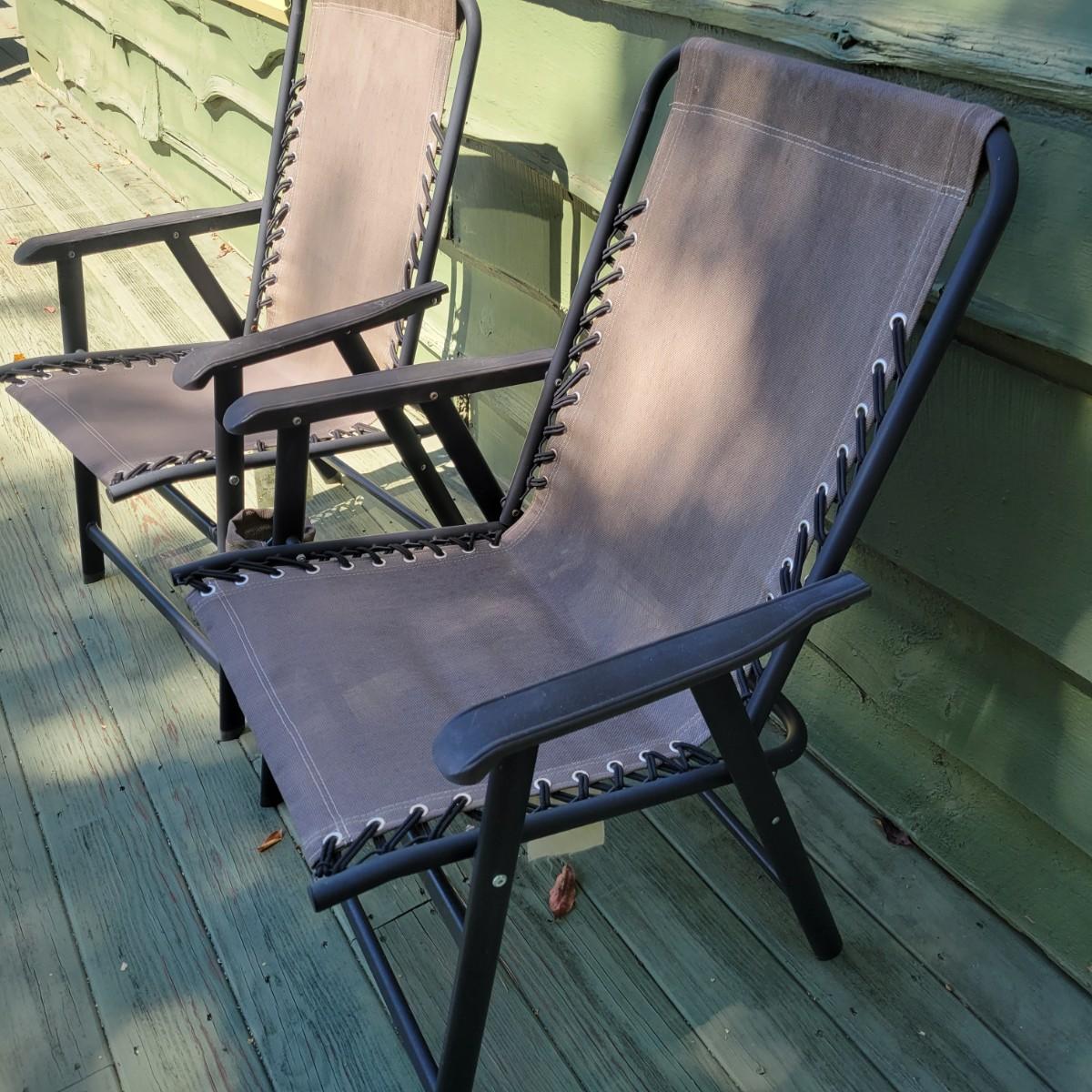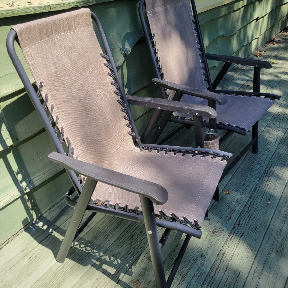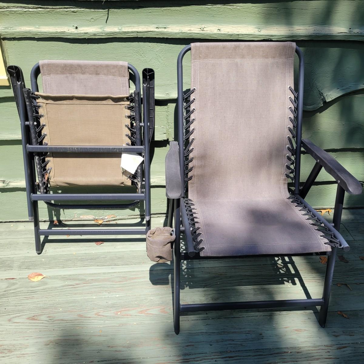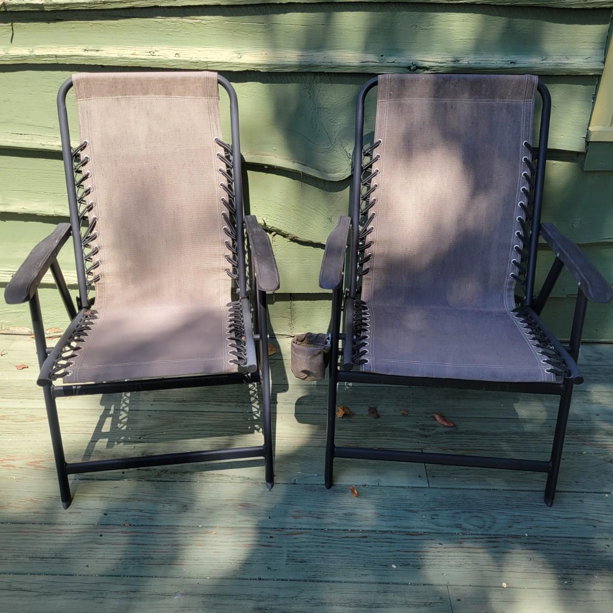 A pair of folding outdoor chairs in good condition, but they do show fading from being outside. These chairs feature fabric seats and backs supported by elastic rope for comfort. One chair even has a built in drink holder for an evening beverage. Chairs measure approximately 25.5" x 26" x 37" with a seat height of 16.5" Local pickup only