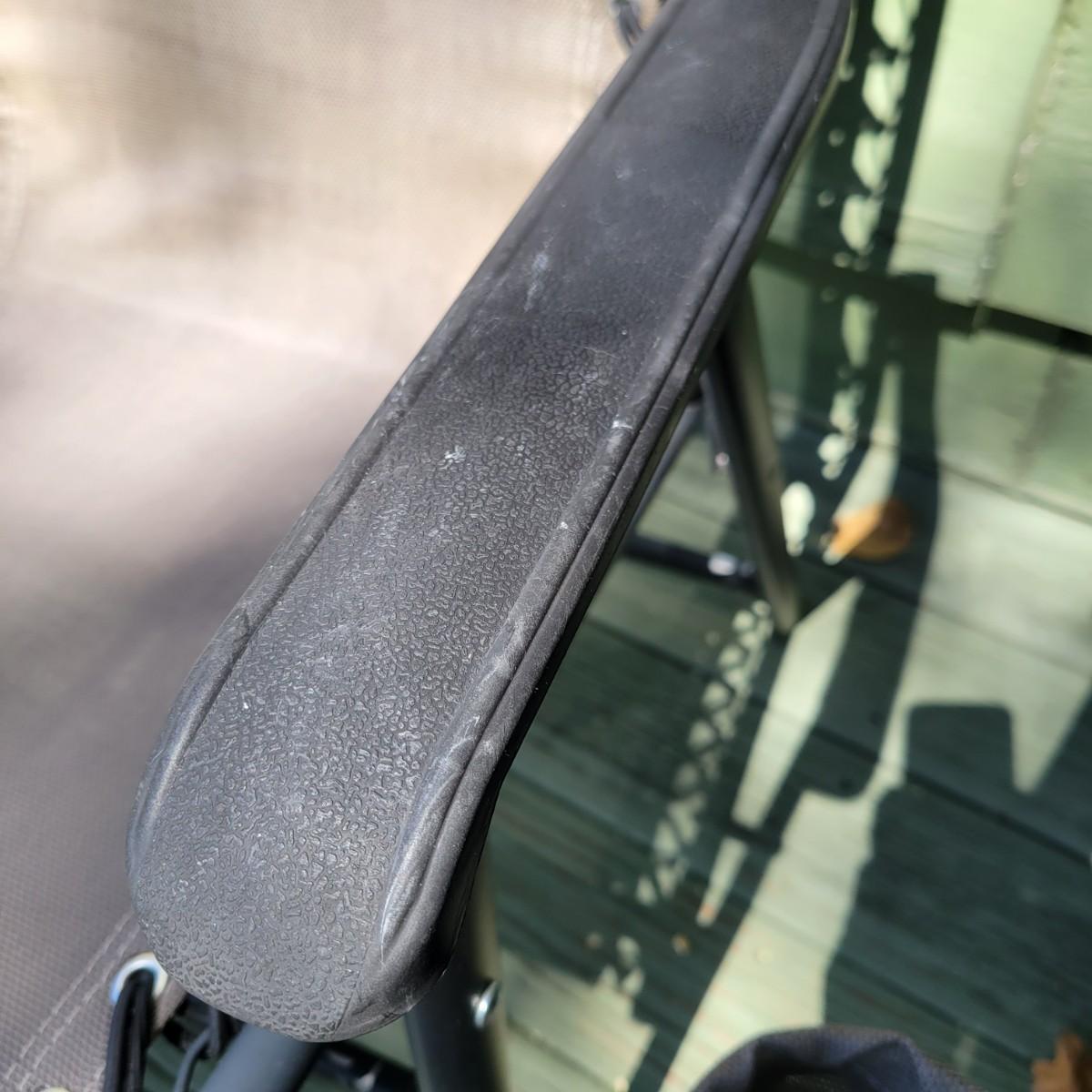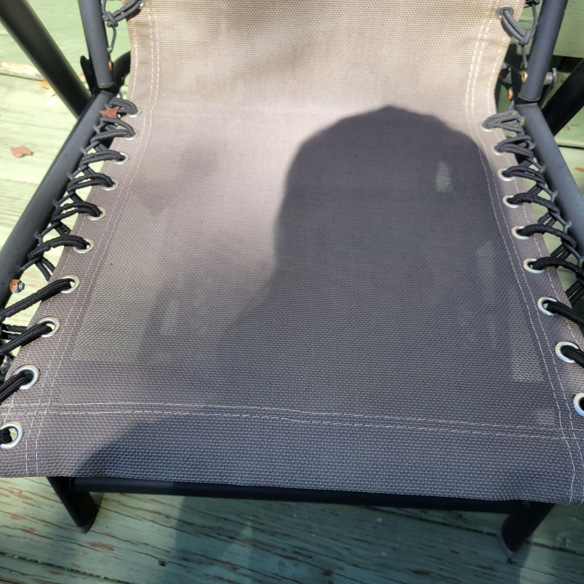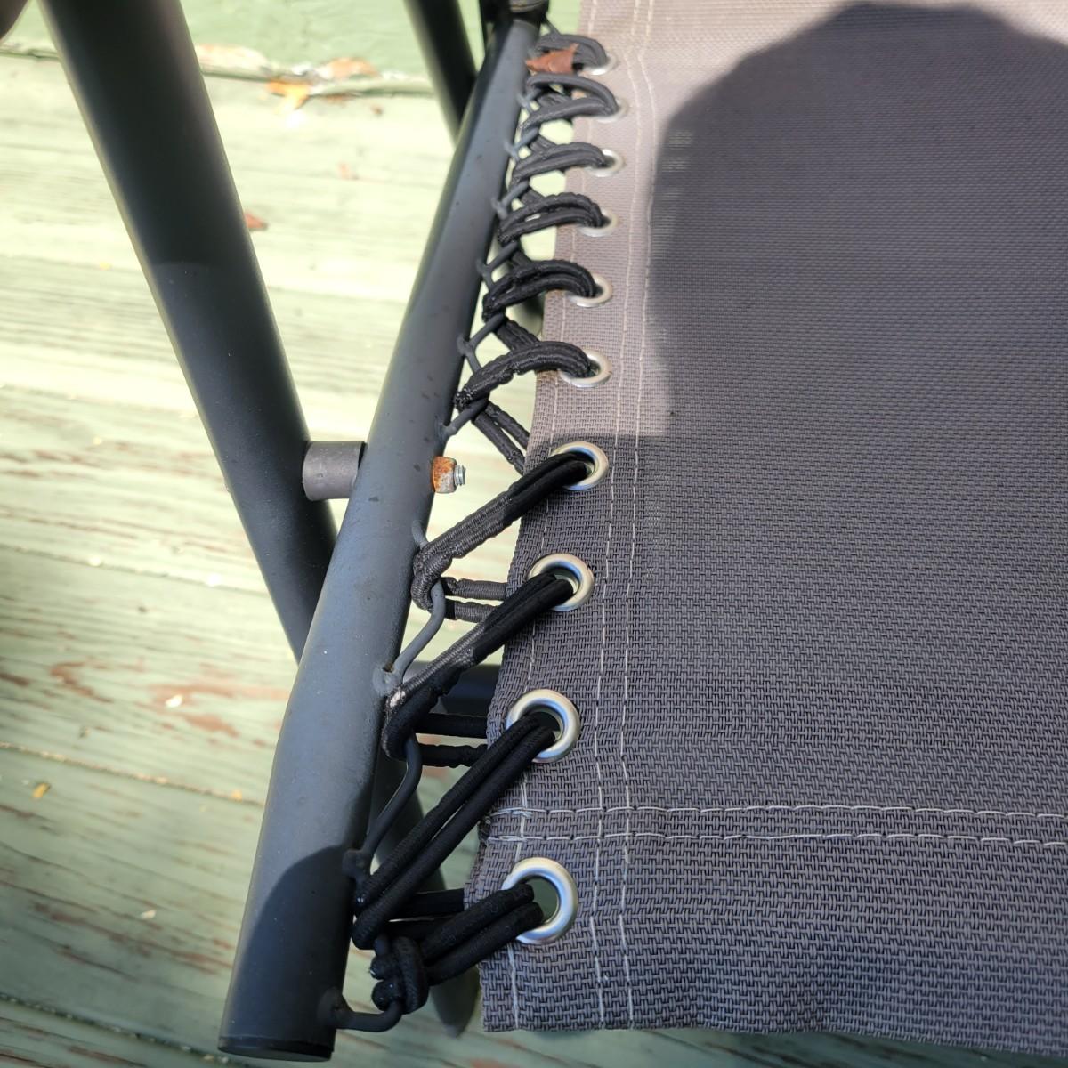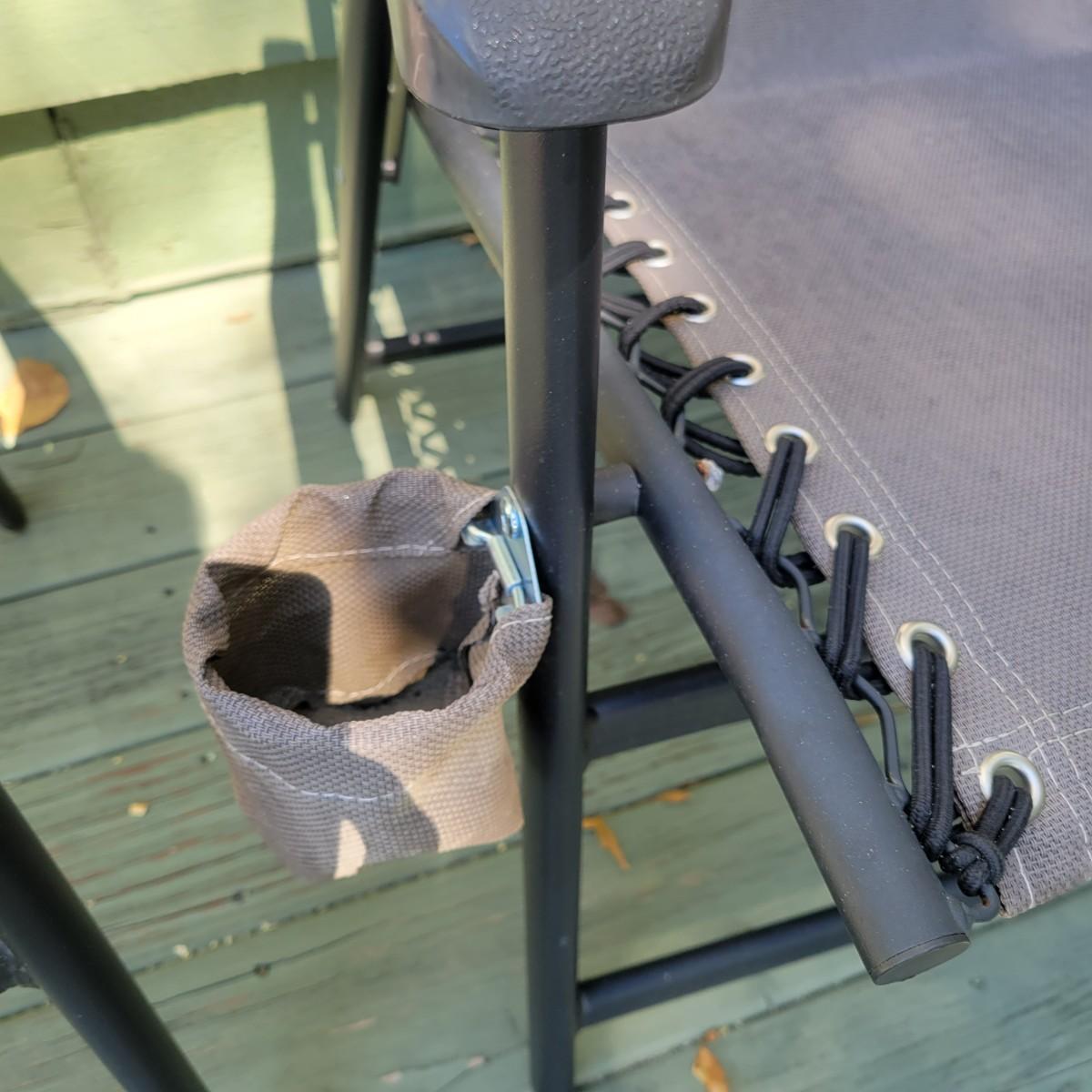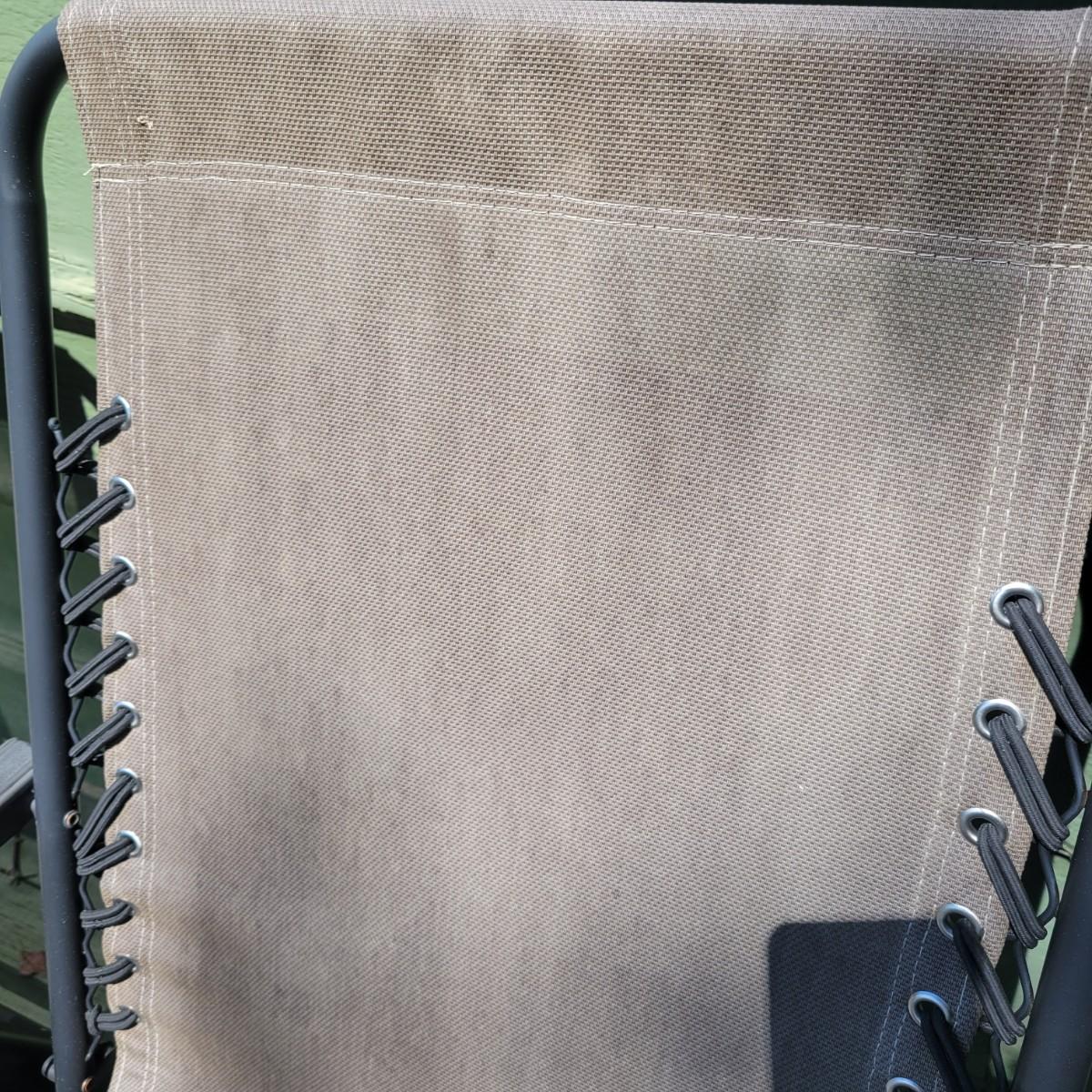 A pair of folding outdoor chairs in good condition, but they do show fading from being outside. These chairs feature fabric seats and backs supported by elastic rope for comfort. One chair even has a built in drink holder for an evening beverage. Chairs measure approximately 25.5" x 26" x 37" with a seat height of 16.5" Local pickup only