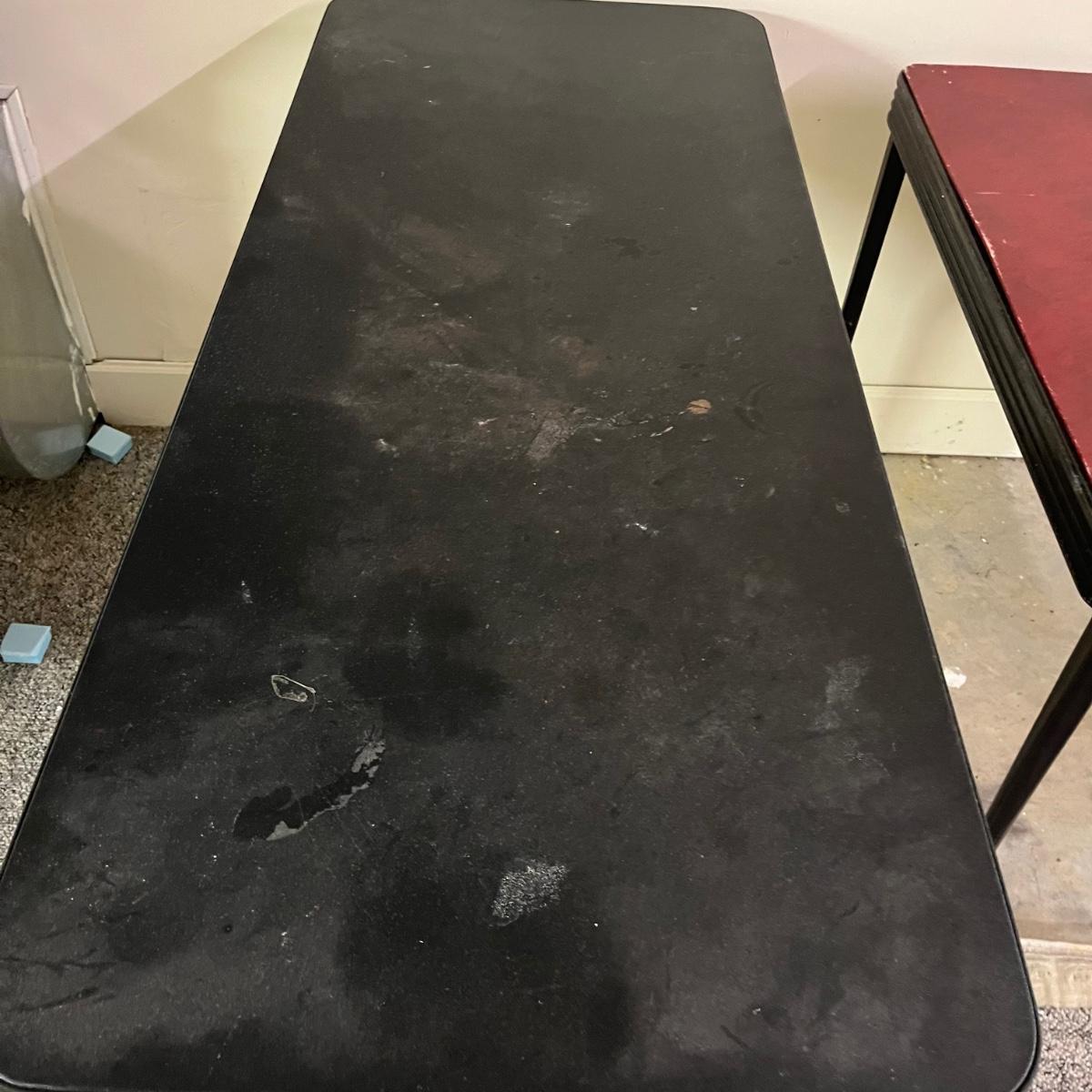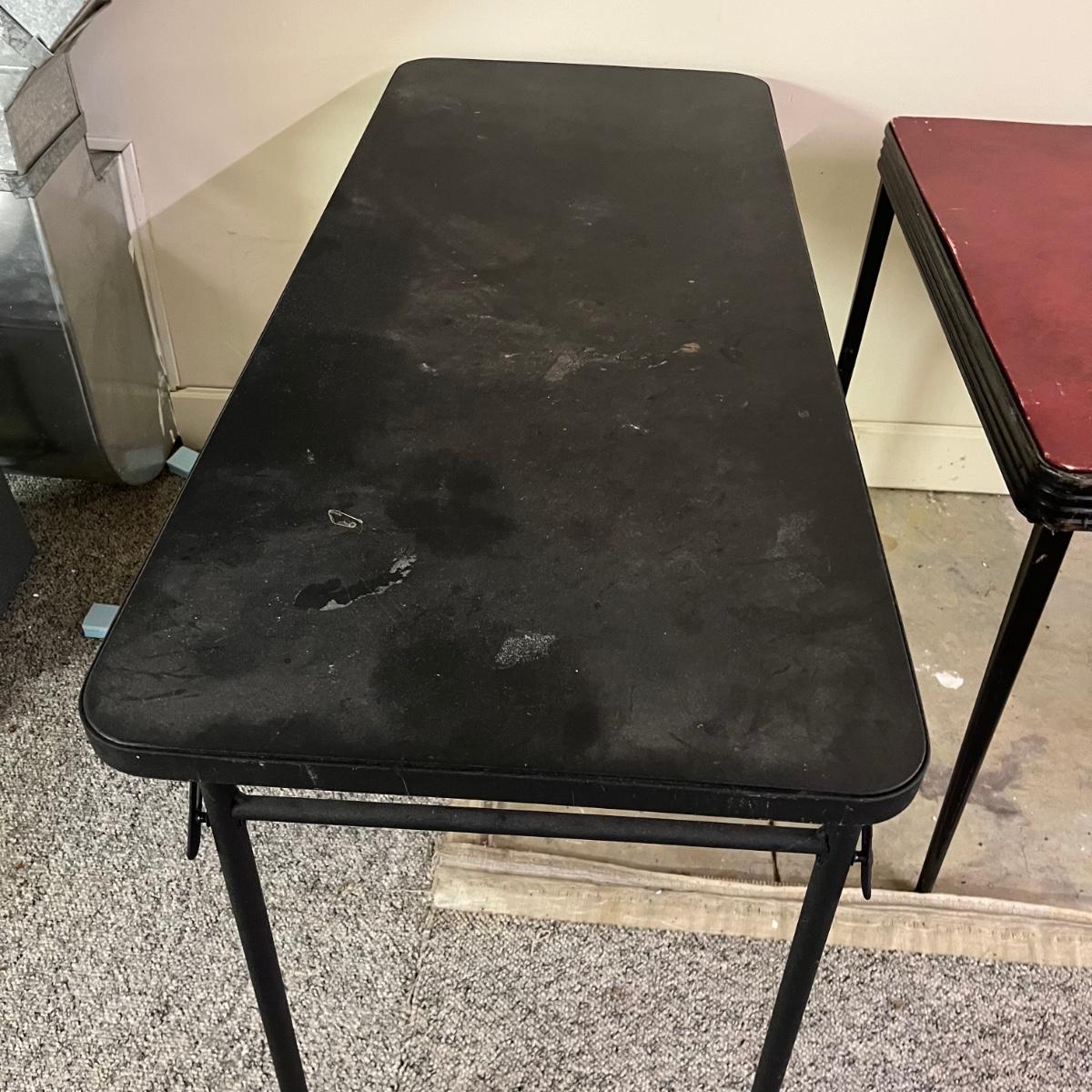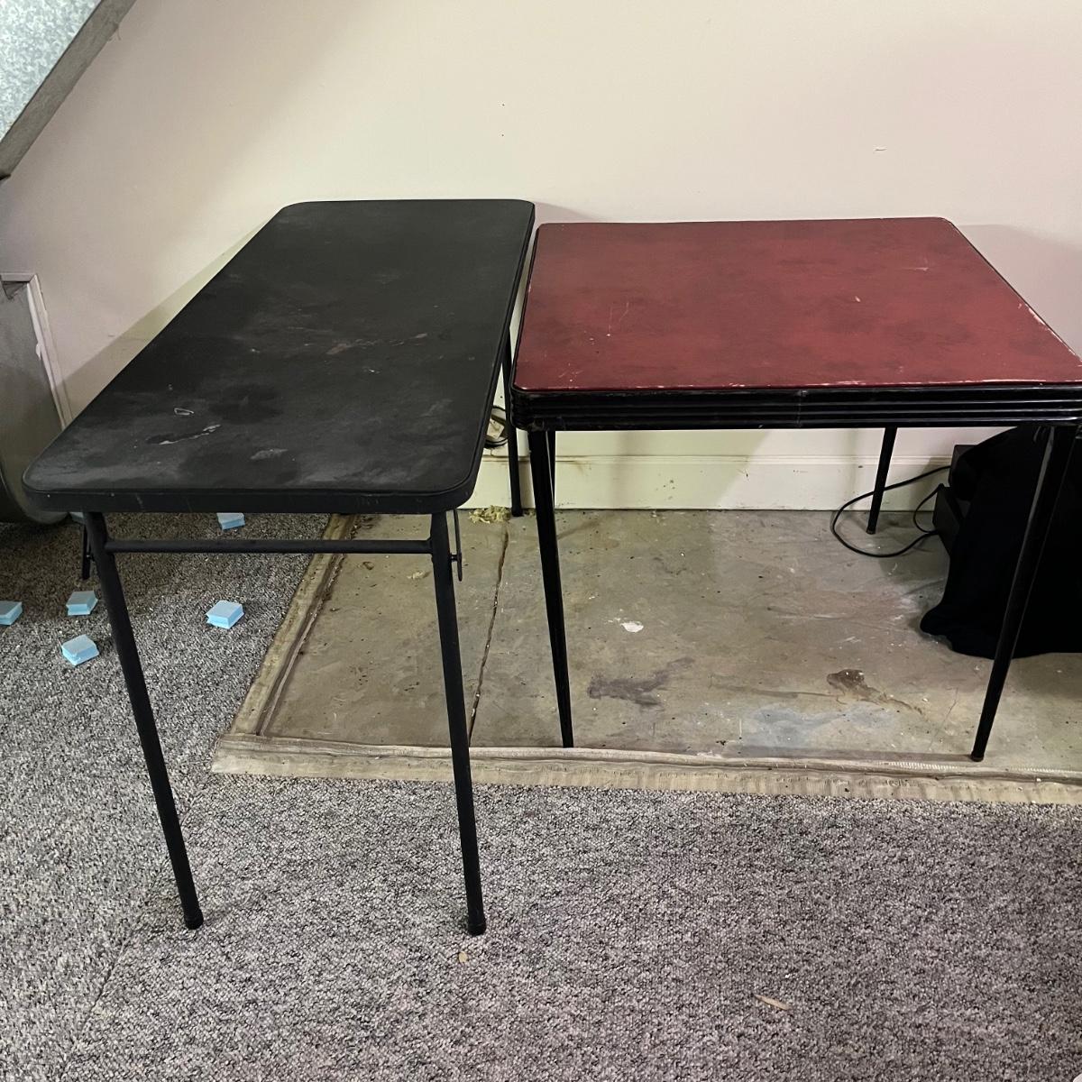 Lot includes a square folding table and a rectangular folding table that measures 20” x 48” x 28.5”. Both have minor wear and tear, see images.