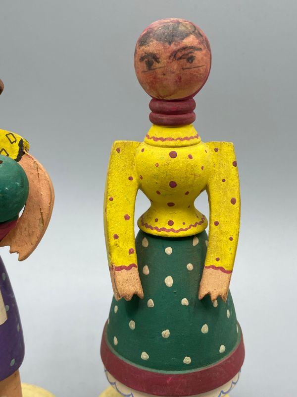 Pair of folk art ladies. Colorfully painted wood figures. Origins unknown. Stand about 6.5" tall.