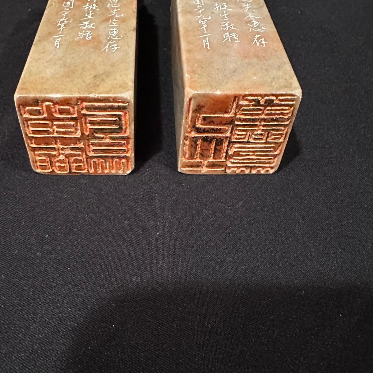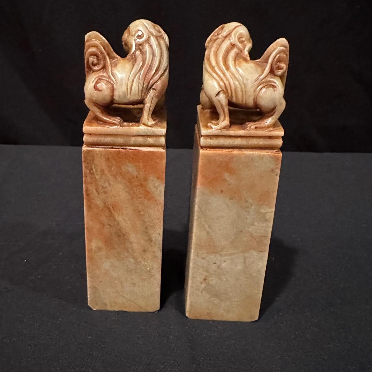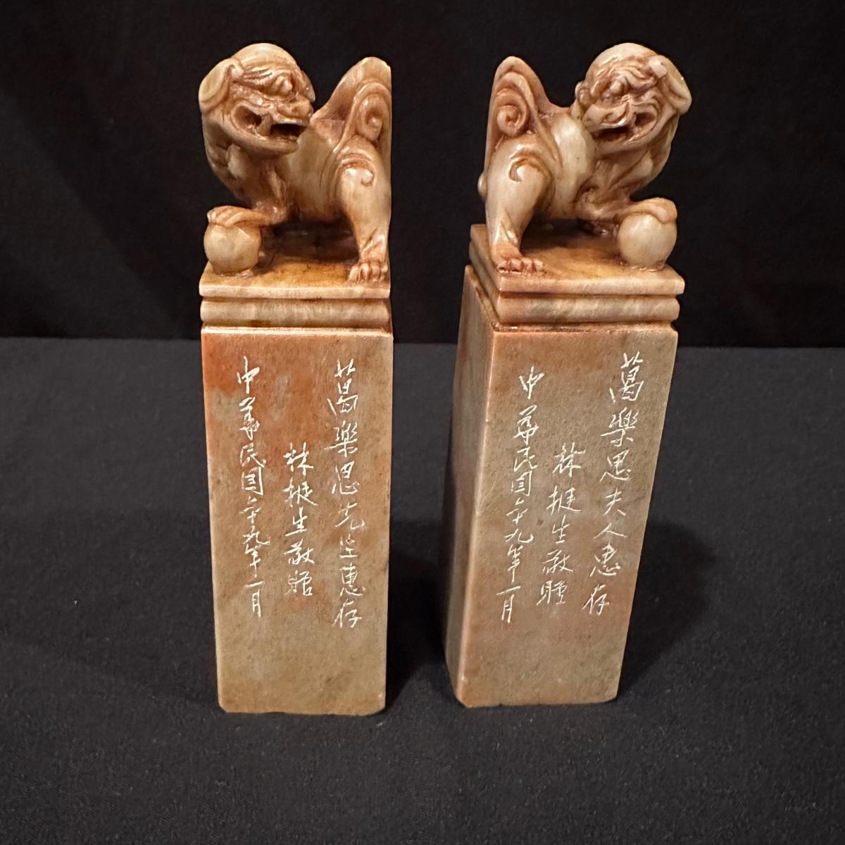 Pair of soapstone Foo Dogs that measures 1" x 1" x 4.5” H. Ornate hand fan measures 11”H. Wooden stand not included. Shipping available.