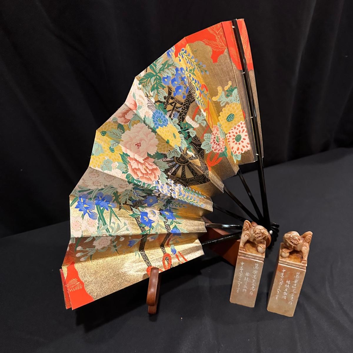 Pair of Soapstone Foo Dogs & Ornate Decorative Hand Fan (SR-KL)