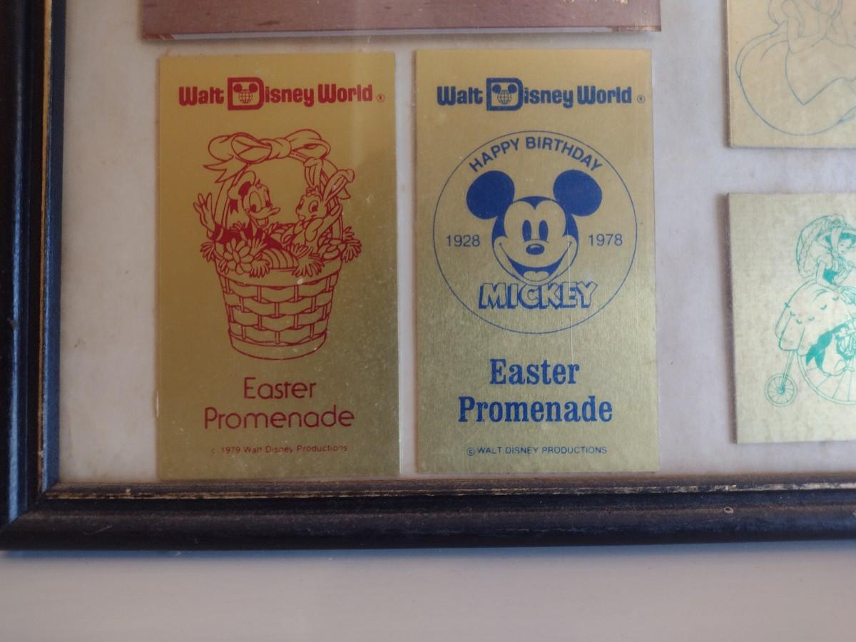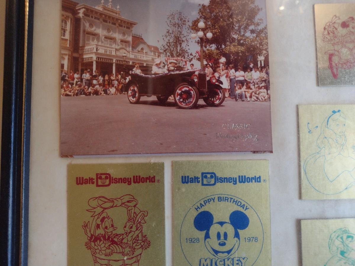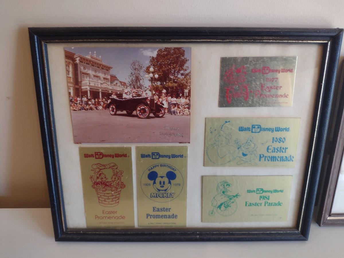 Pair of Framed Antique Car Registration and Medal Vehicle Identifier Tag and Disney Parade Memorabilia