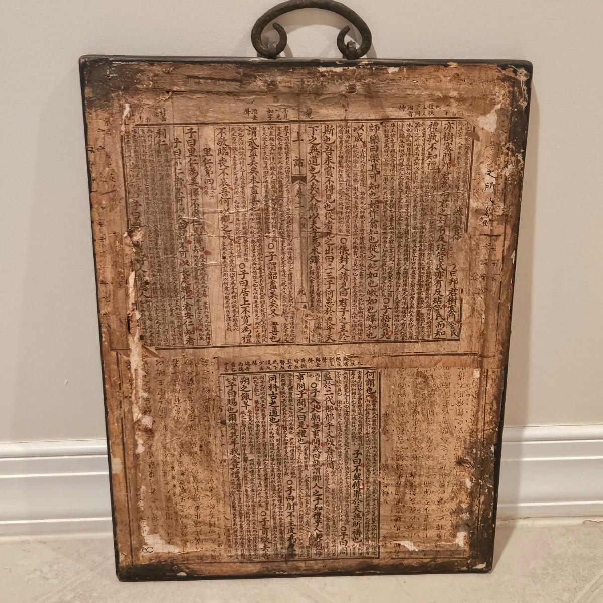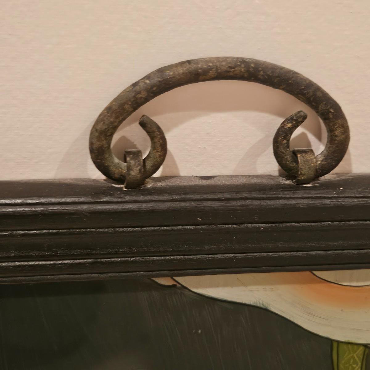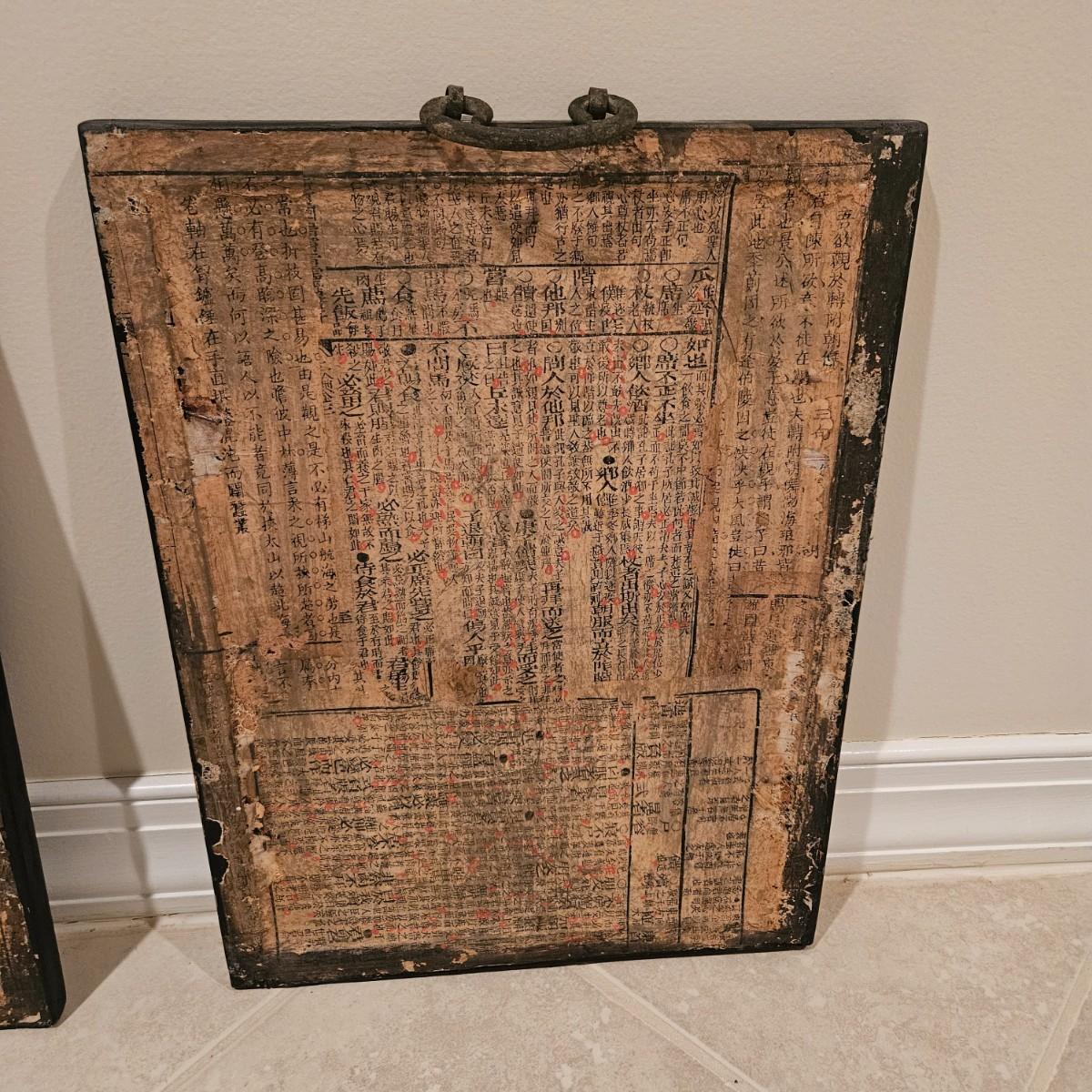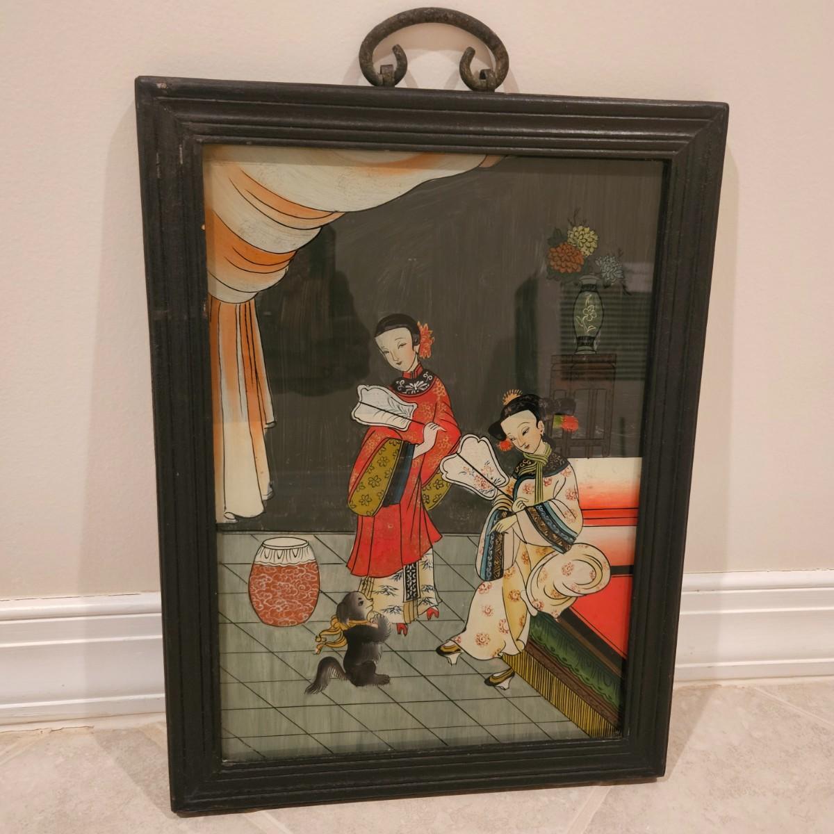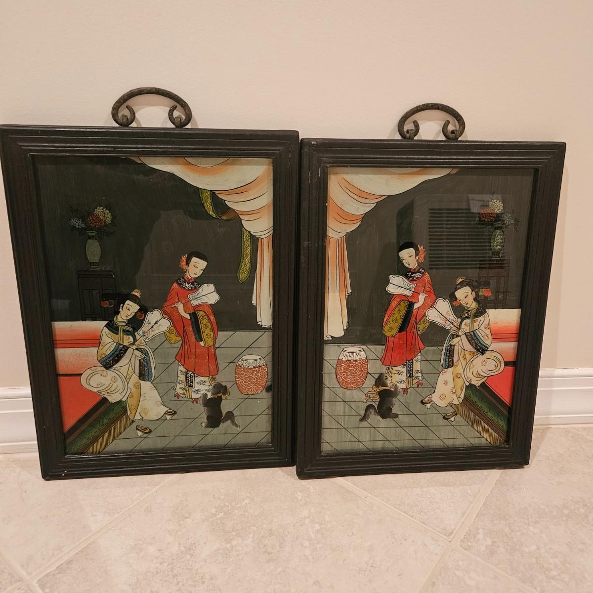 A pair of framed Asian prints that appear to be Japanese. They have solid wood frames with a black finish and iron hanging rings on their tops. They appear to be reverse images painted on the backside of the glass. Each piece measures approximately 12" x 17"H. Shipping available