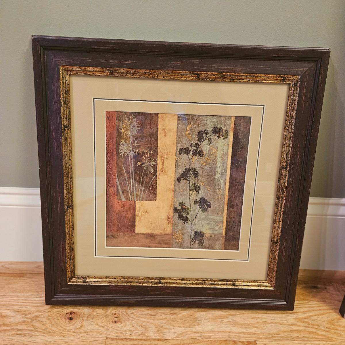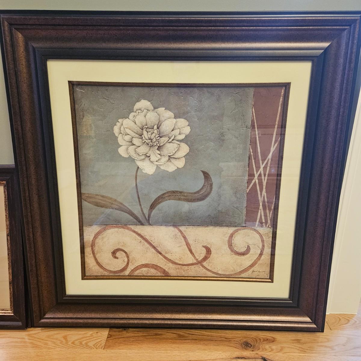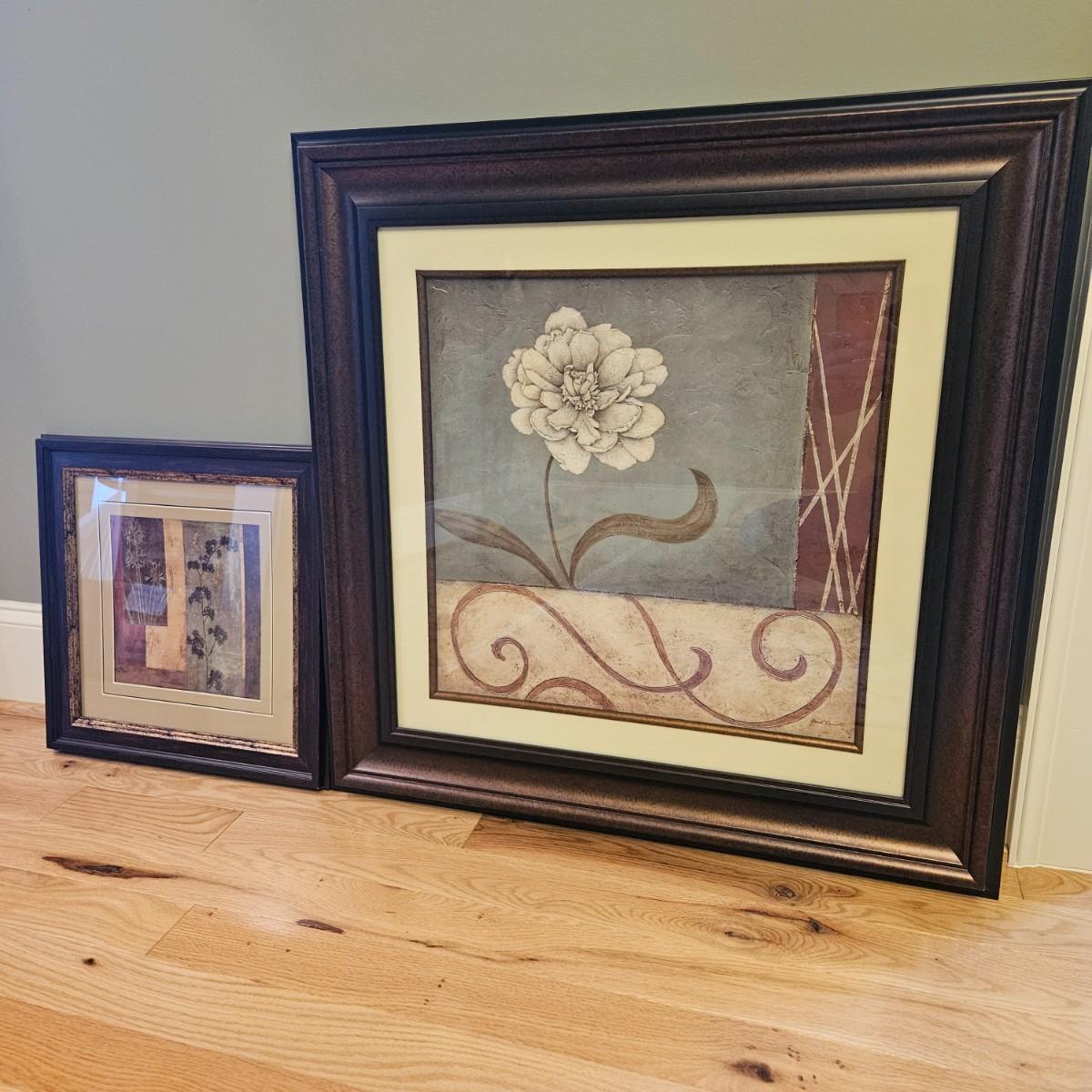 A pair of framed, contemporary floral prints. The largest piece measures approximately 31.5" x 31.5"H. It has a single mat with an interior fillet and bronze colored frame that appears to be high density Styrofoam. The smaller piece has a single mat with a French line and a distressed wooden frame with a gold lip and dark brown stain. Shipping available