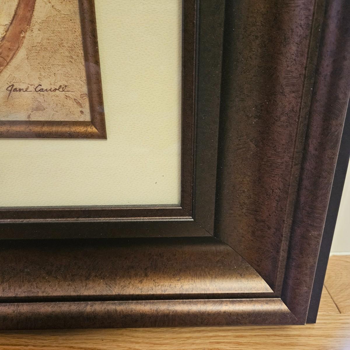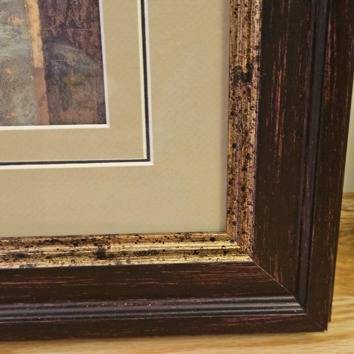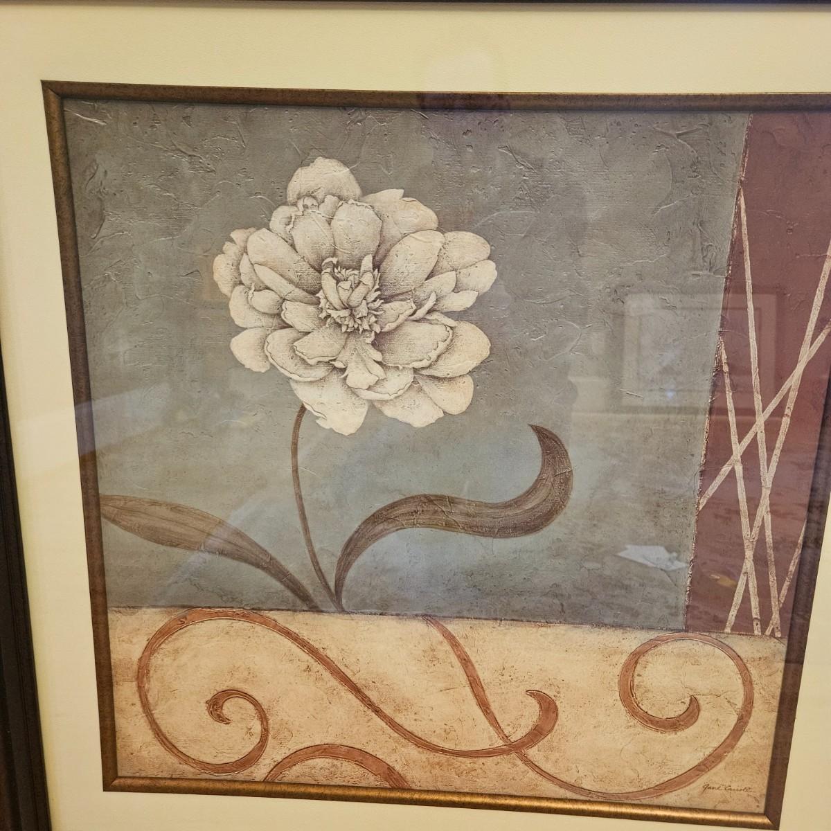A pair of framed, contemporary floral prints. The largest piece measures approximately 31.5" x 31.5"H. It has a single mat with an interior fillet and bronze colored frame that appears to be high density Styrofoam. The smaller piece has a single mat with a French line and a distressed wooden frame with a gold lip and dark brown stain. Shipping available
