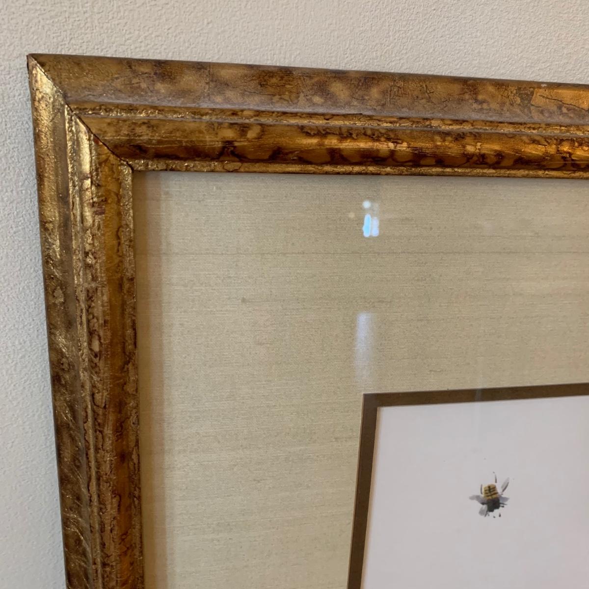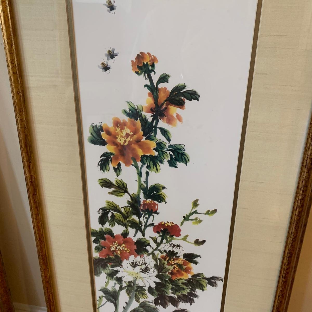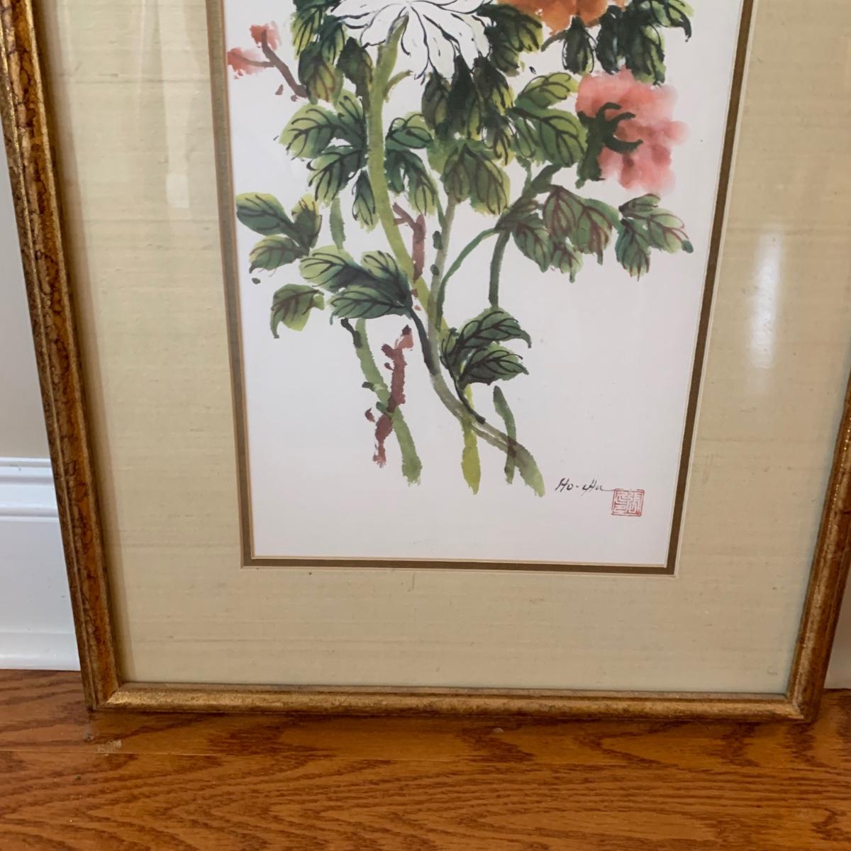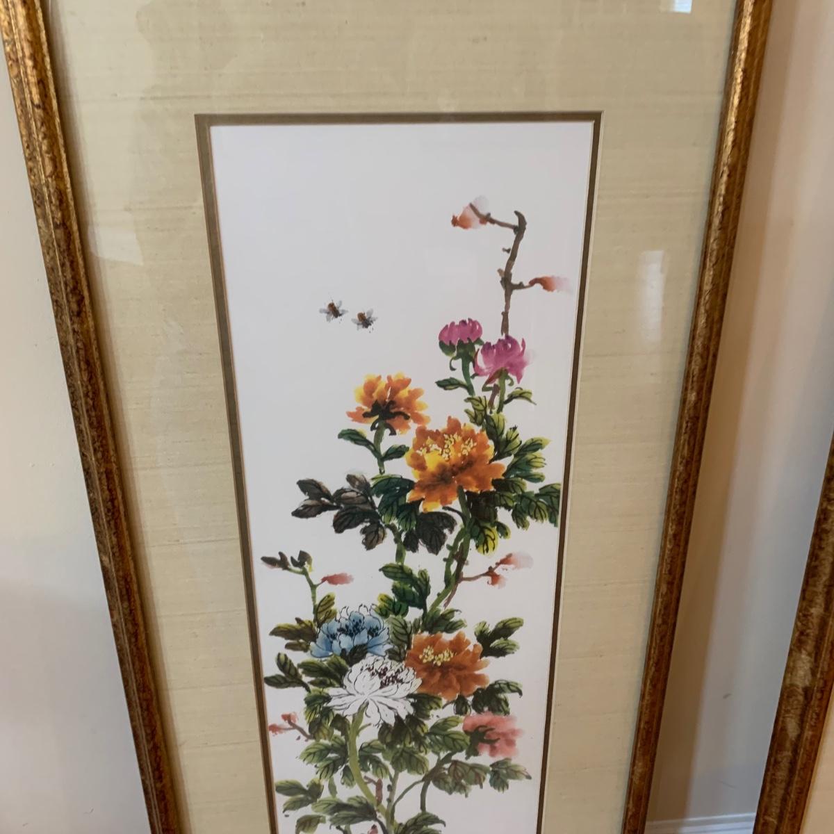 Two fine art prints of flower paintings by artist Ho Chu in giltwood frames. Prints are framed with double matting and behind glass. They are each 18” x 38”.