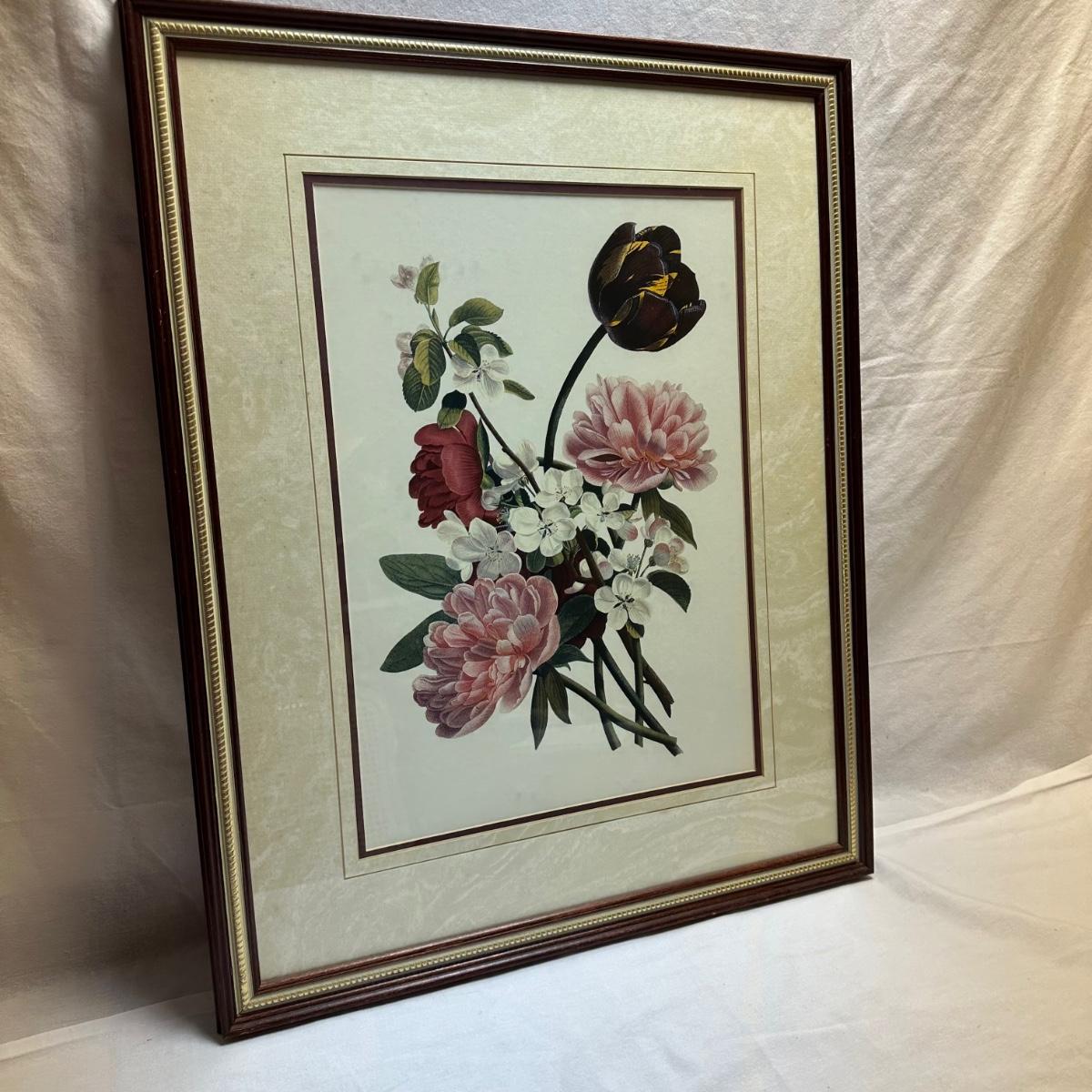 Pair of matted and framed floral prints. Each measures 24” X 30.5”H. Shipping available. Shipping art can be costly. We suggest contacting our preferred local shipping provider, Postage Express, with dimensions and getting an estimate before bidding: (828) 670-5501 or postageexpress@yahoo.com.