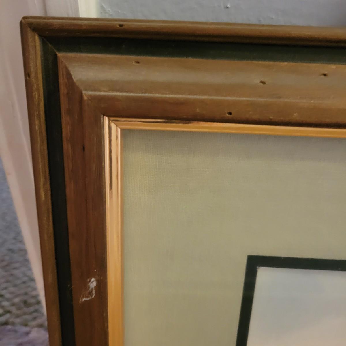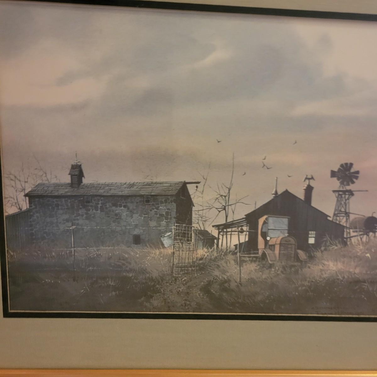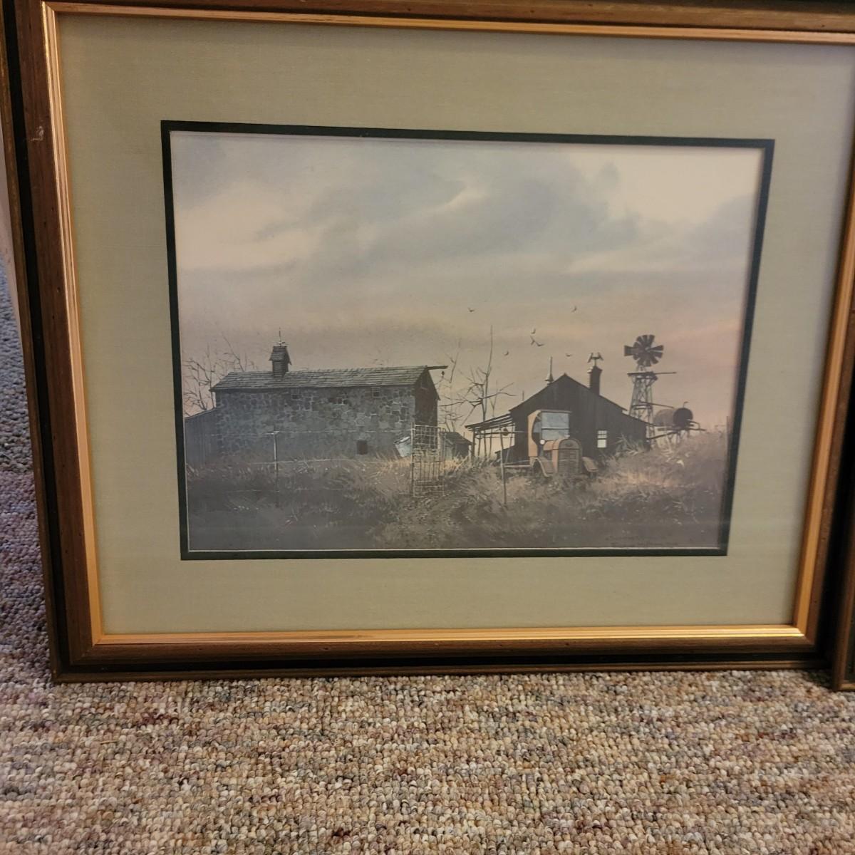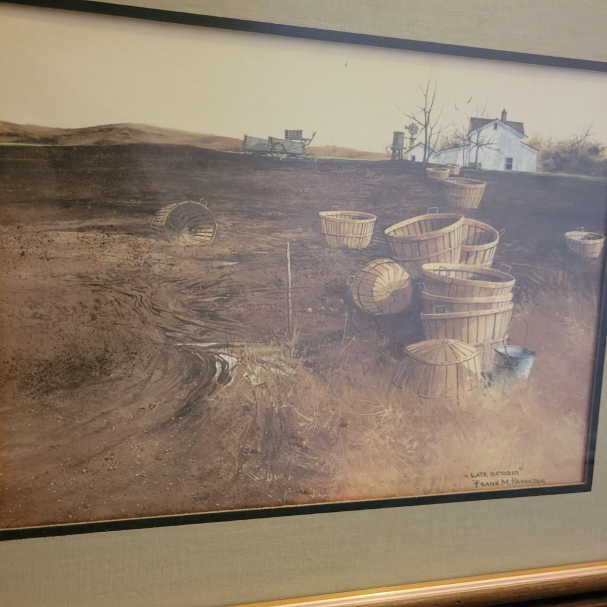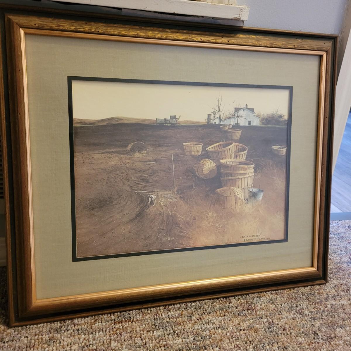 A pair of framed prints by Frank M. Hamilton titled "Late October" and "Summer Evening" that depict farm landscapes. They are double matted with distressed wooden frames with gold lips. They measure approximately 22.5" x 18.5"H. Shipping available. Shipping can be costly. We suggest contacting our preferred local shipping provider, Postage Express, with dimensions and getting an estimate before bidding: (828) 670-5501 or postageexpress@yahoo.com.