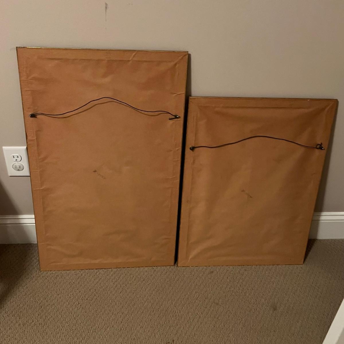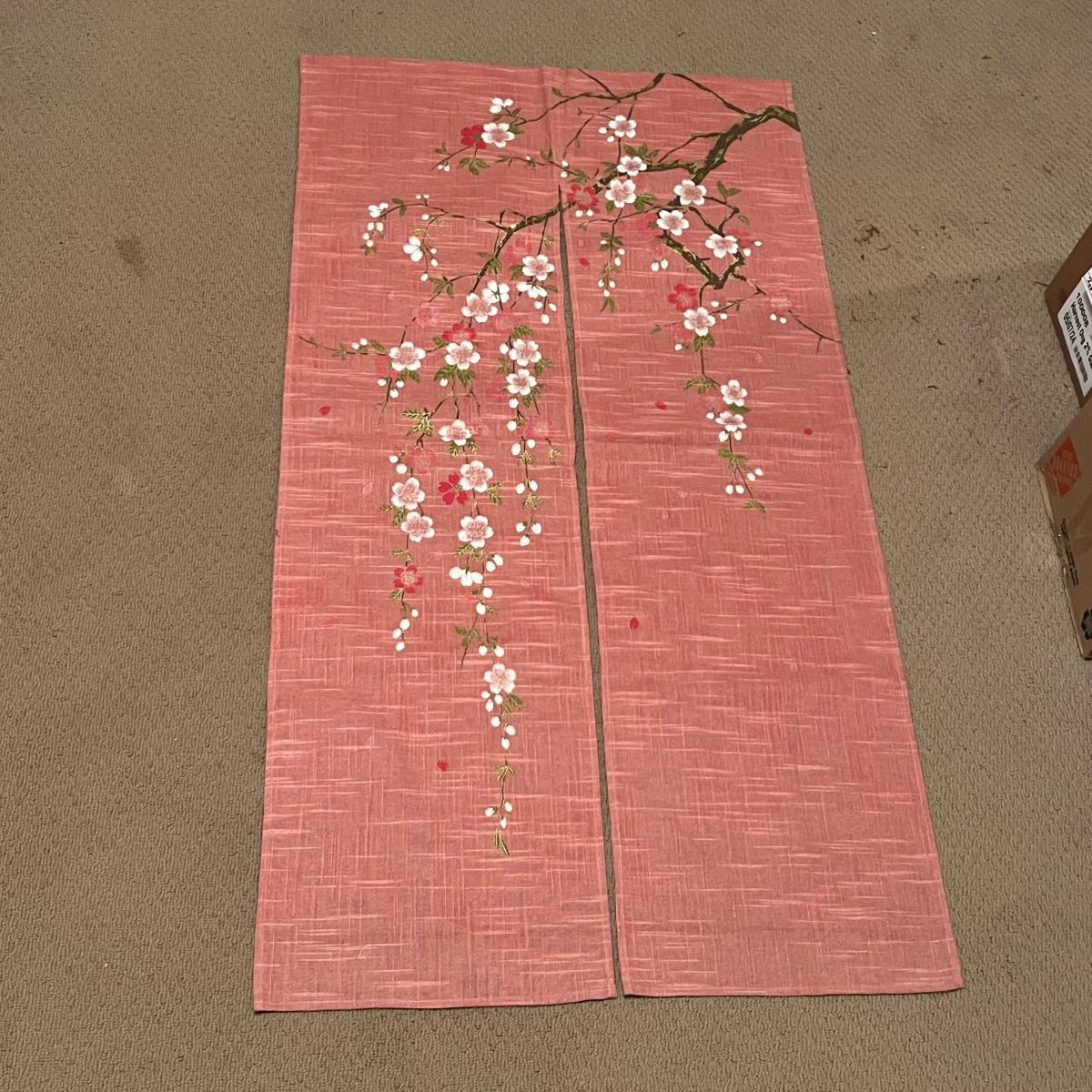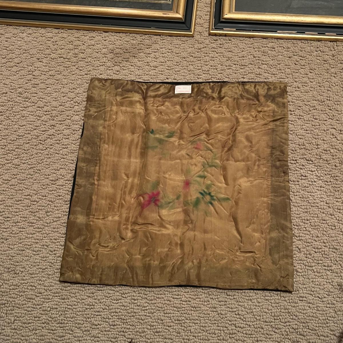 These two framed pieces of art are under glass and appear to be rubbings as they have a raised/embossed texture. They are mounted in matching black/dark gold painted wood frames; note the taller frame which measures 19” x 30”H has some paint missing. The linen door curtain features a printed floral design and has a pocket for a rod; measures 32” x 60”H. The small silk panel has some water damage marks, see image.