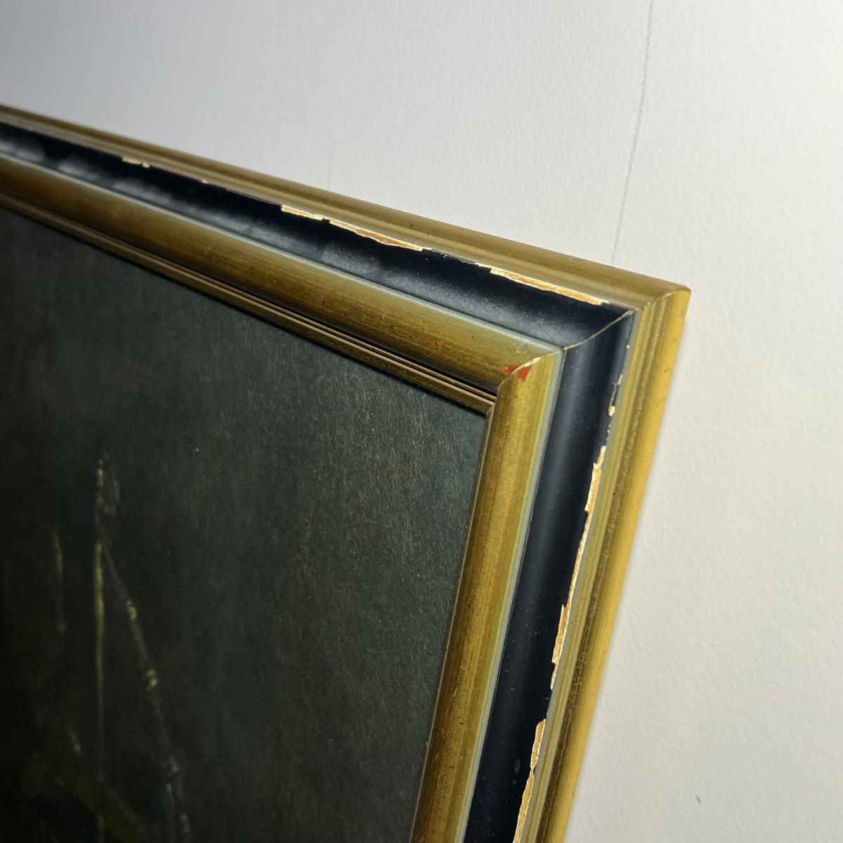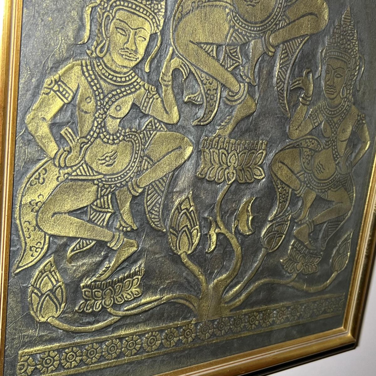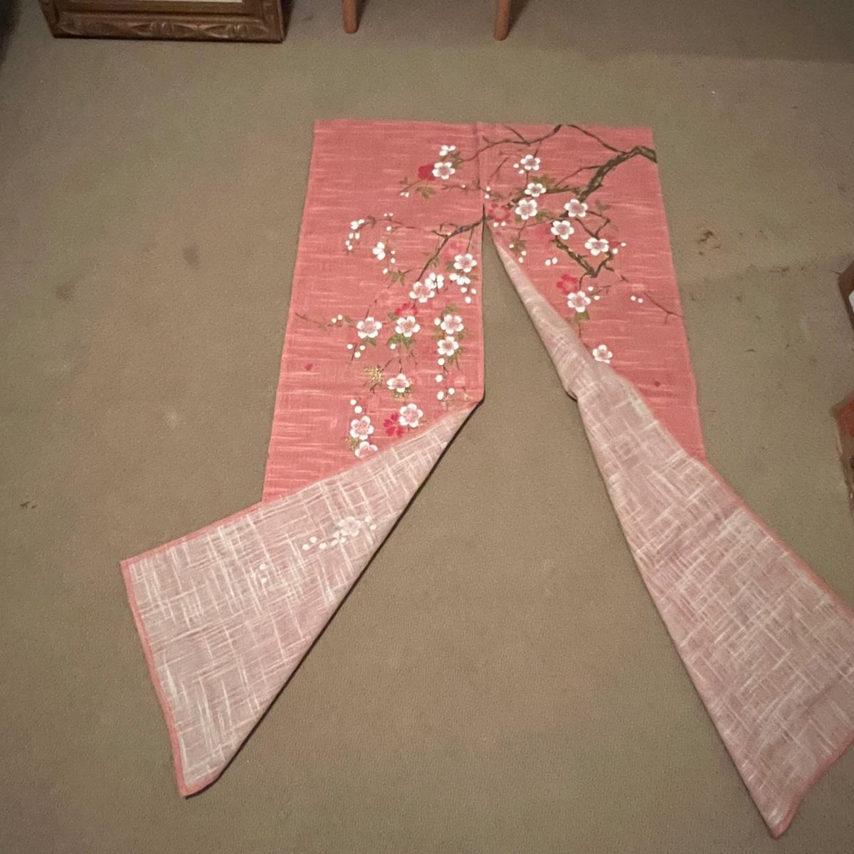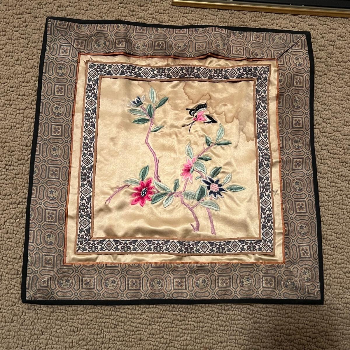 These two framed pieces of art are under glass and appear to be rubbings as they have a raised/embossed texture. They are mounted in matching black/dark gold painted wood frames; note the taller frame which measures 19” x 30”H has some paint missing. The linen door curtain features a printed floral design and has a pocket for a rod; measures 32” x 60”H. The small silk panel has some water damage marks, see image.