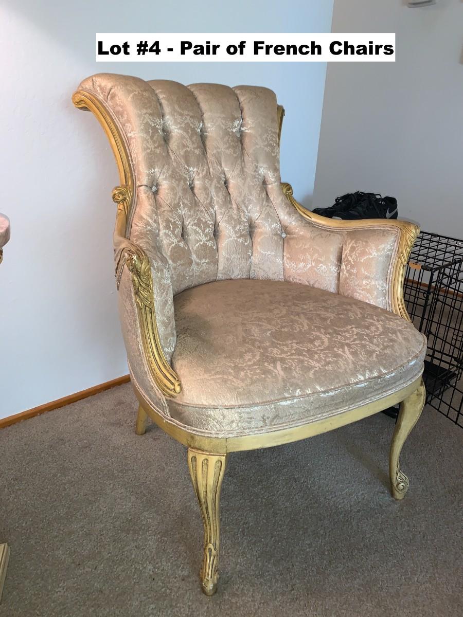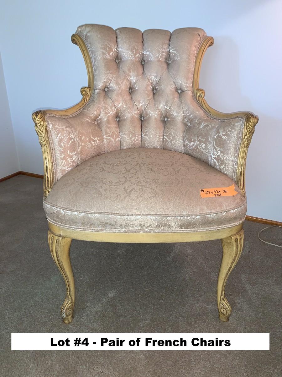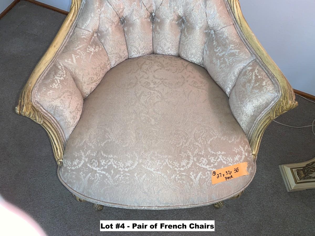 Pair of French Provincial style upholstered and tufted parlor chairs. See photos for stains.