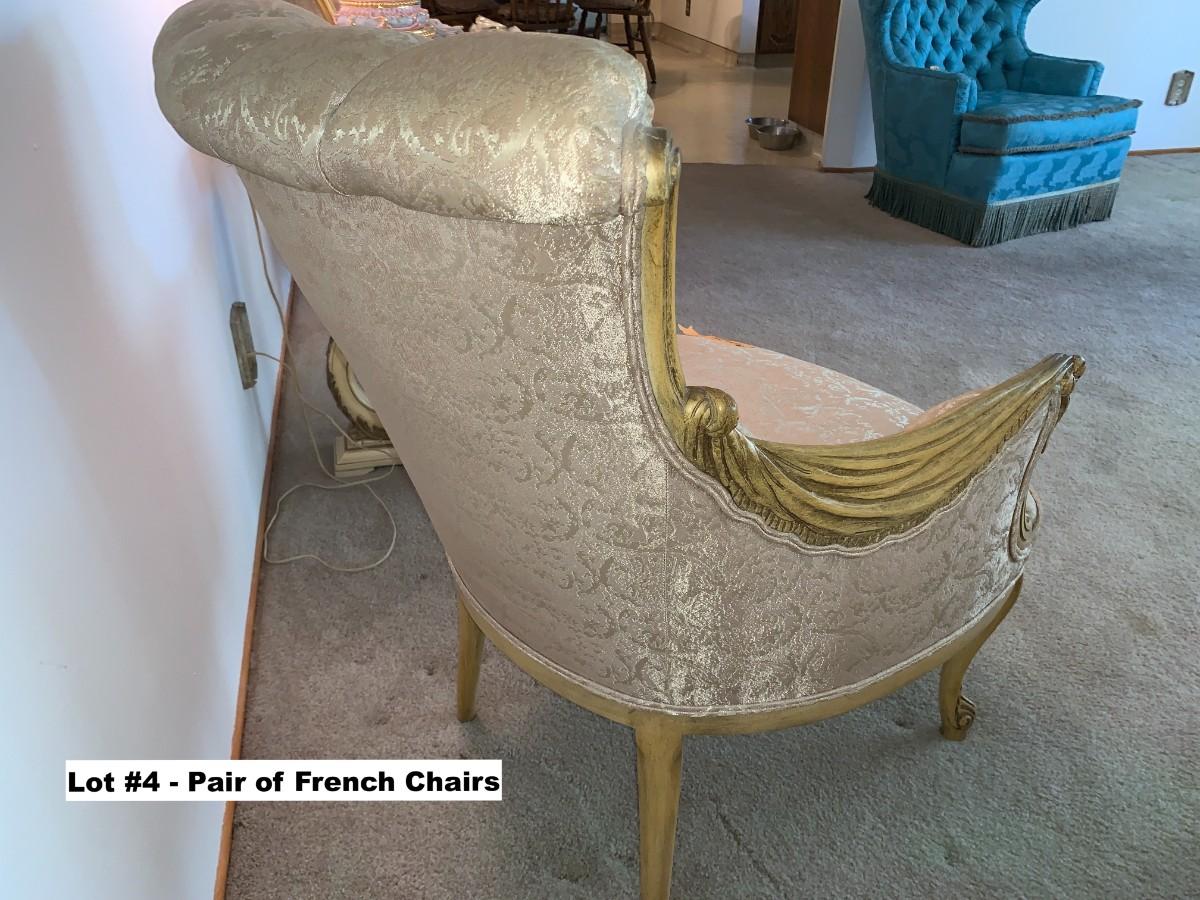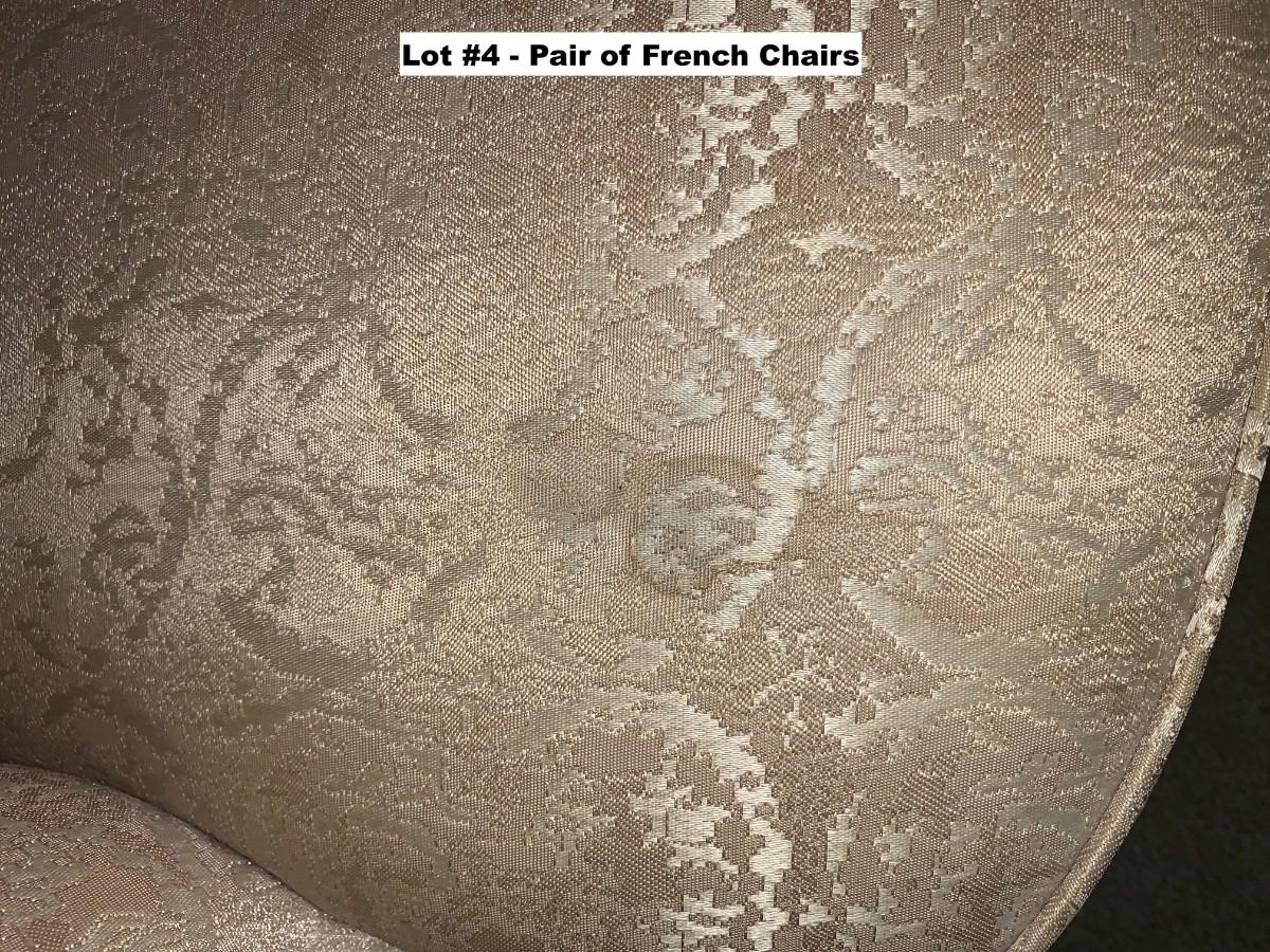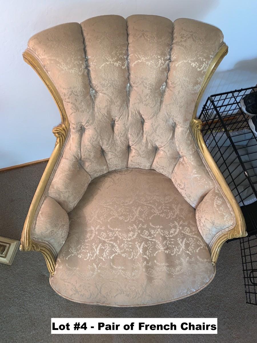 Pair of French Provincial style upholstered and tufted parlor chairs. See photos for stains.