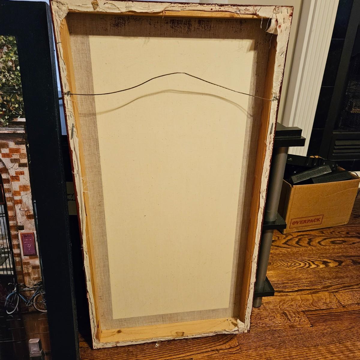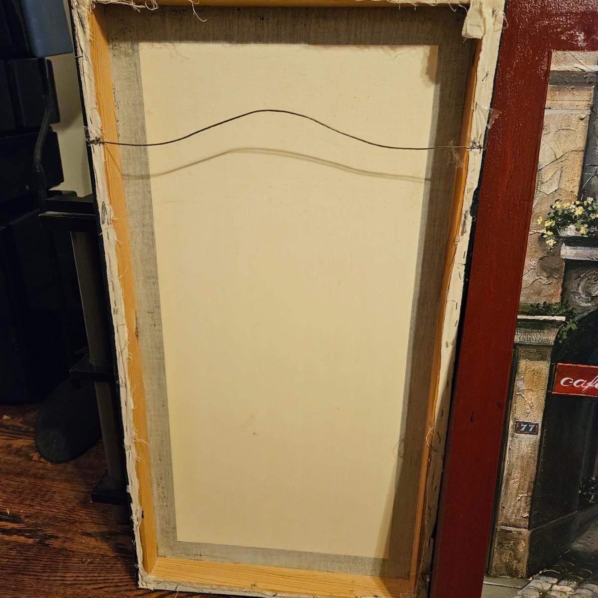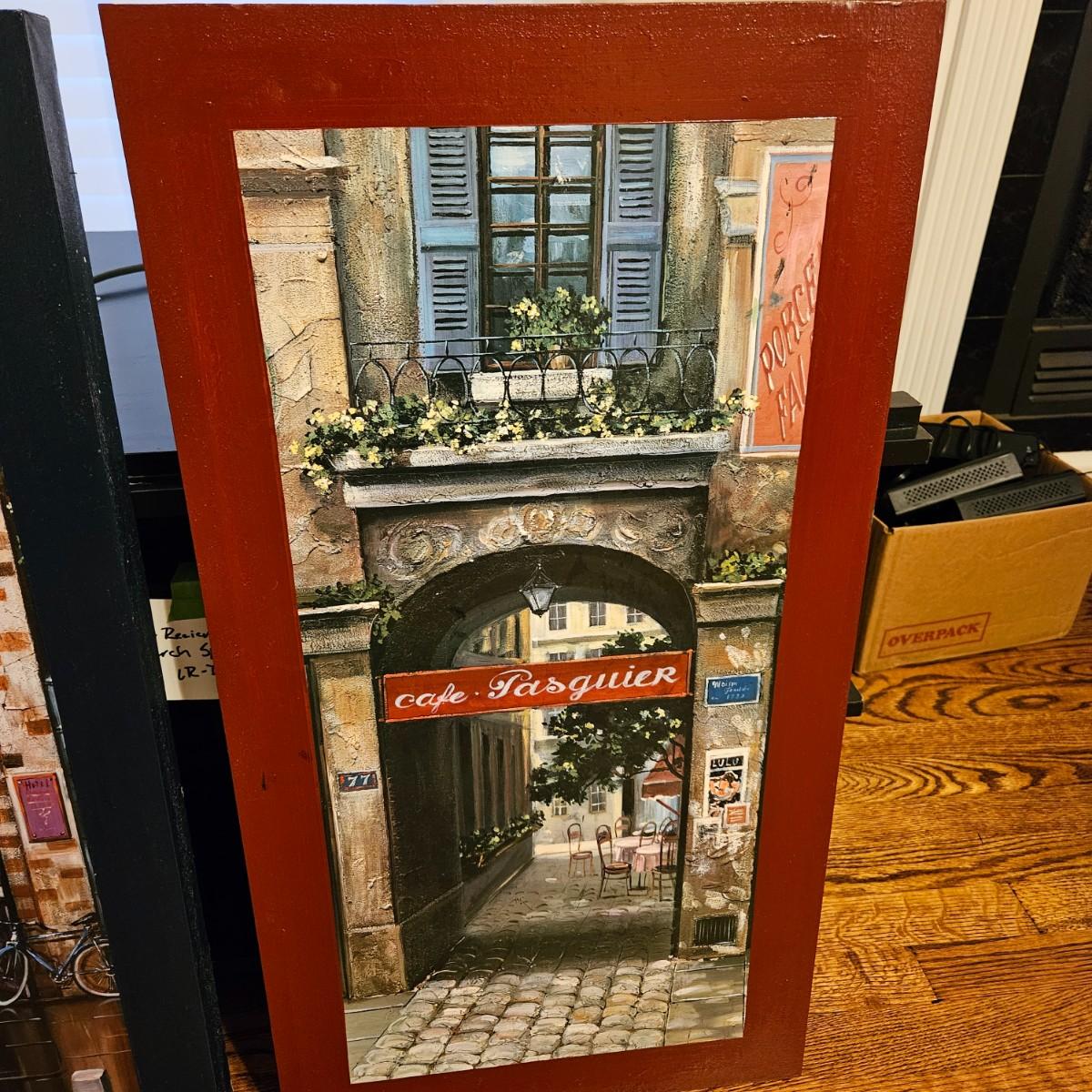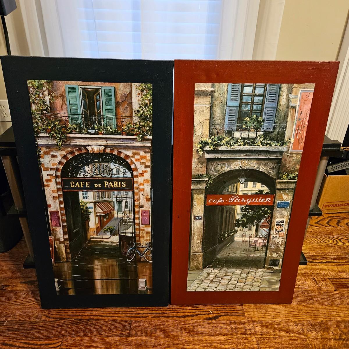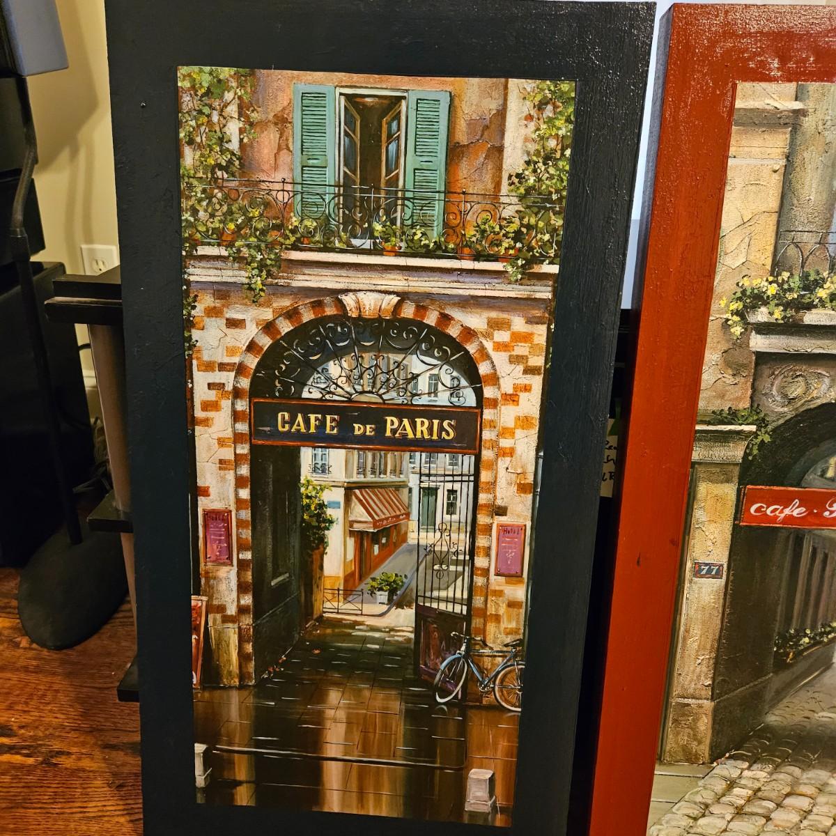 A pair of French city scene prints on canvas. Frames are wood.. They measure approximately 16" x 30"H. Shipping available. Shipping can be costly. We suggest contacting our preferred local shipping provider, Postage Express, with dimensions and getting an estimate before bidding: (828) 670-5501 or shipping@postageexpressnc.com