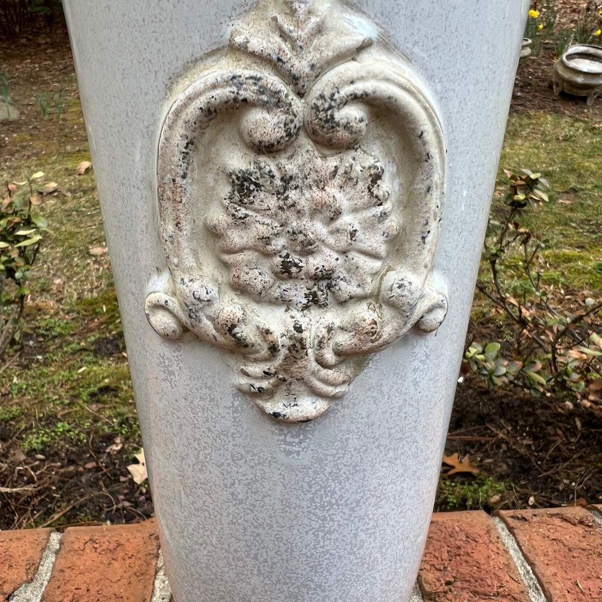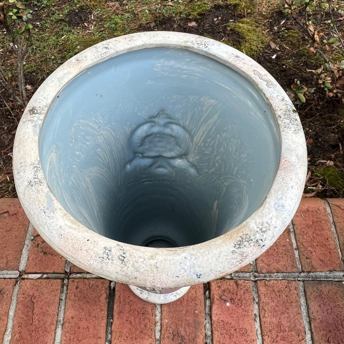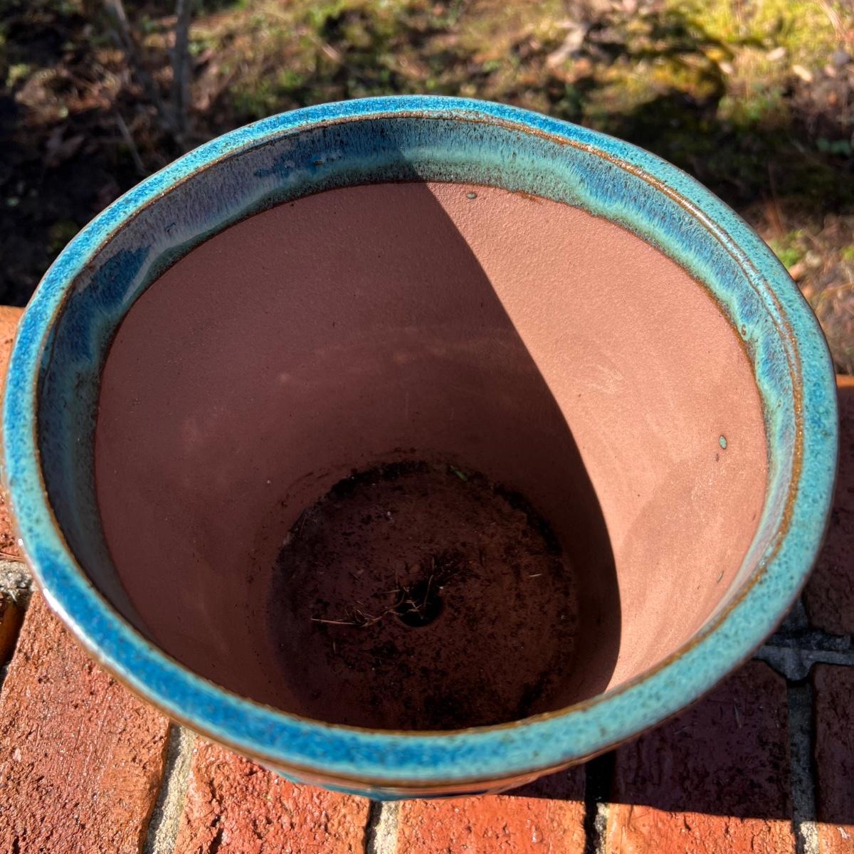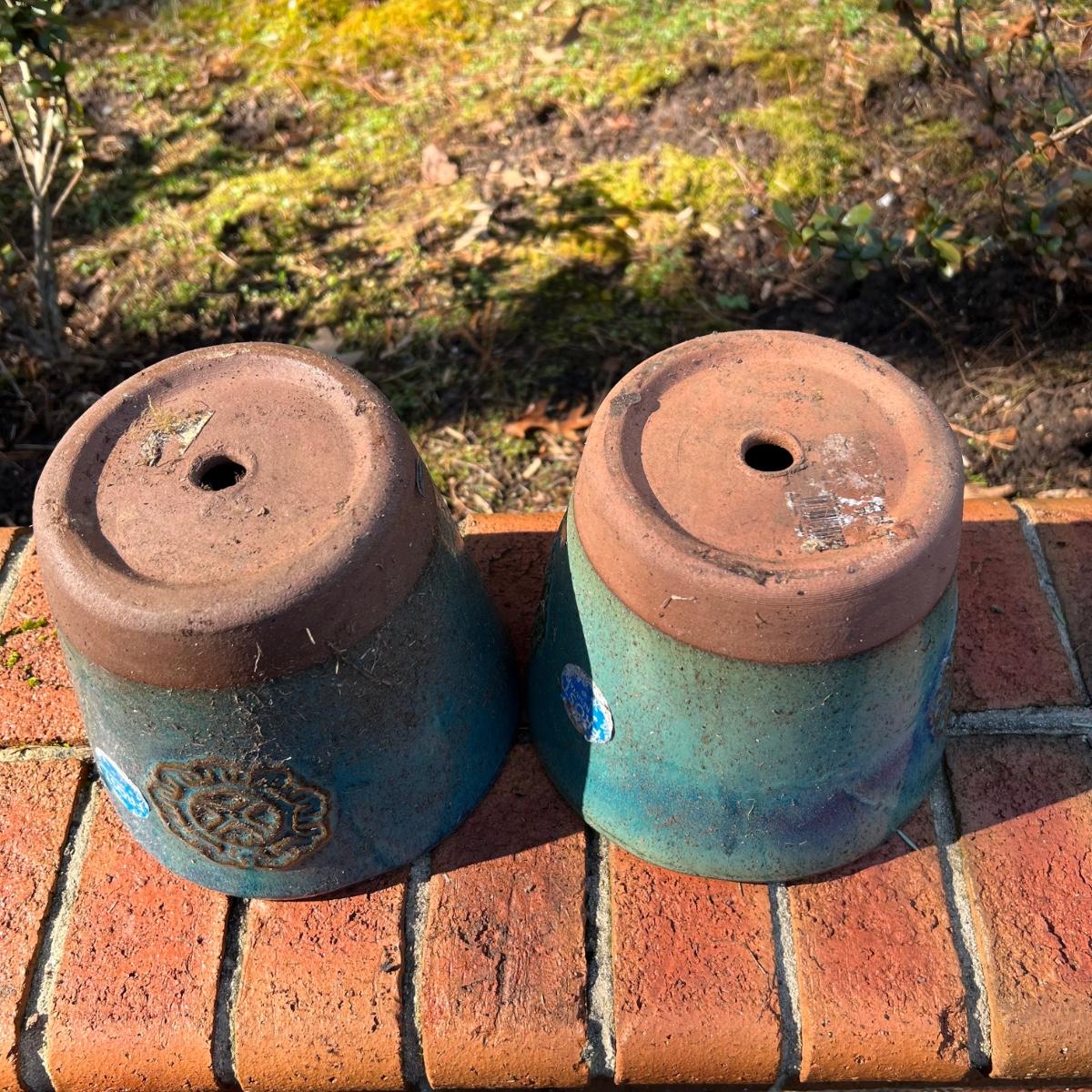 This matching pair of plant pots have a turquoise glaze. One pot has a small chip in its rim, see images. A third ceramic pot is included that does not have drainage holes.