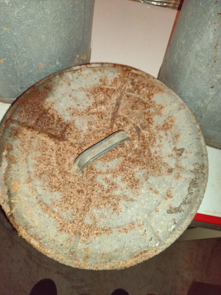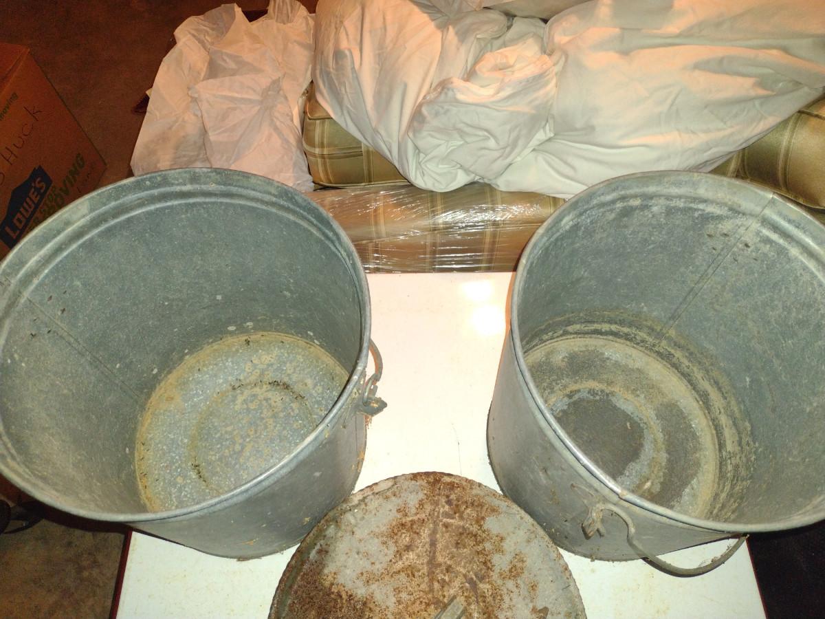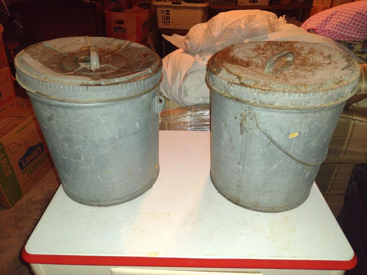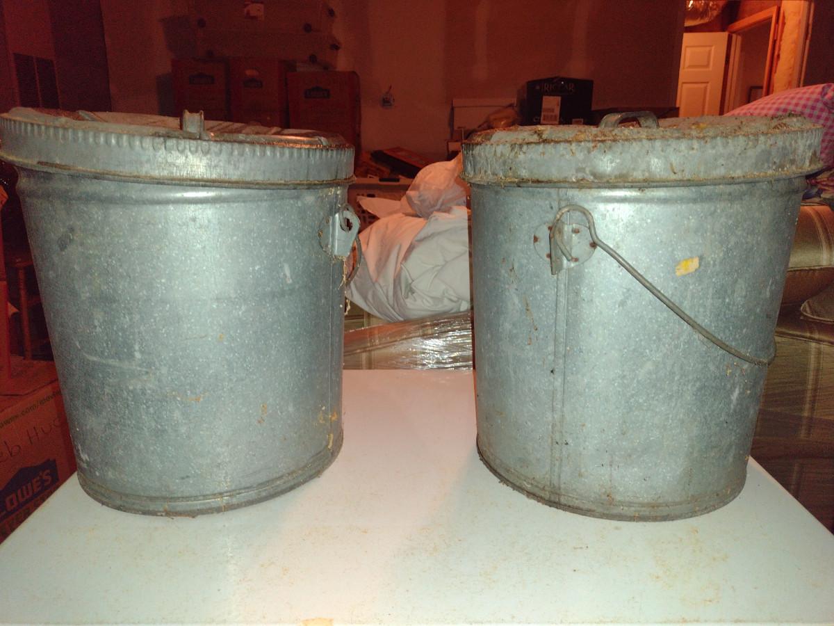 Pair of Galvanized Buckets with Lids. Item have rust on lids, but appear to still be intact- please see all pictures.