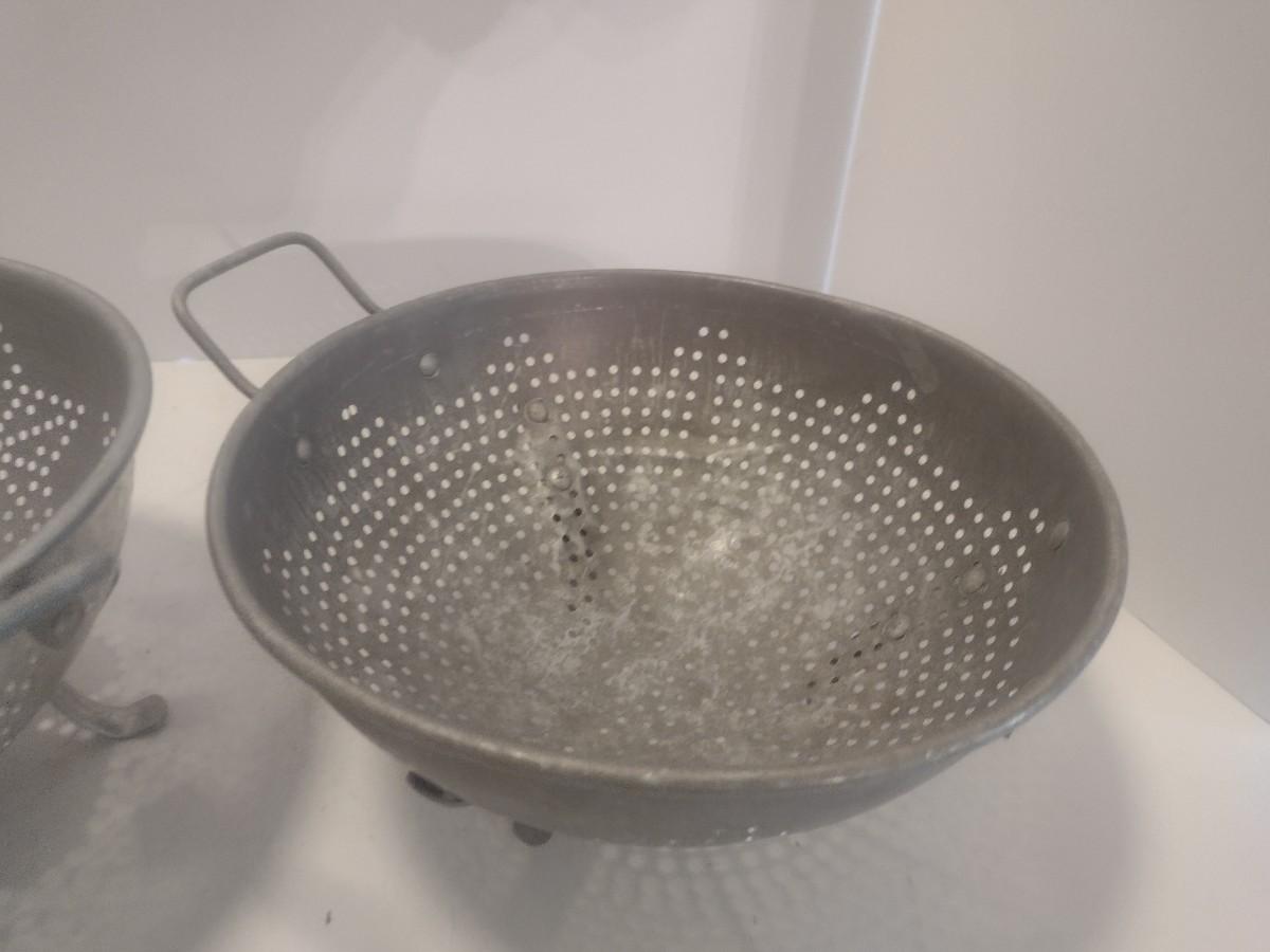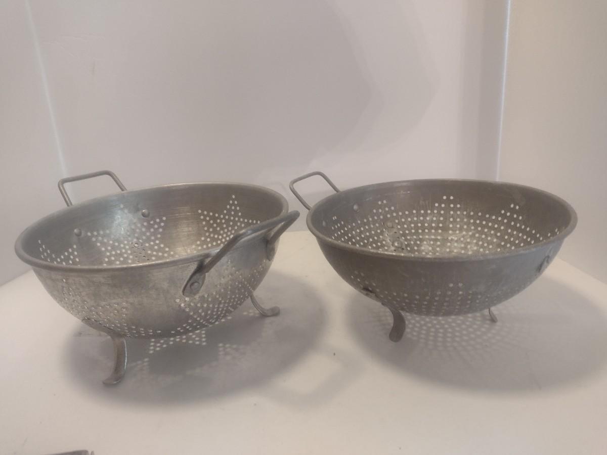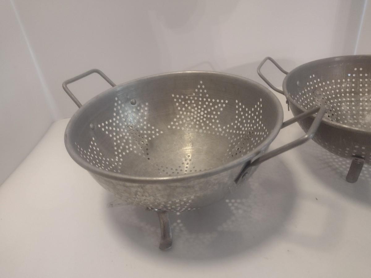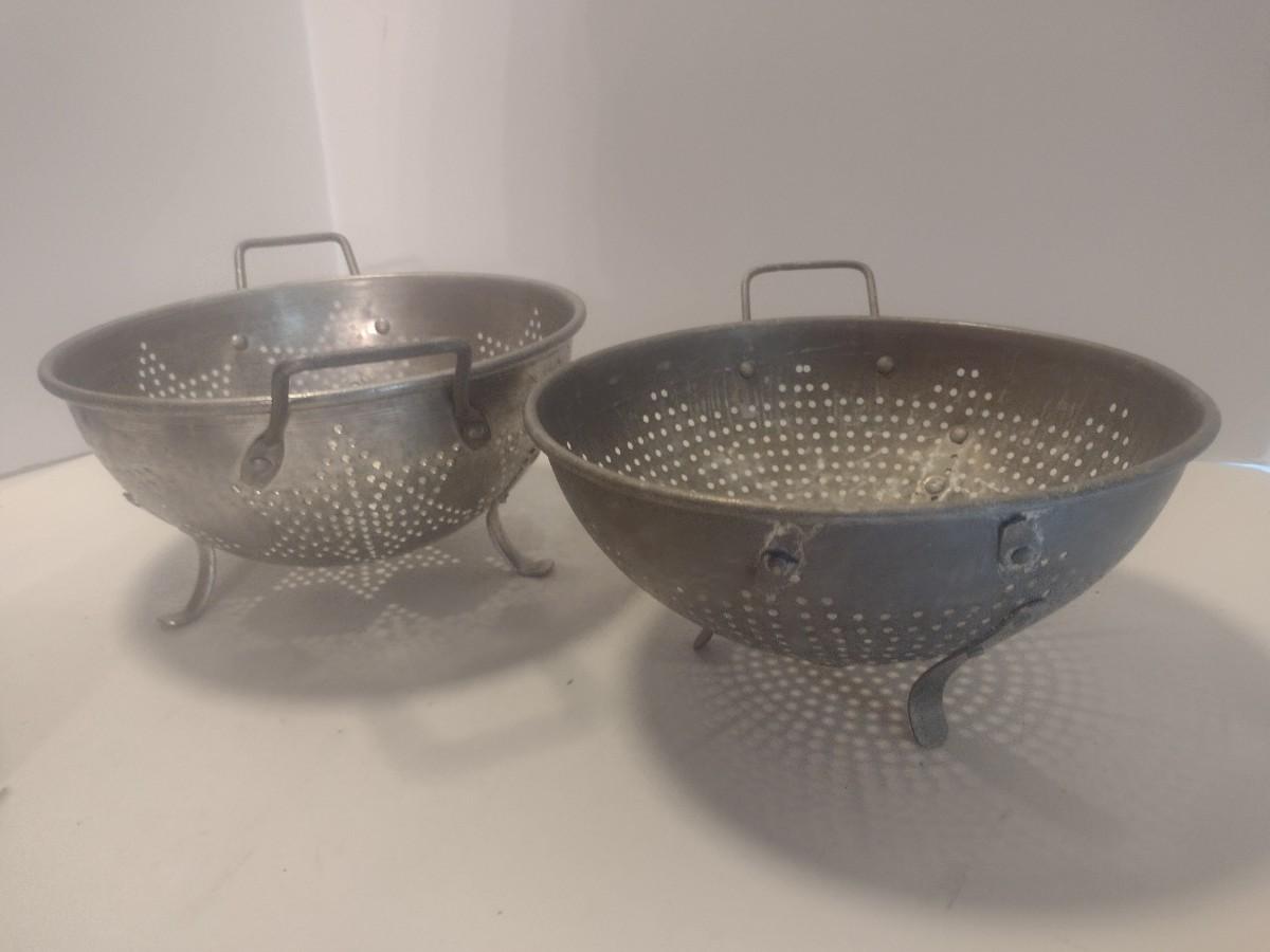 Pair of Galvanized Kitchen Colanders. Small one has missing handle as shown.