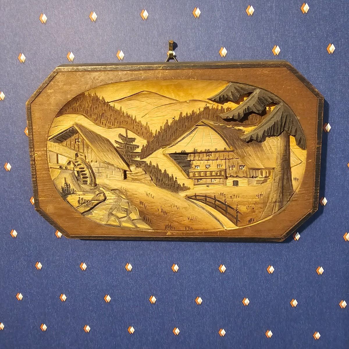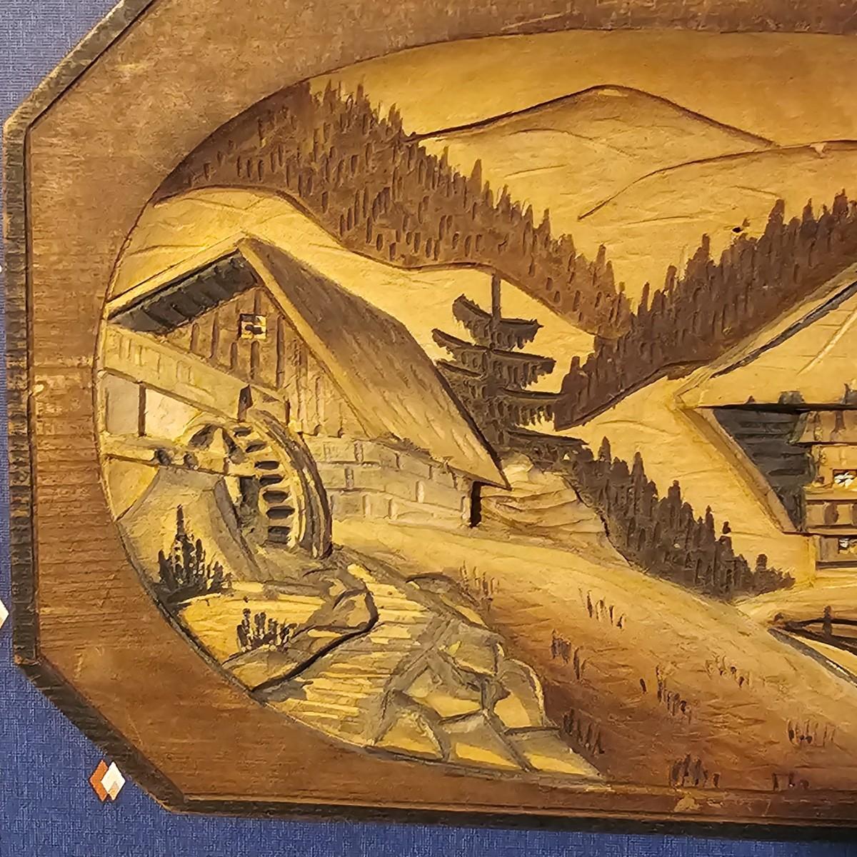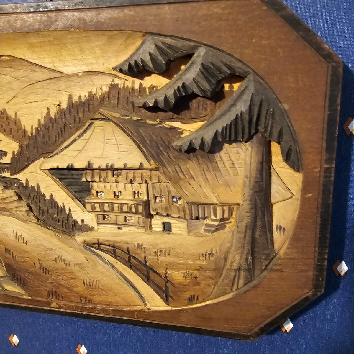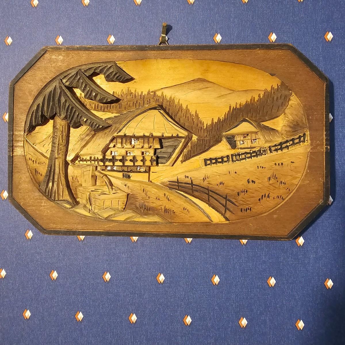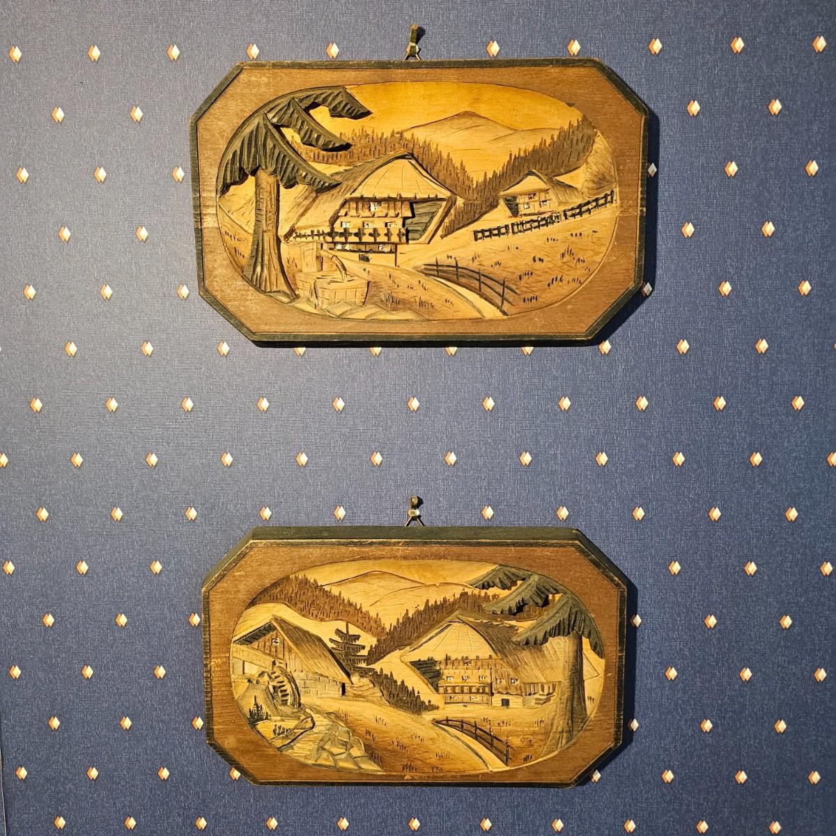 Beautiful vintage pair of woodcuts of schloss and countryside vignettes. 3-D depth with trees and mountains, each piece measures 11.5" x 7"H. Stamps on back indicate No. III, and Garantiert Handarbeit, and what appears to be care instructions in German. See photos for details. Shipping available.