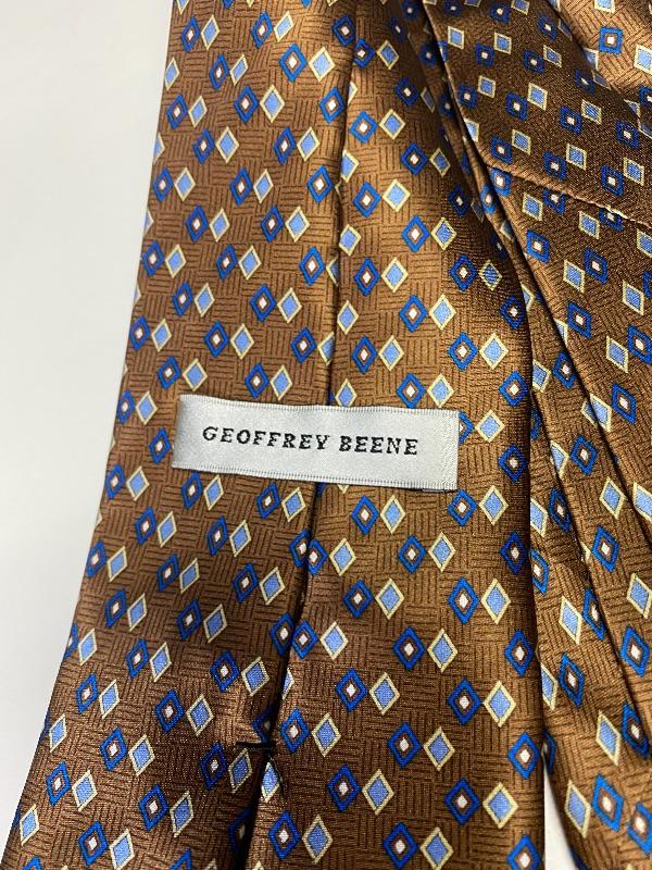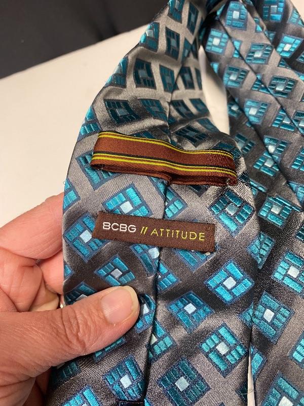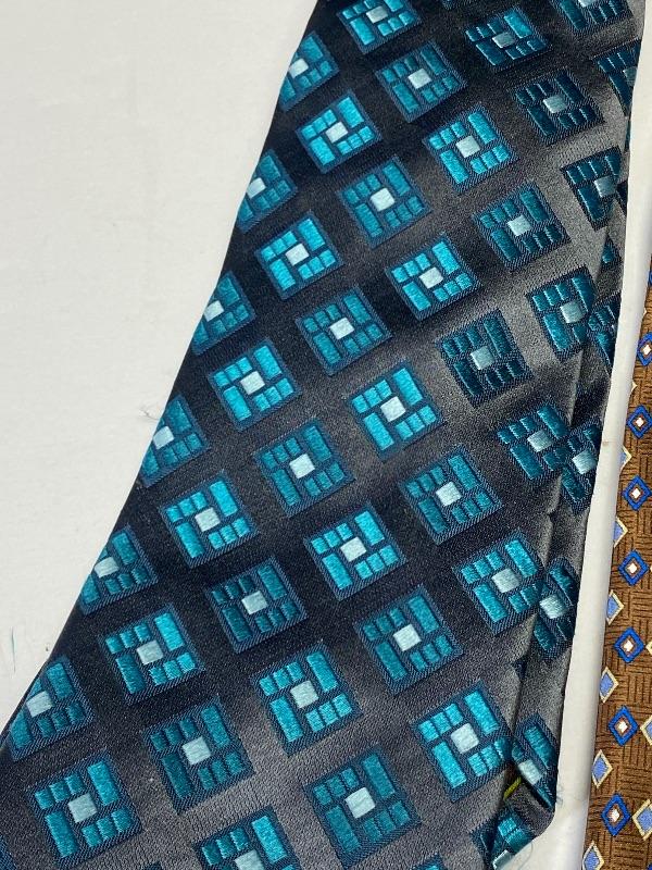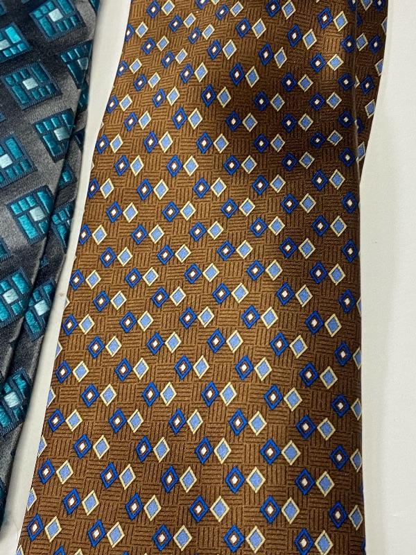 Pair of men's geometric neck ties. The blue and grey tie is from BCBG Attitude. The brown is from Geoffrey Beane. Both in good condition.