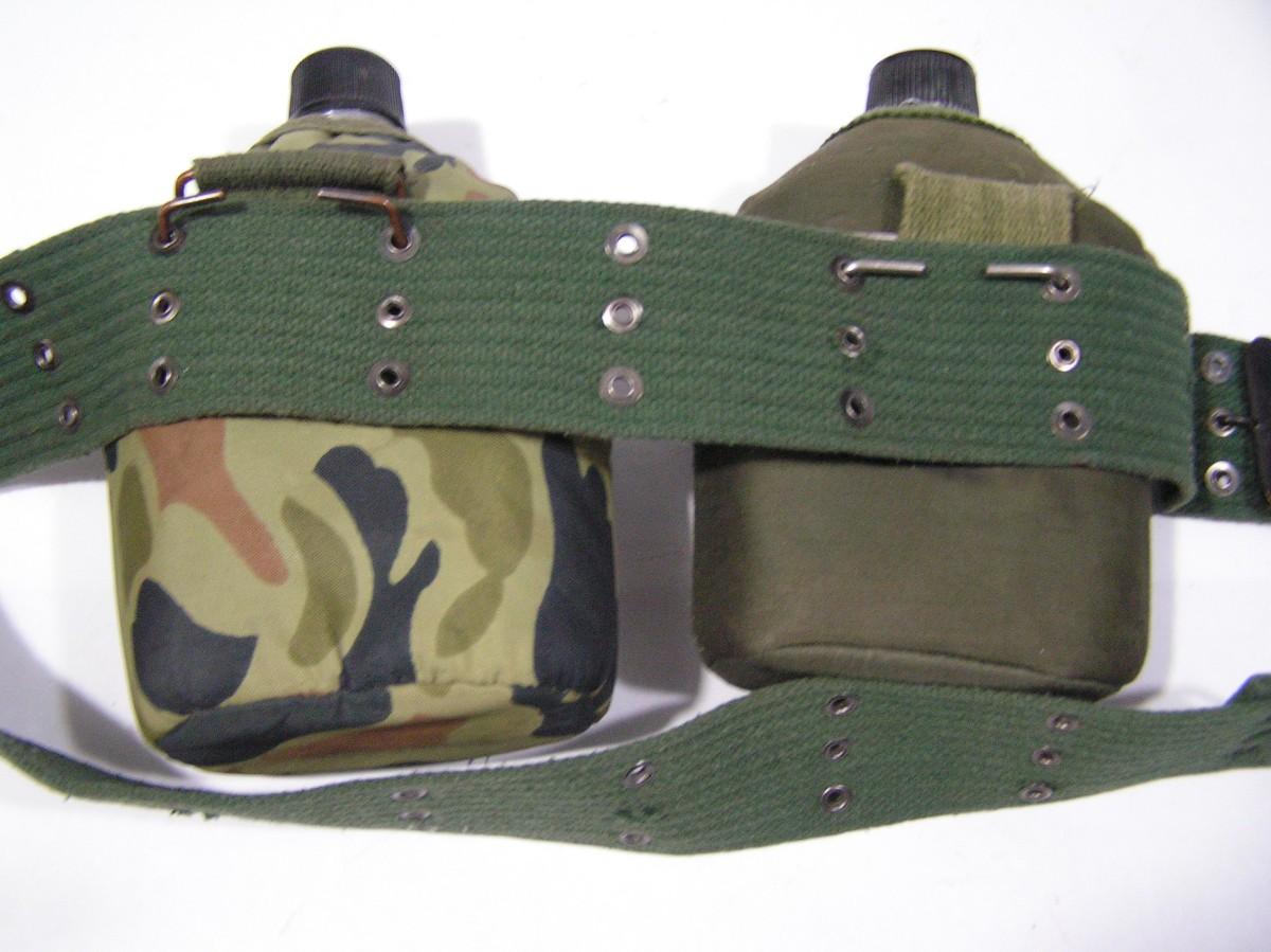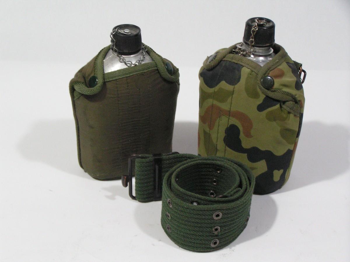 Pair of G.I. style canteens with belt pouches and belt. Good condition