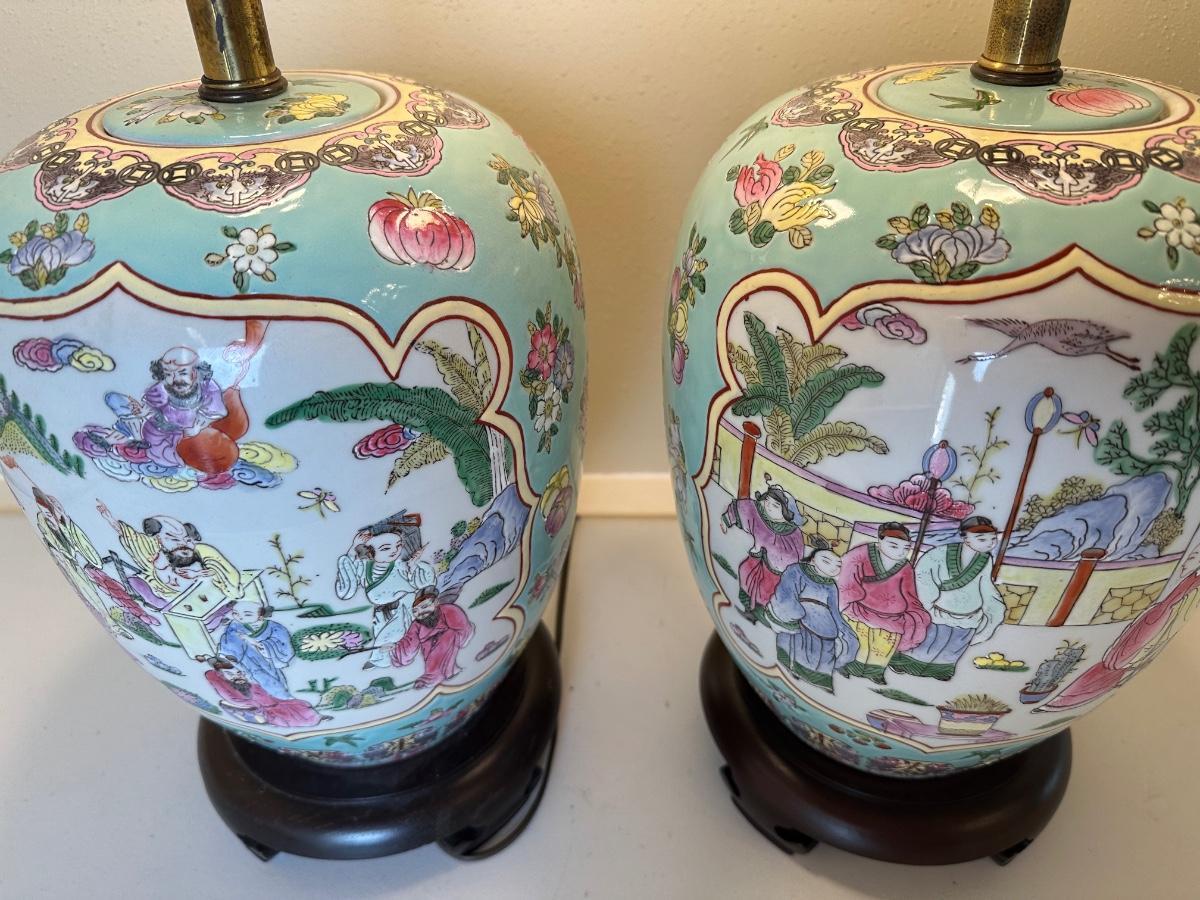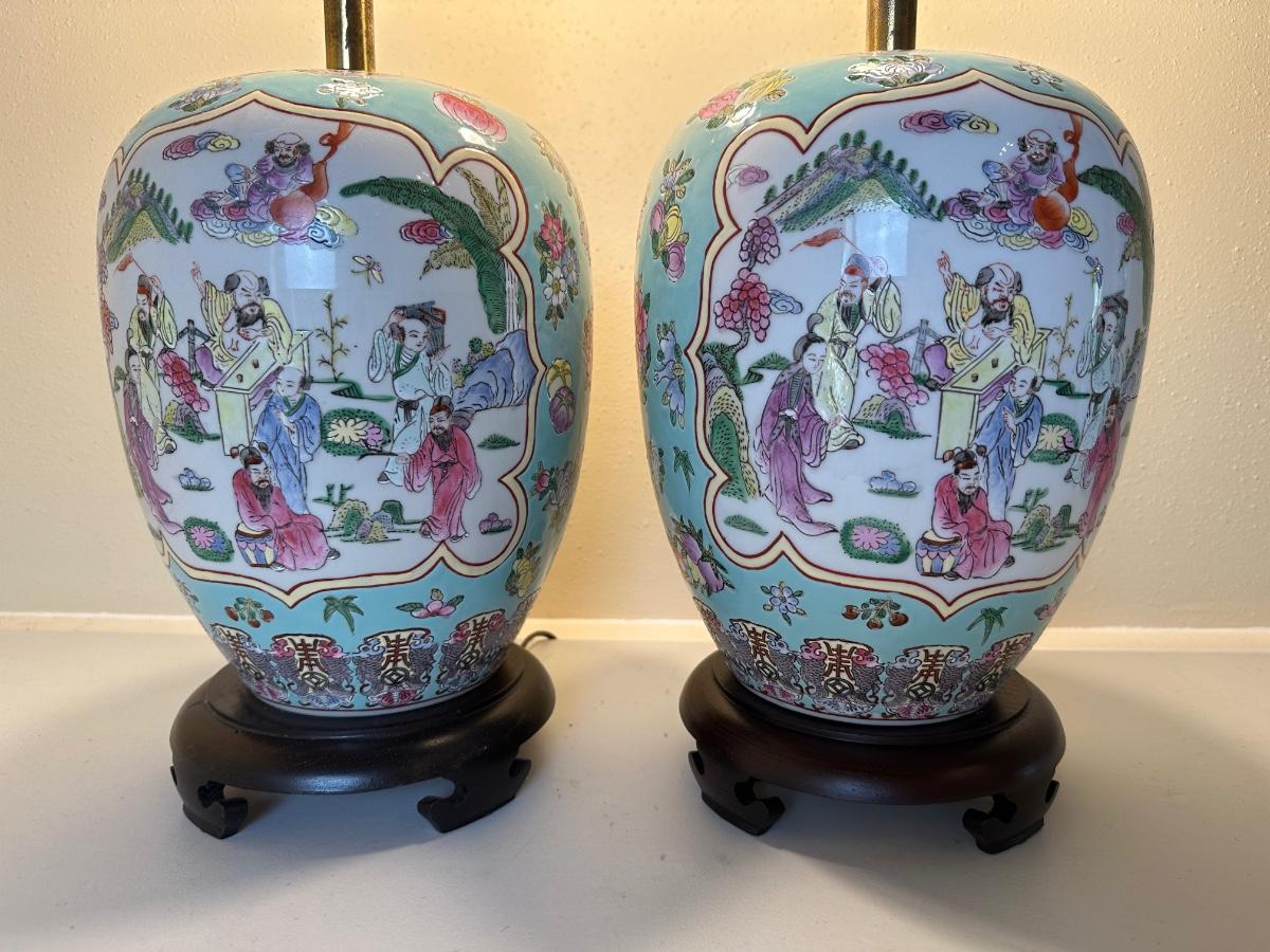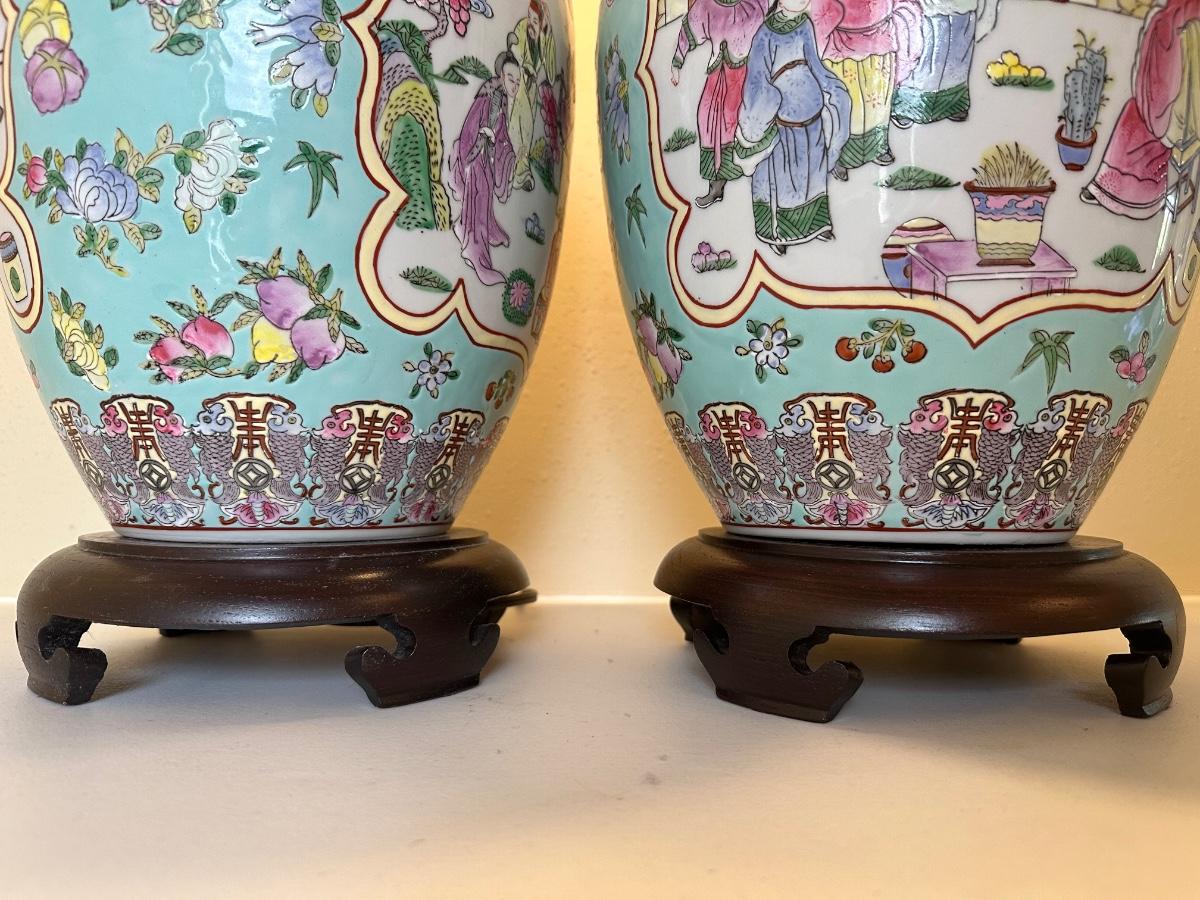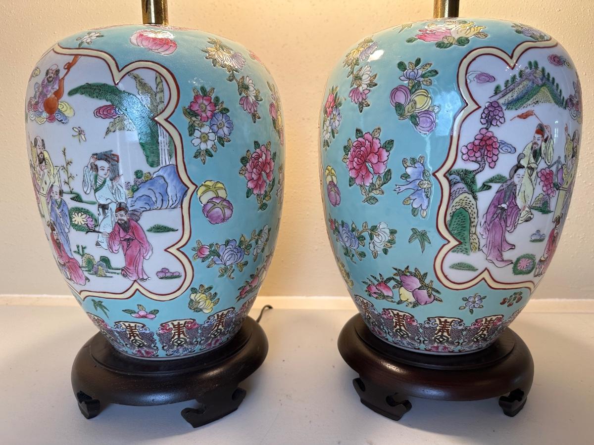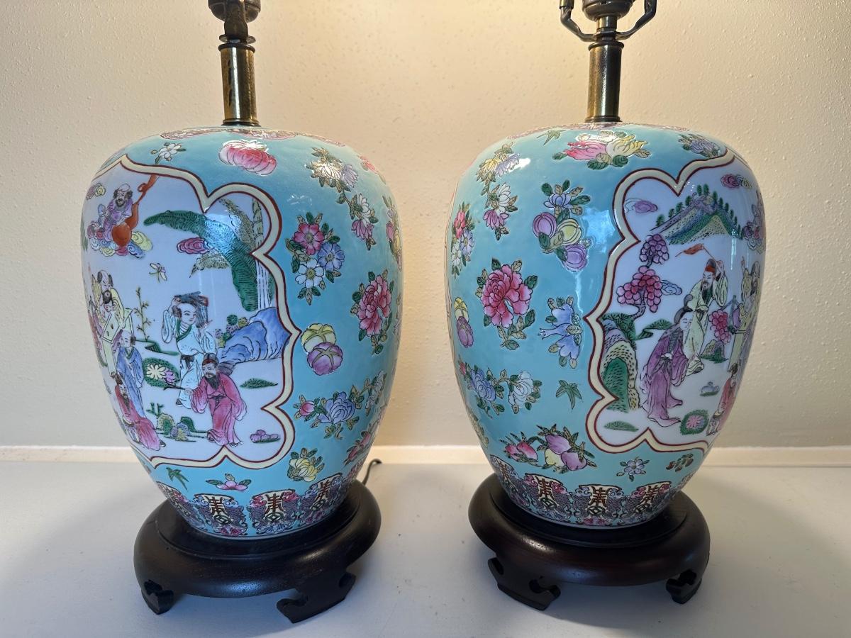 Pair of Ginger Jar Chinoiserie Style Table Lamps with Wood Base