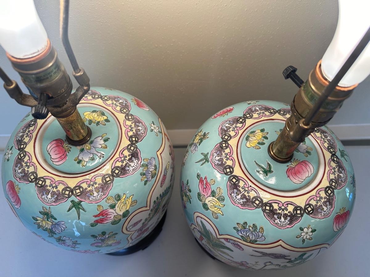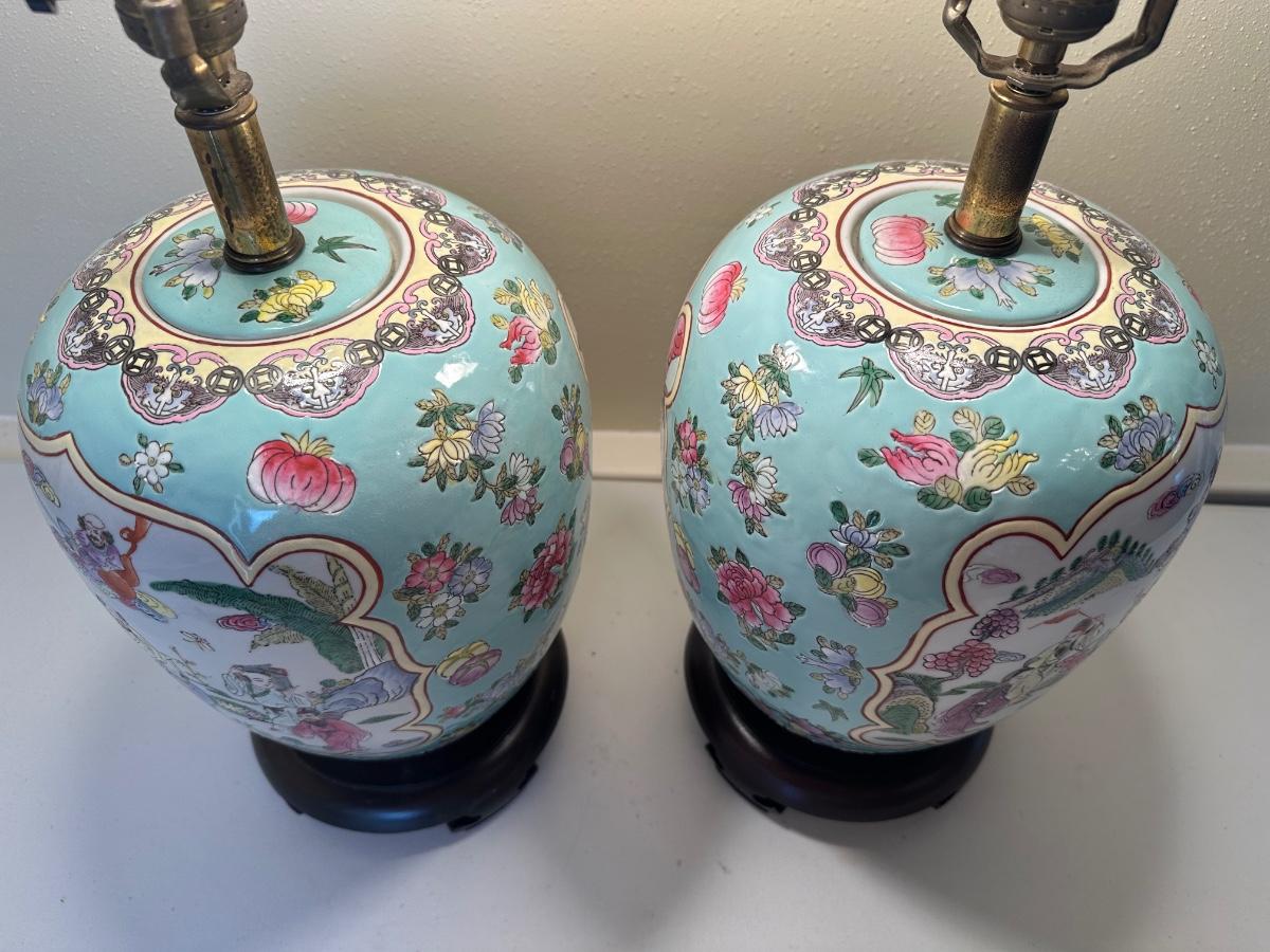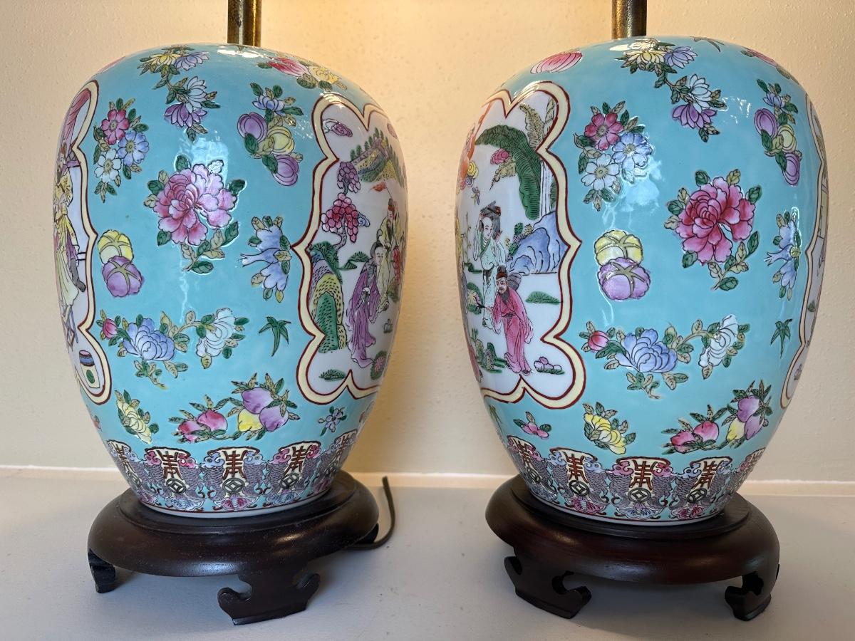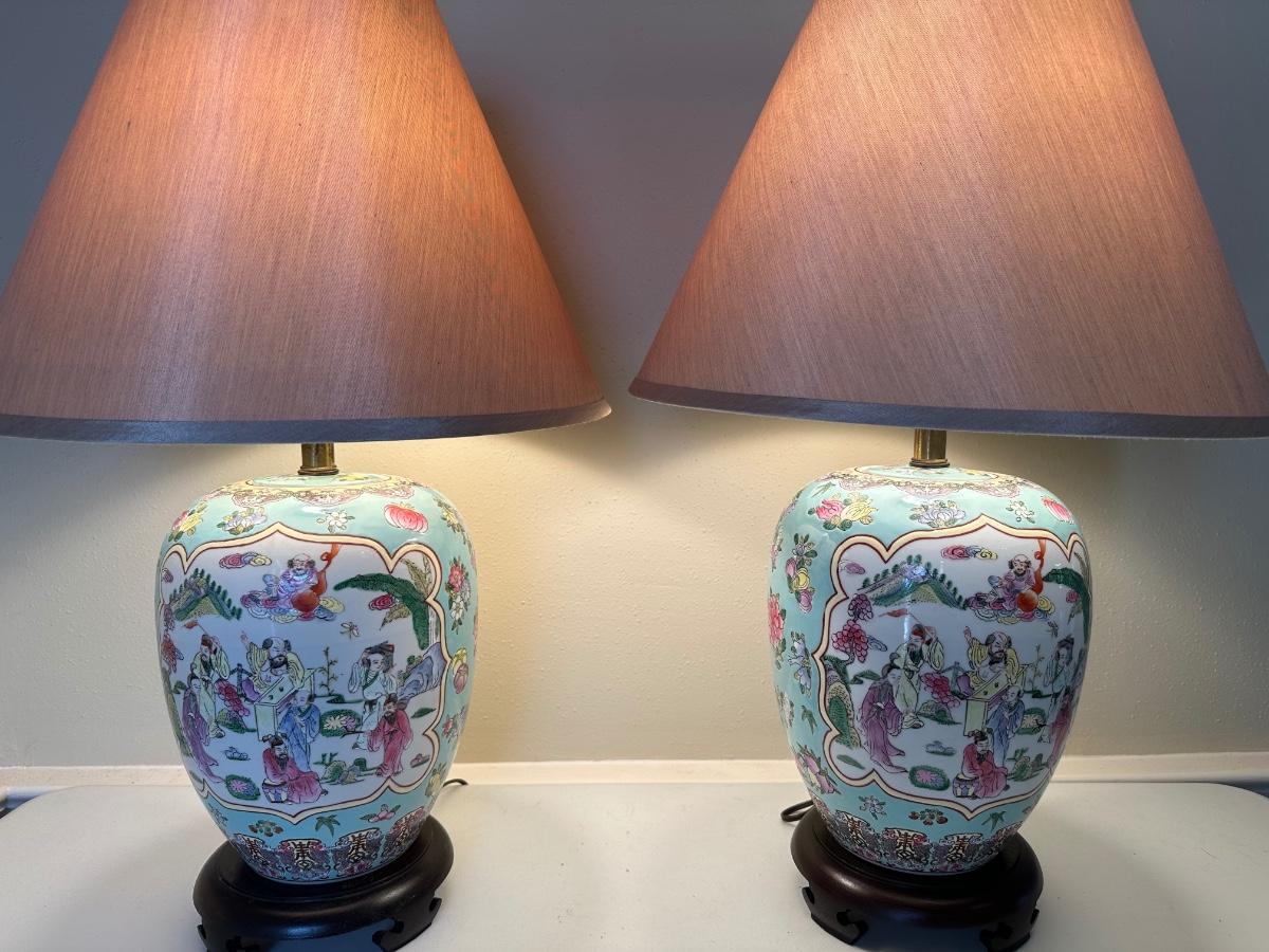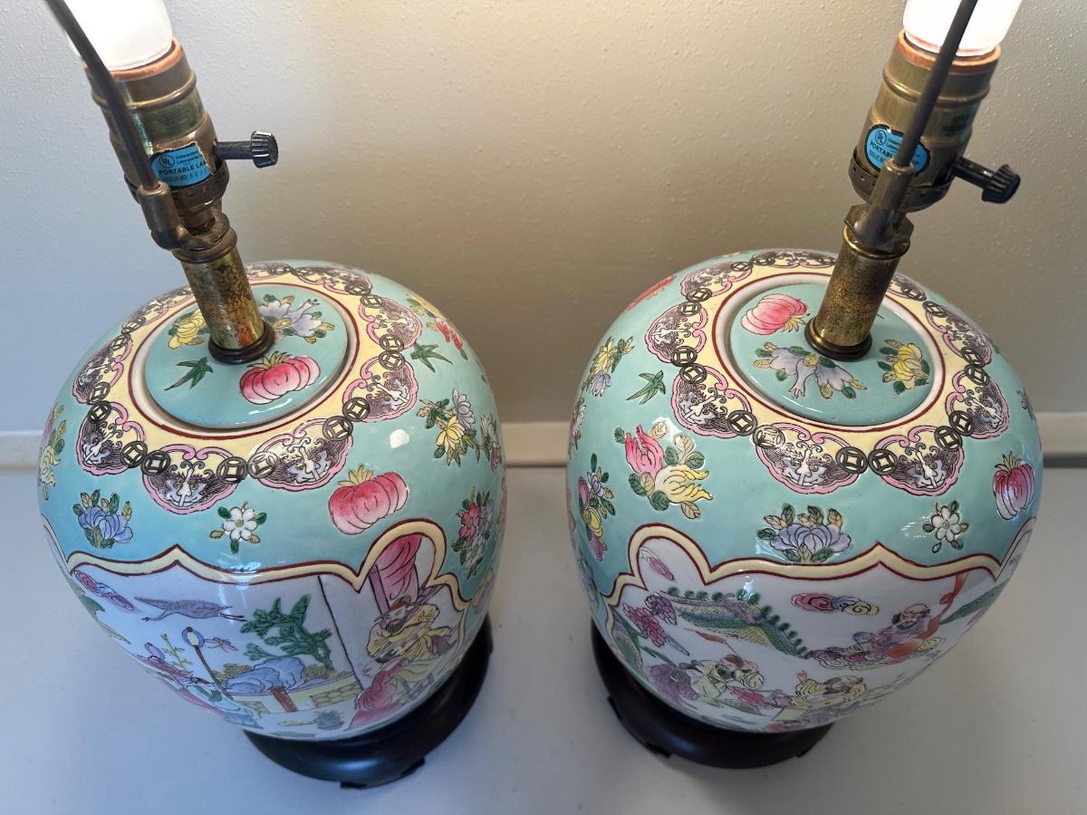 Pair of Ginger Jar Chinoiserie Style Table Lamps with Wood Base