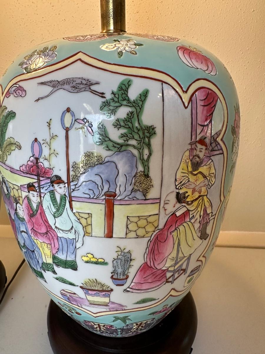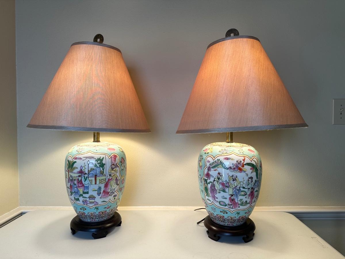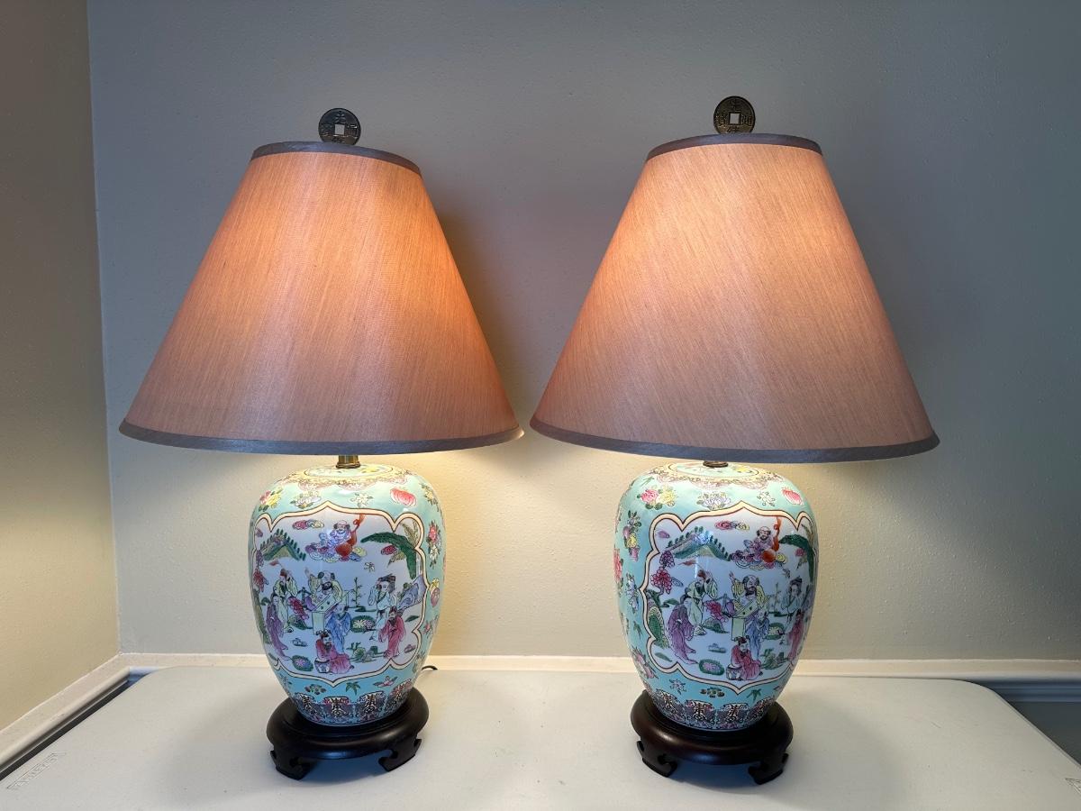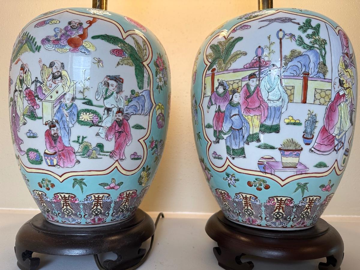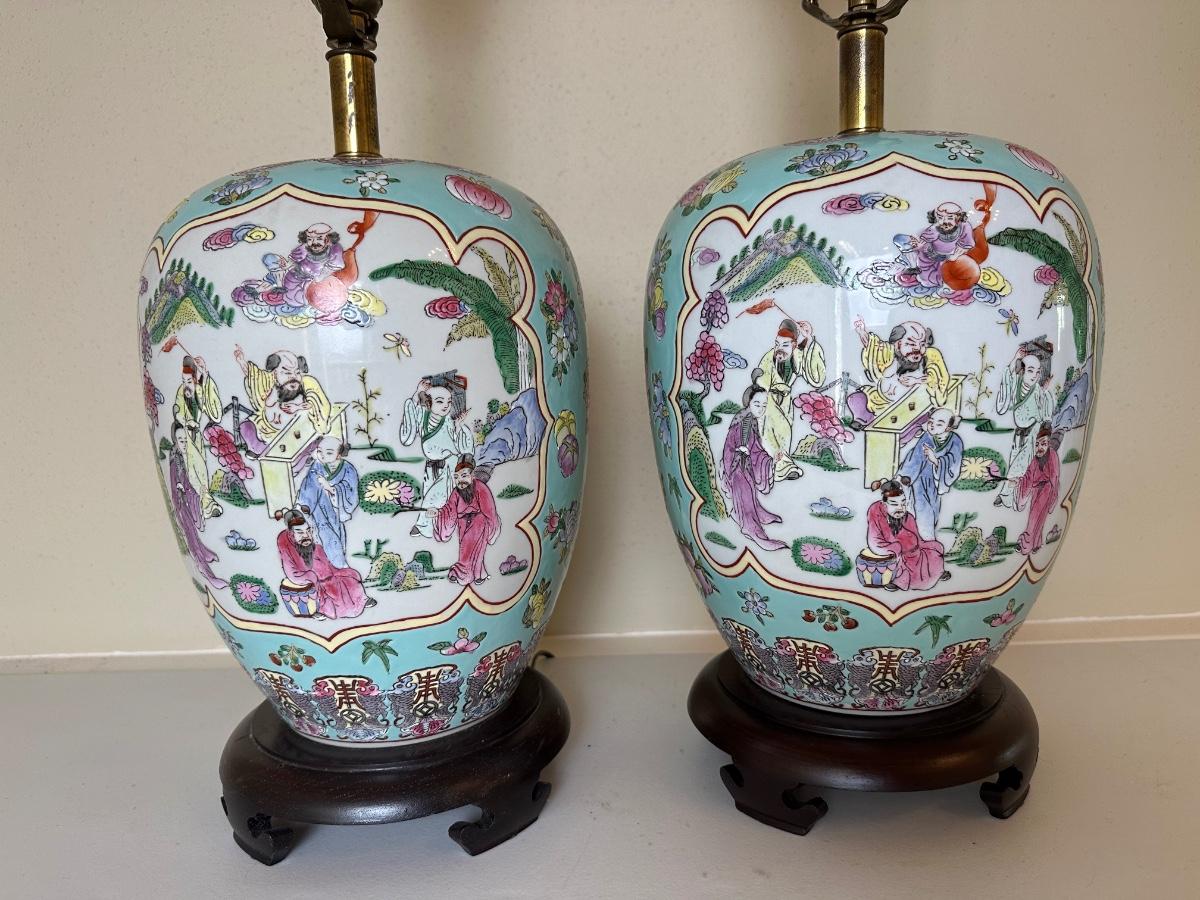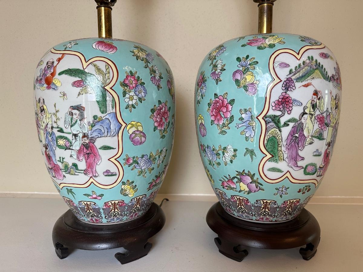 Pair of Ginger Jar Chinoiserie Style Table Lamps with Wood Base
