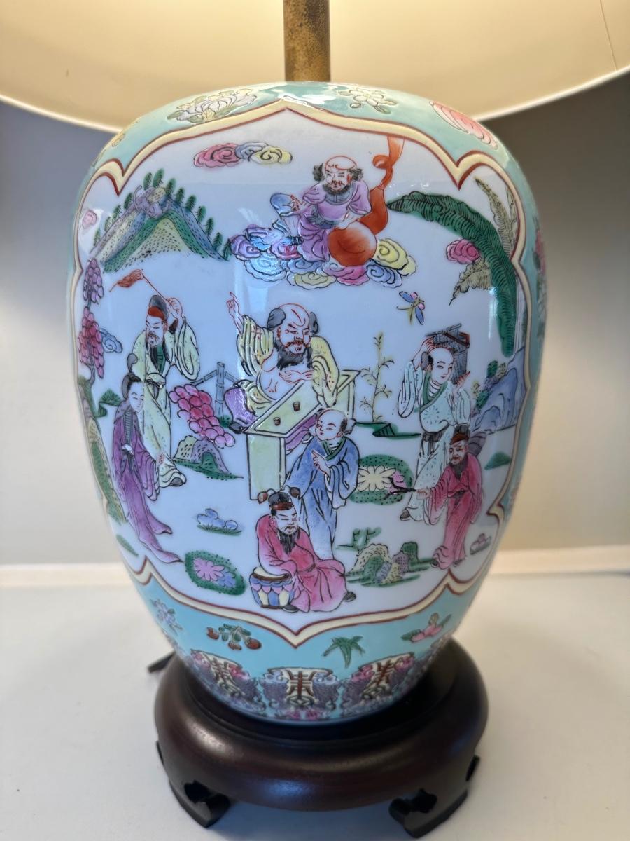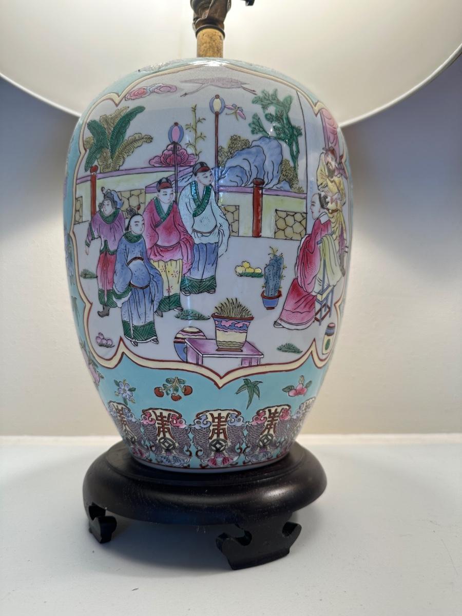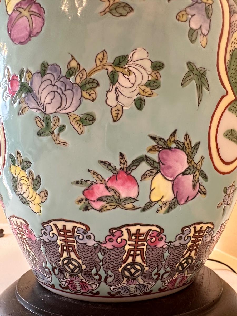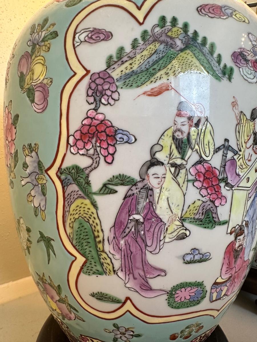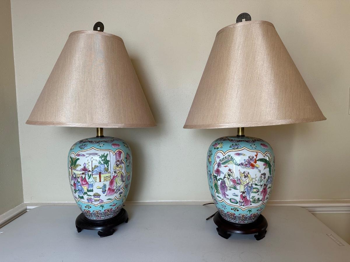 Pair of Ginger Jar Chinoiserie Style Table Lamps with Wood Base