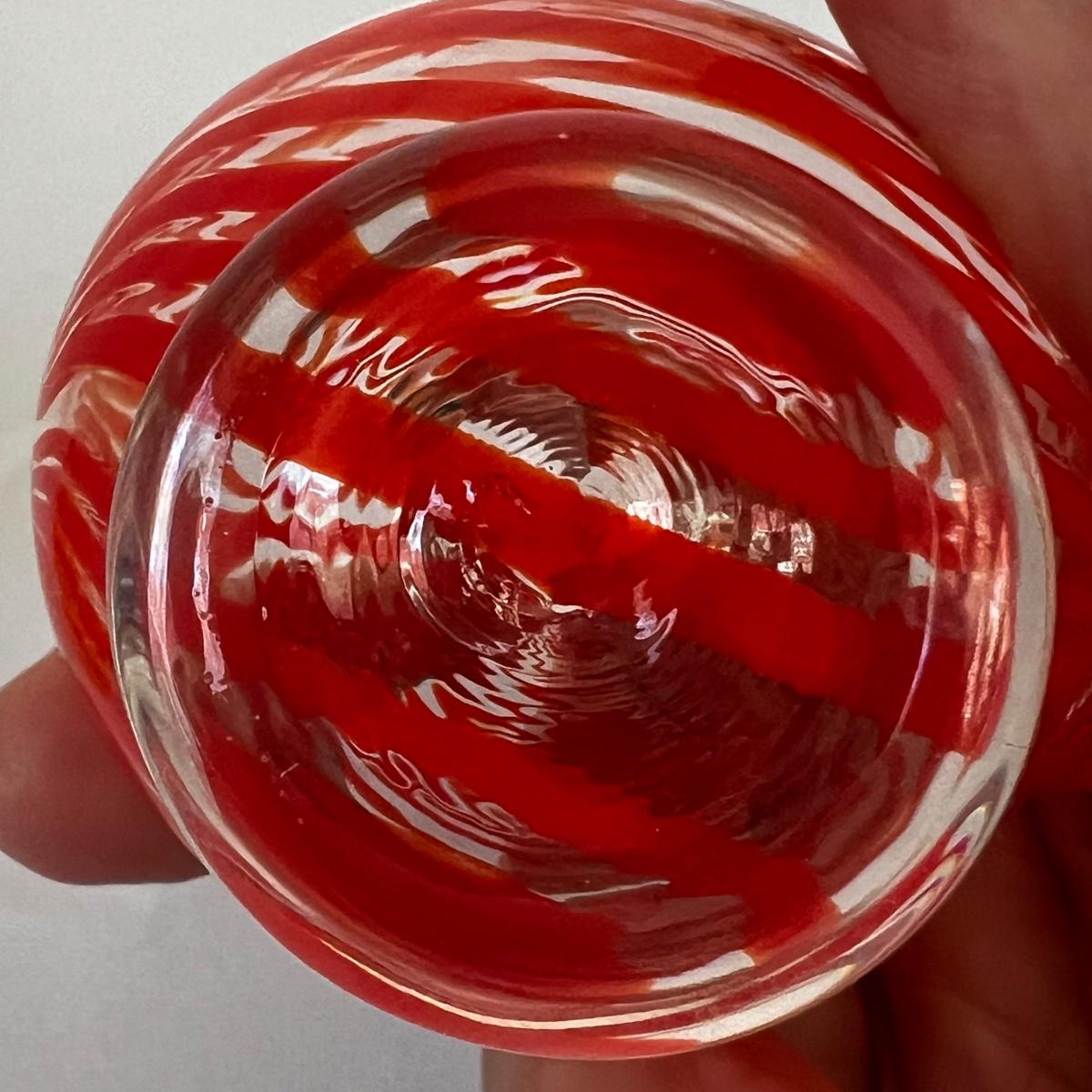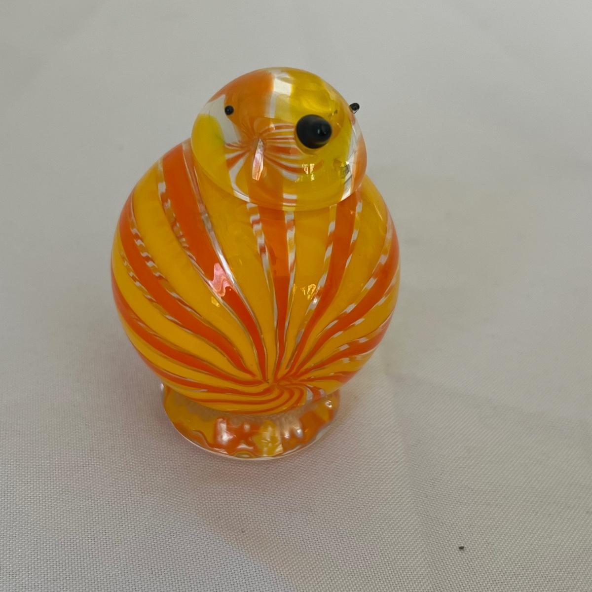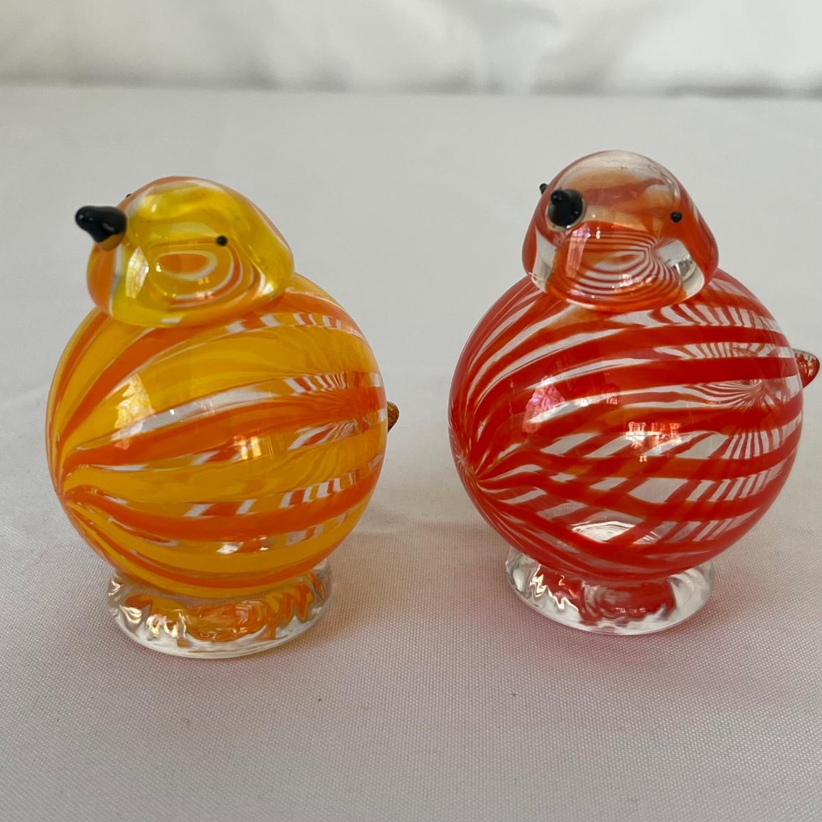 This pair of birds are matching except for their different vibrant colored stripes. They appear to be hand blown glass.