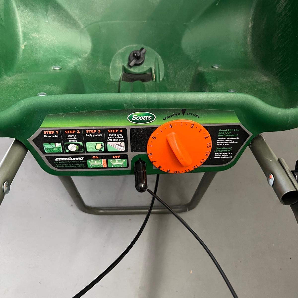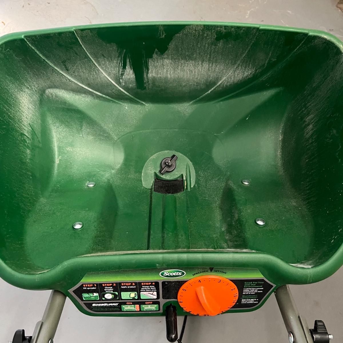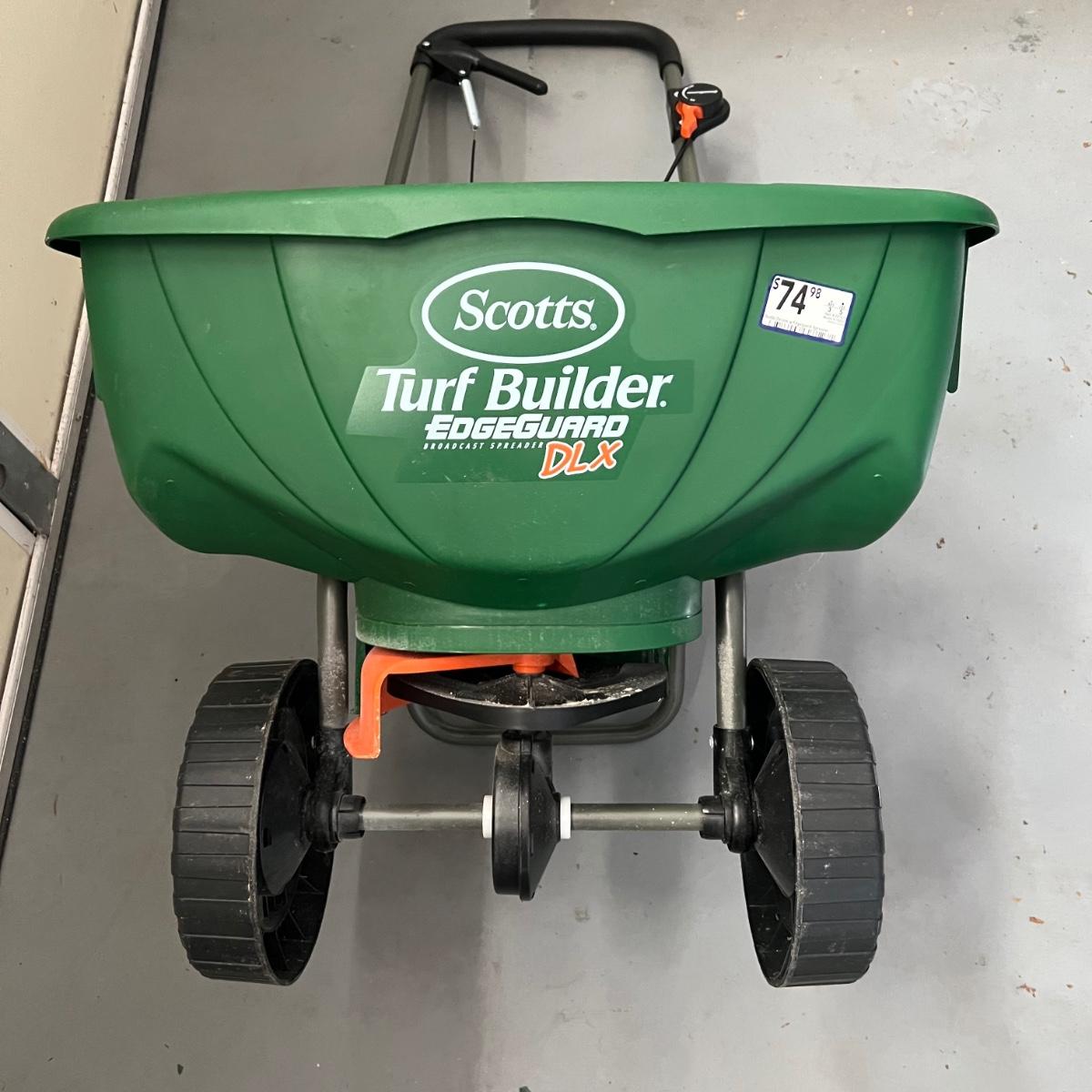 Scotts Turf Builder Edgeguard Broadcast Spreader DLX. With plastic barrel and hard wheels. All parts appear to function. Local pickup only.