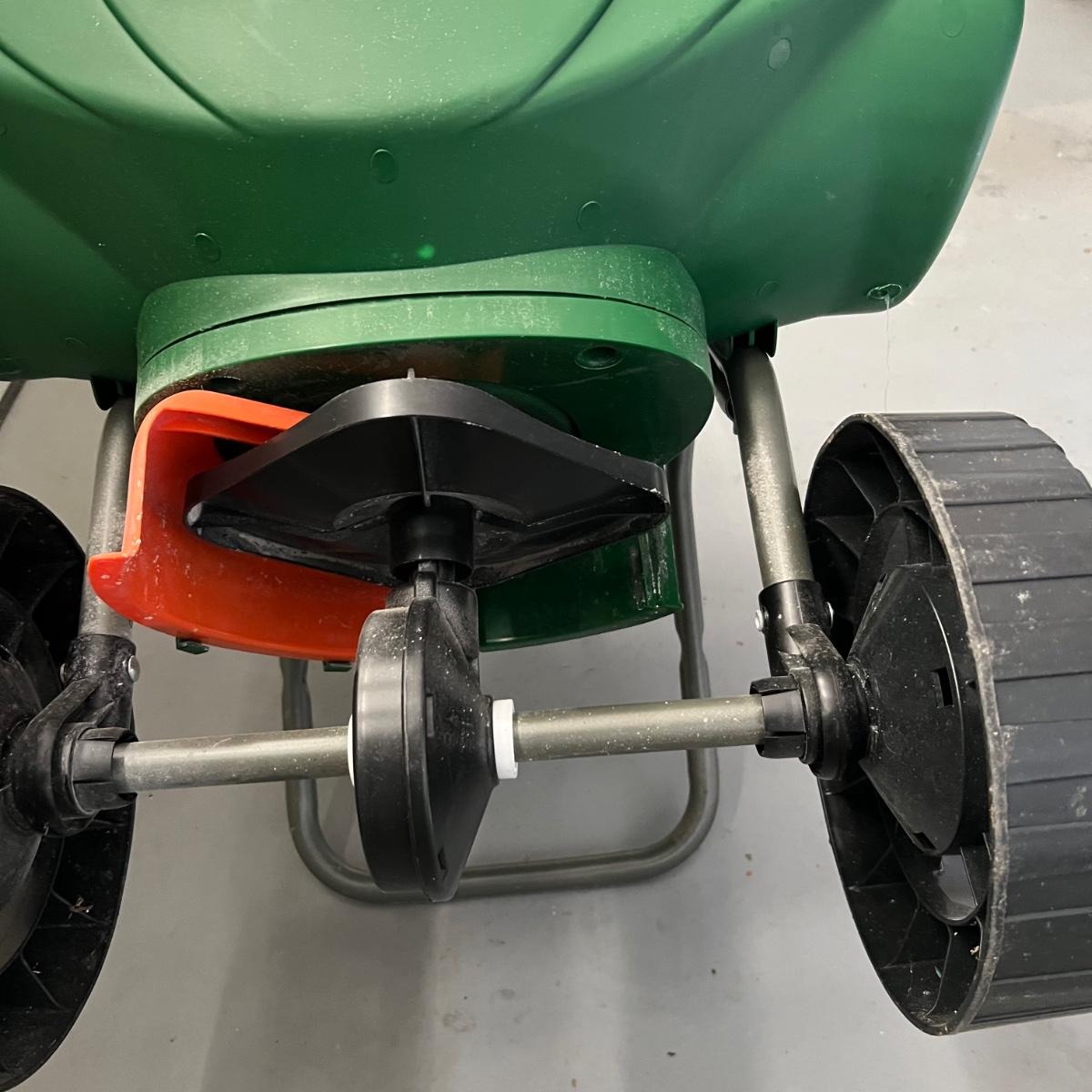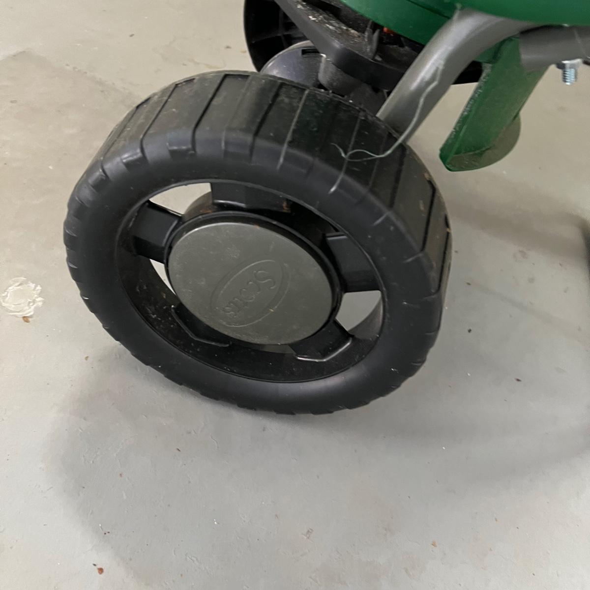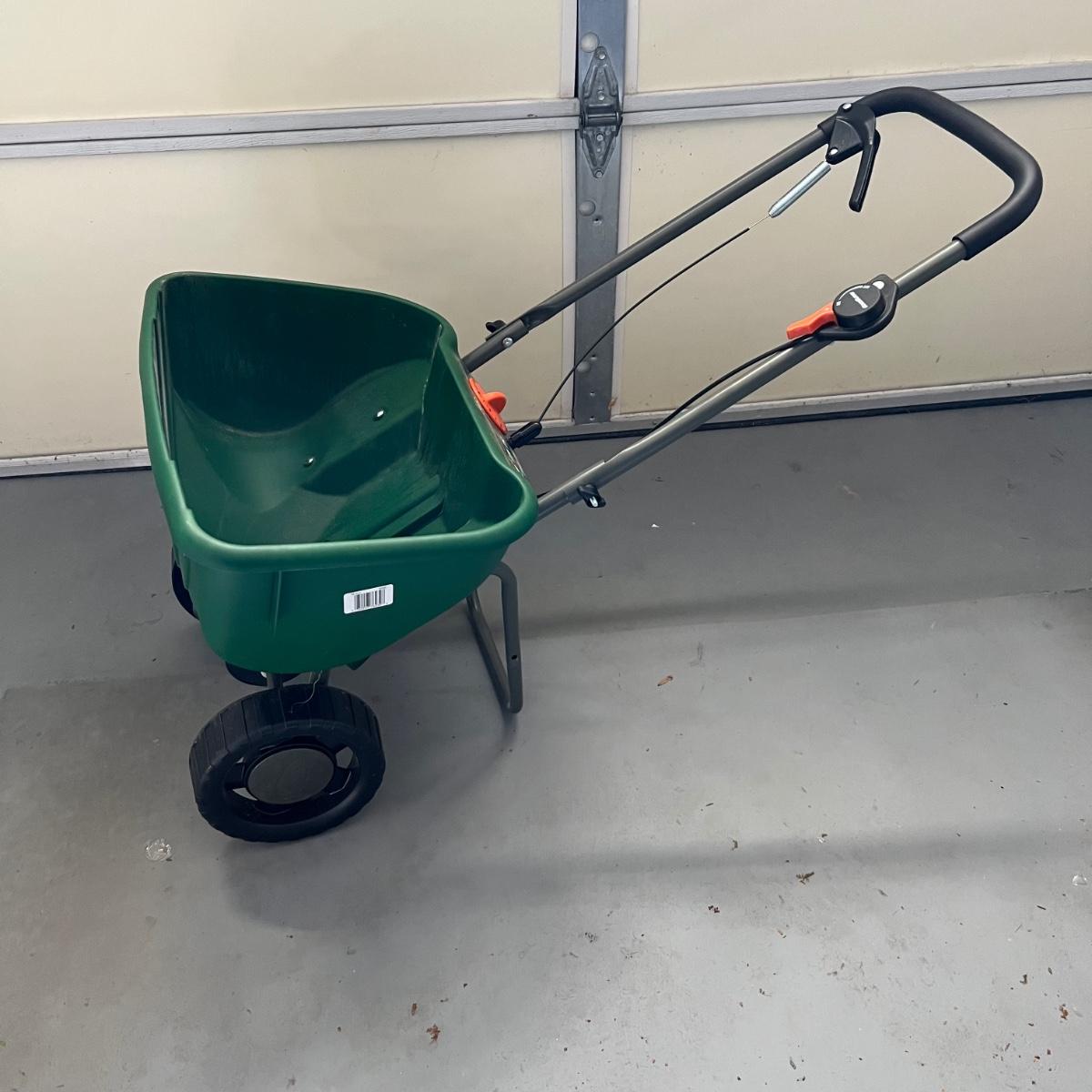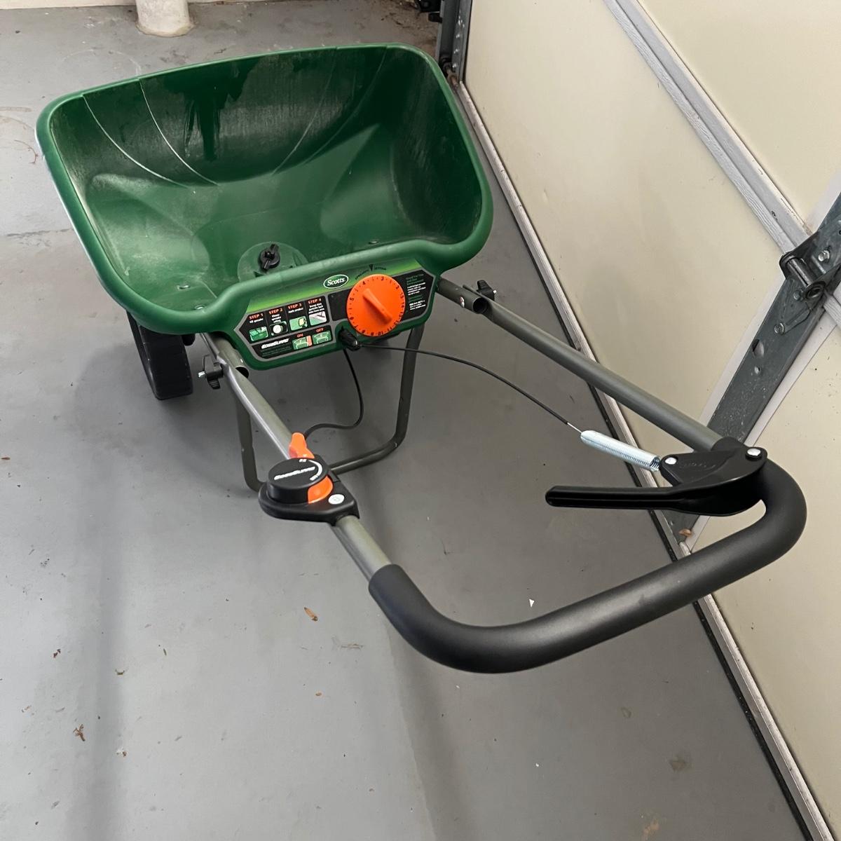 Scotts Turf Builder Edgeguard Broadcast Spreader DLX. With plastic barrel and hard wheels. All parts appear to function. Local pickup only.