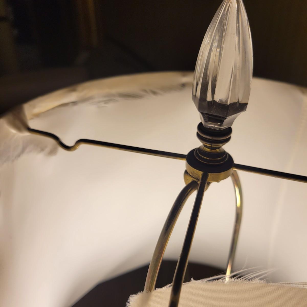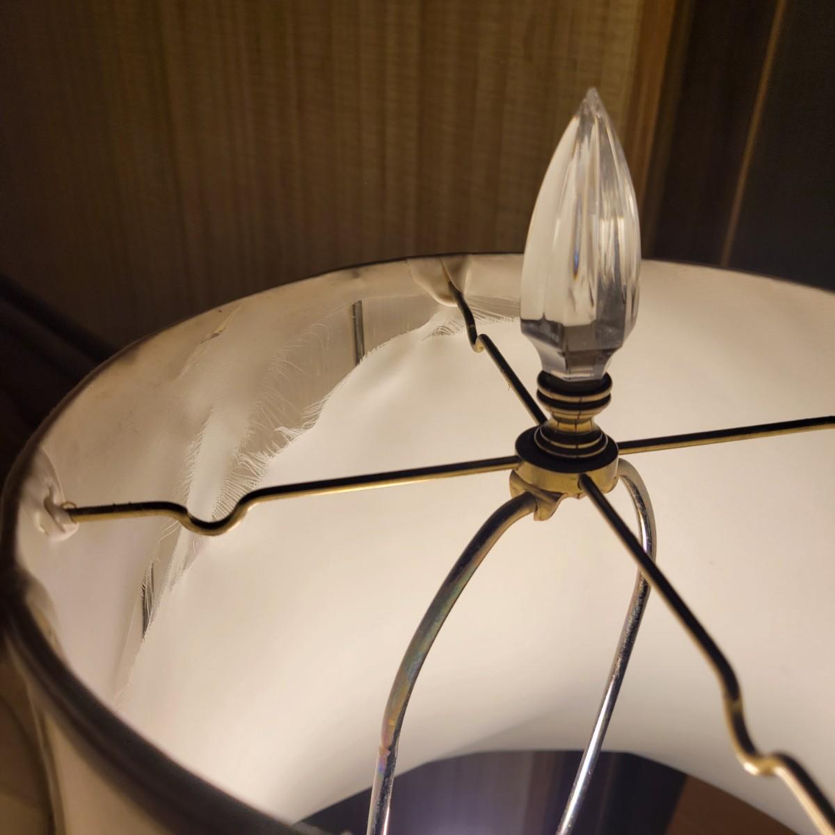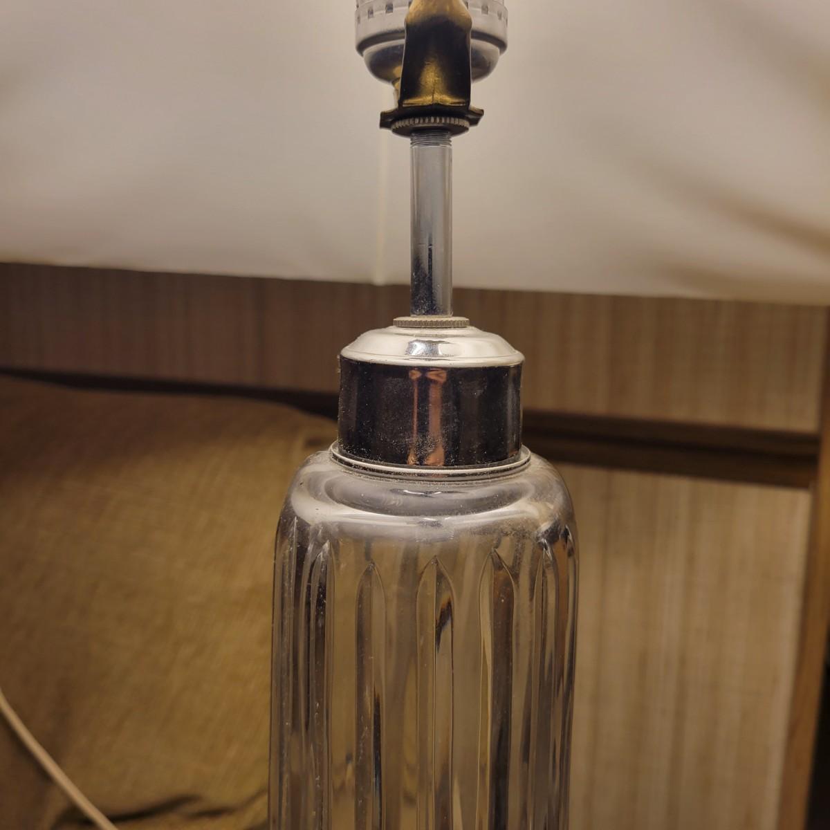 A pair of molded glass lamps with silver hardware in good condition with no notable scratches or chips. Shades are starting to tear on the interiors, see attached pictures for more detail. Lamps have in-line switches and worked when tested. Lamps measure approximately 20" x 37.5" including shades. Local pickup only