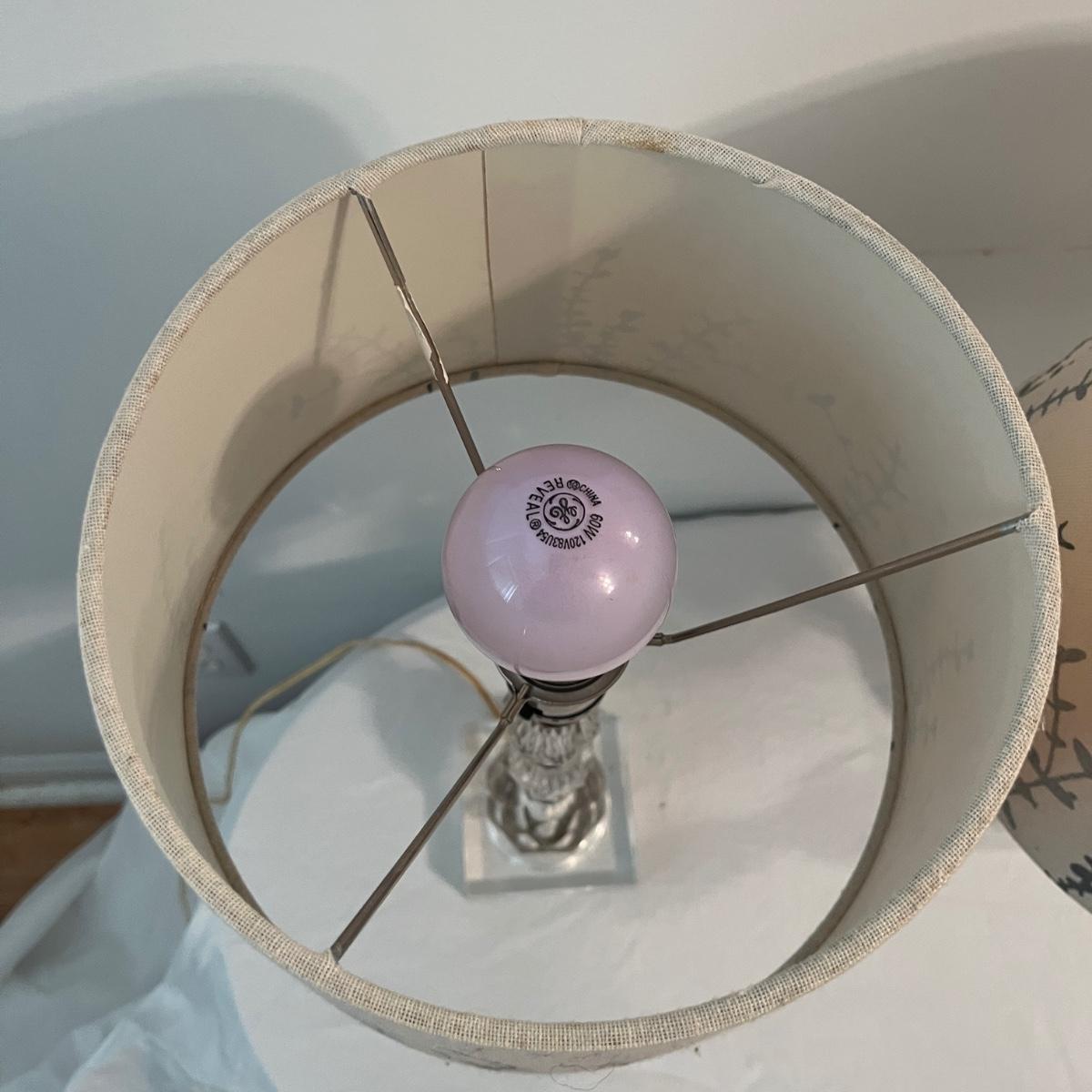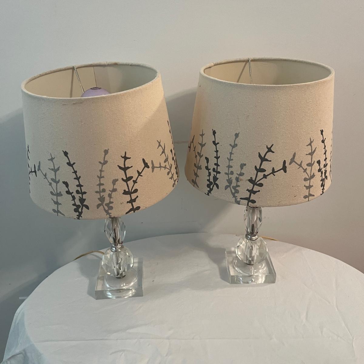 Lot includes a pair of glass table lamps with shades. Lamps powered on when plugged in and have on/off switch. Lamp bases measure 3.5” x 3.5” with a 8”D shade and are 16”H.