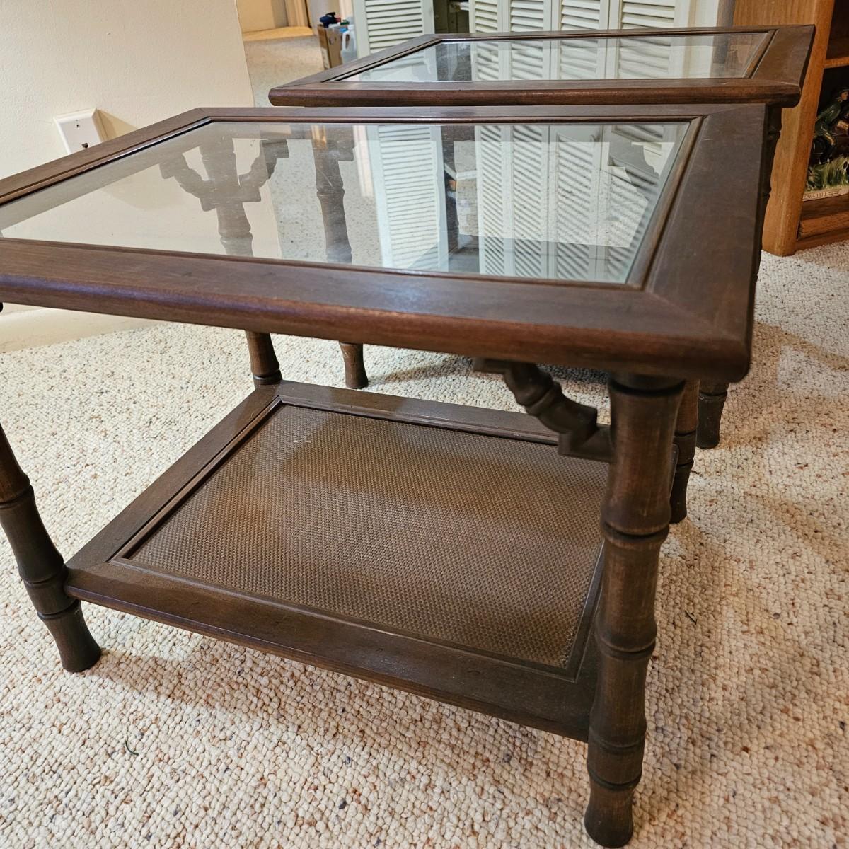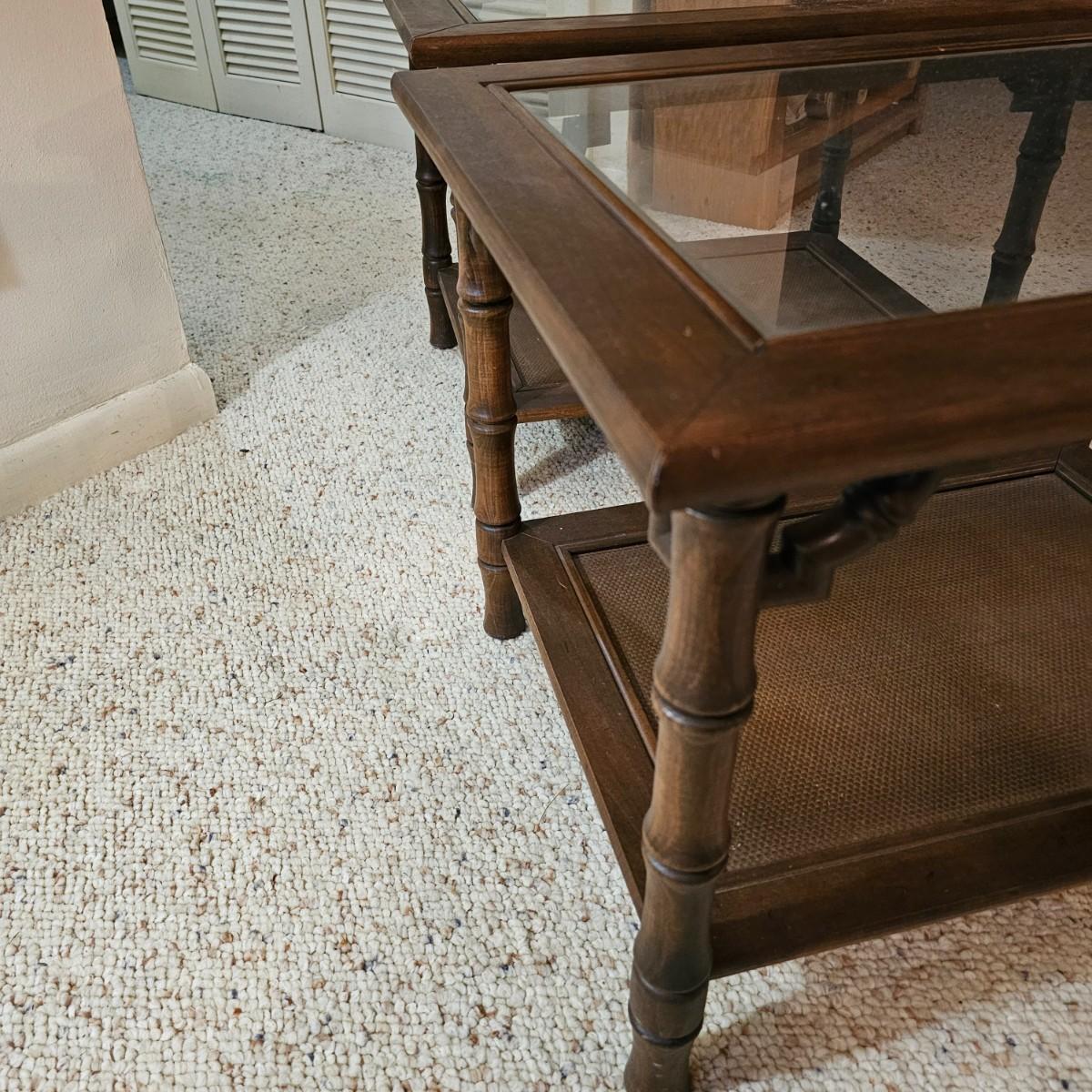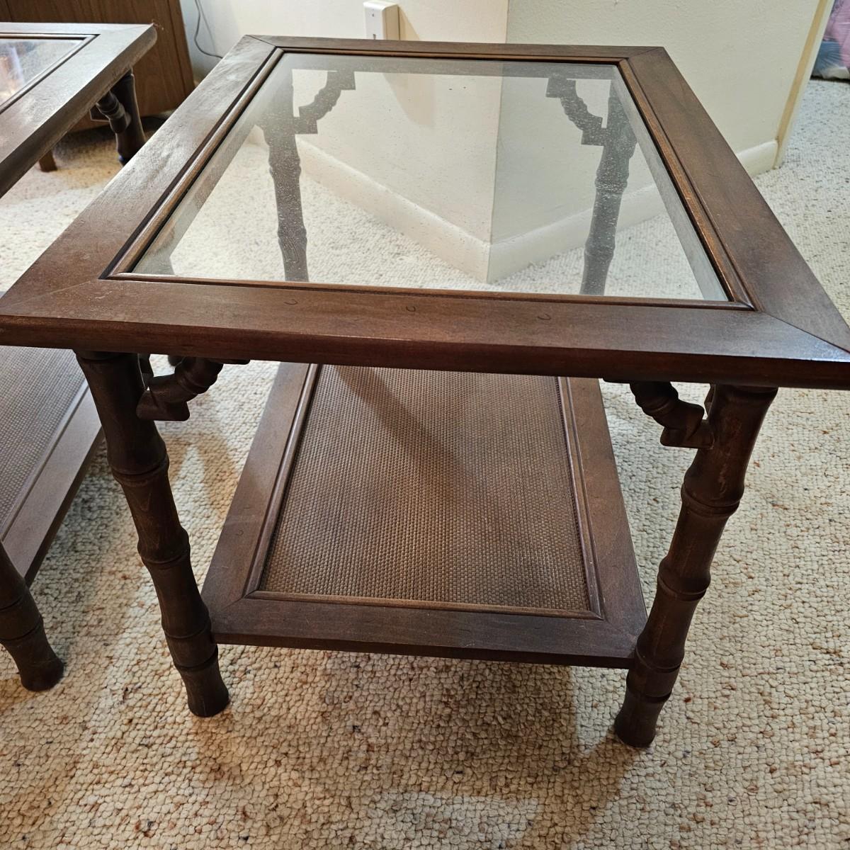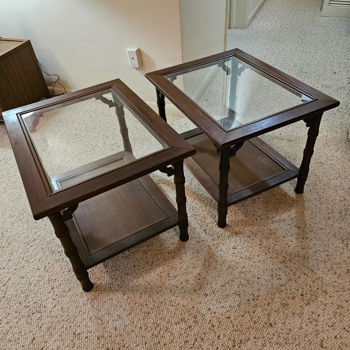 Two glass top end tables with lower shelves. Glass inserts and turned spindle legs. Some minor blemishes on top edges, see photos for examples. Local pickup only.