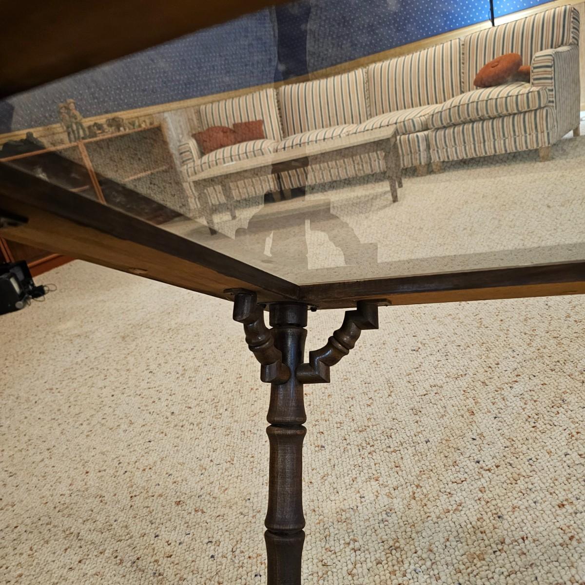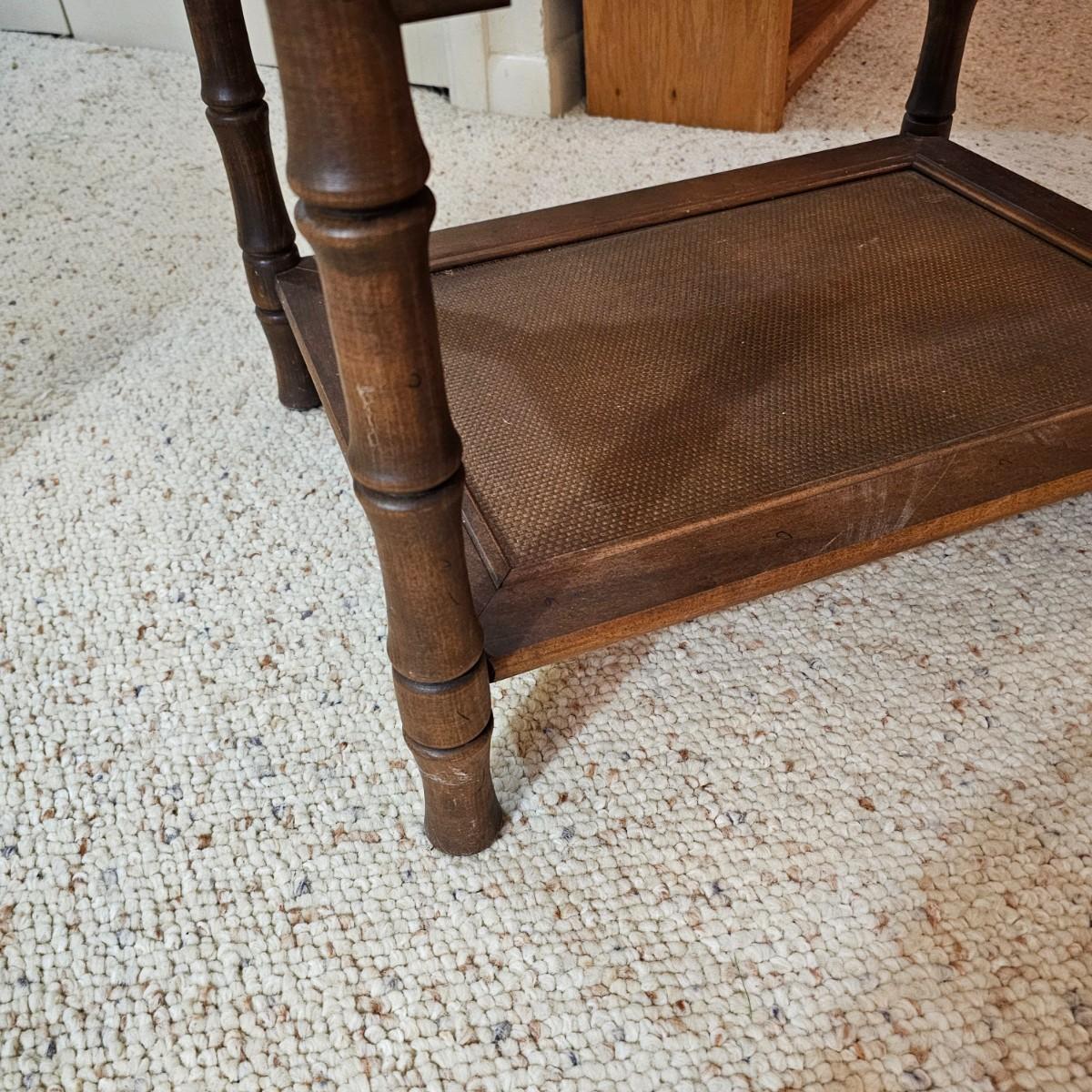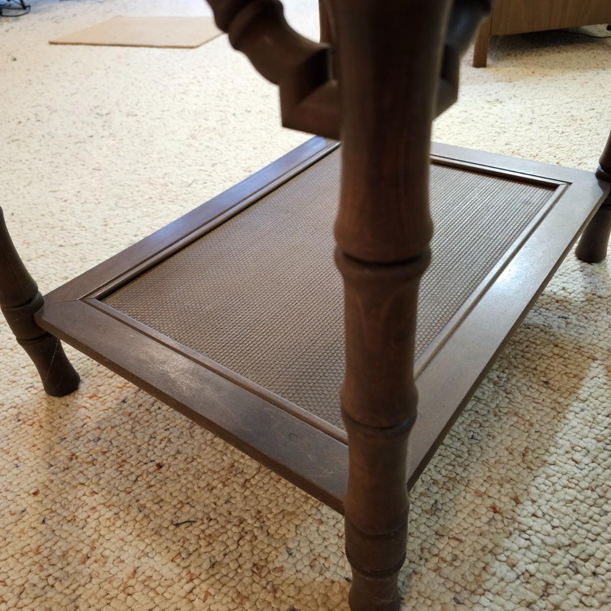 Two glass top end tables with lower shelves. Glass inserts and turned spindle legs. Some minor blemishes on top edges, see photos for examples. Local pickup only.