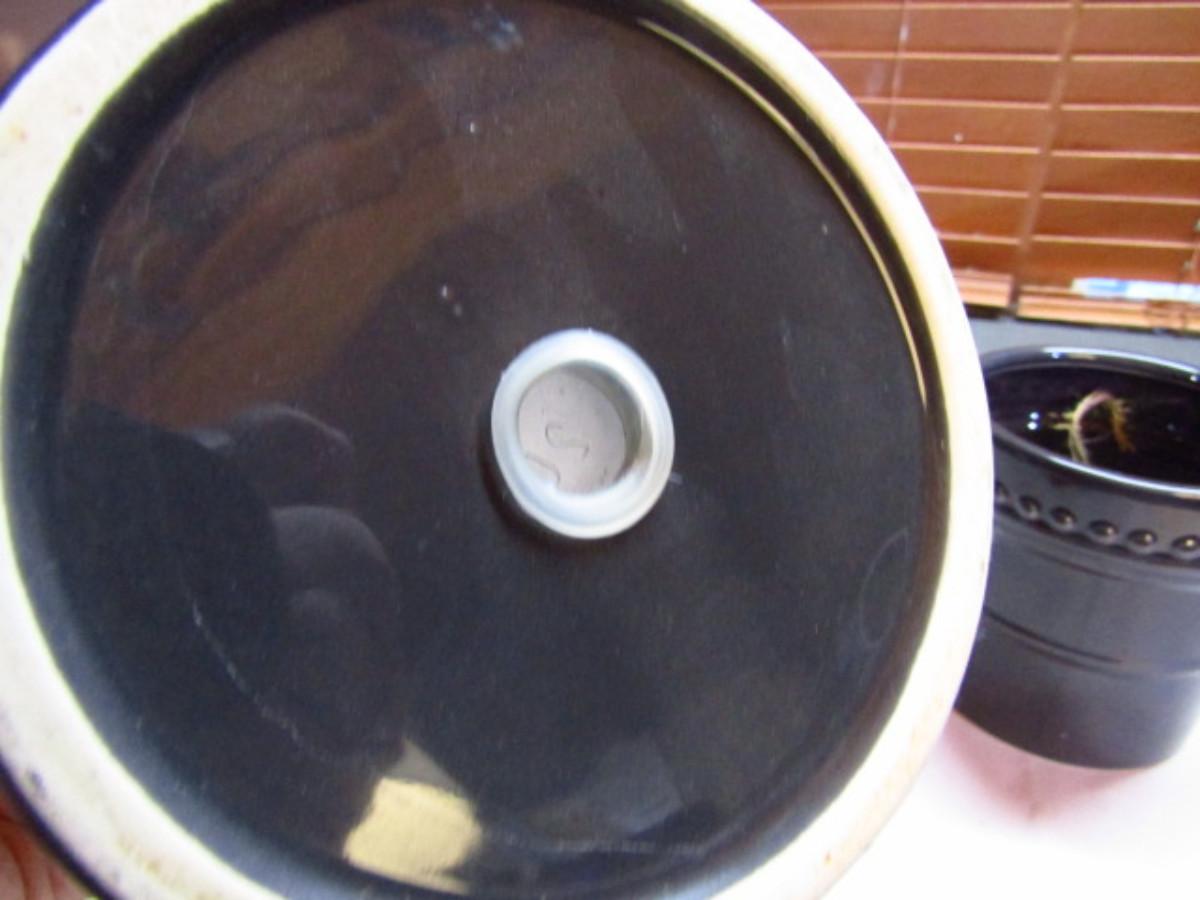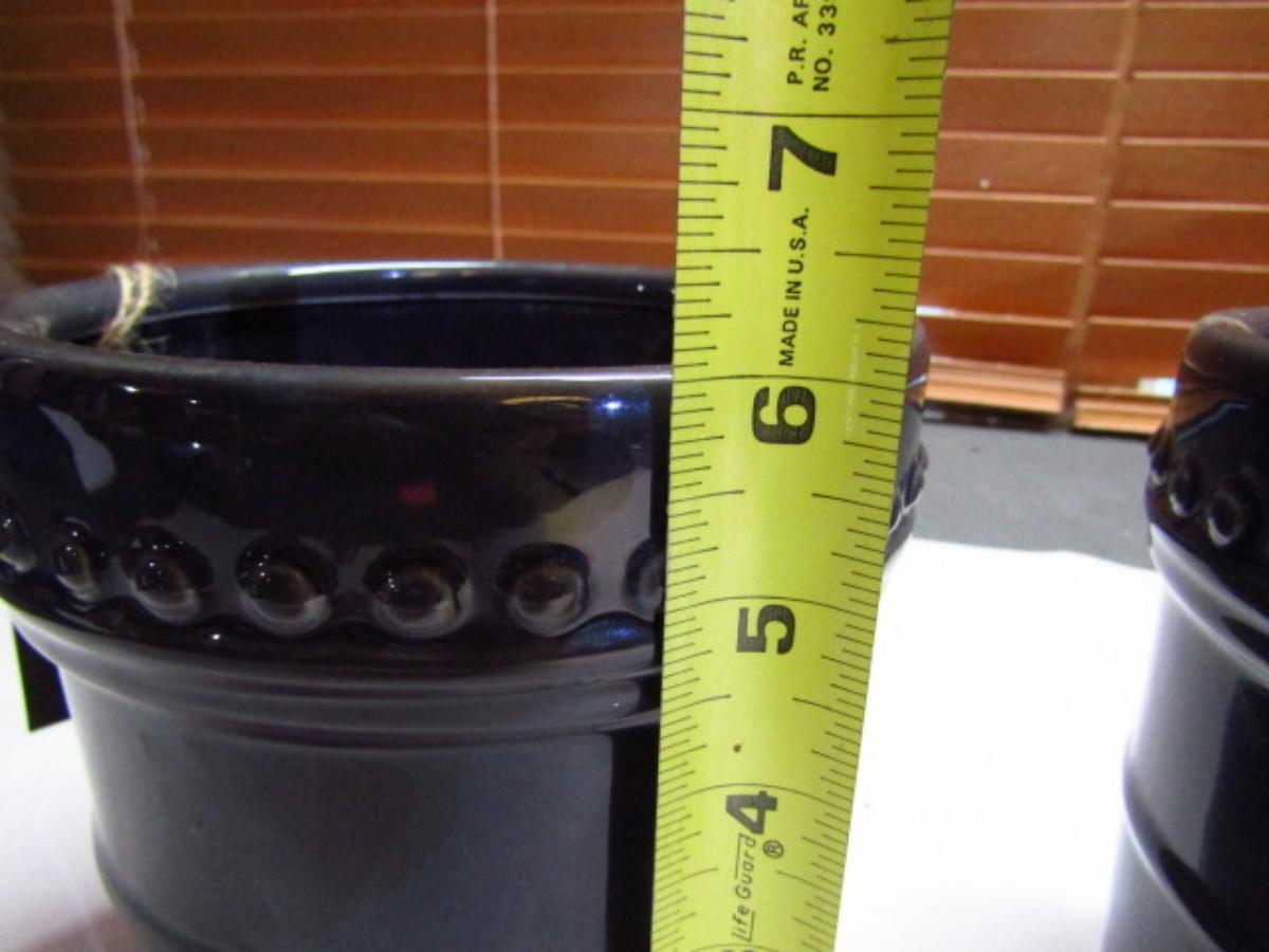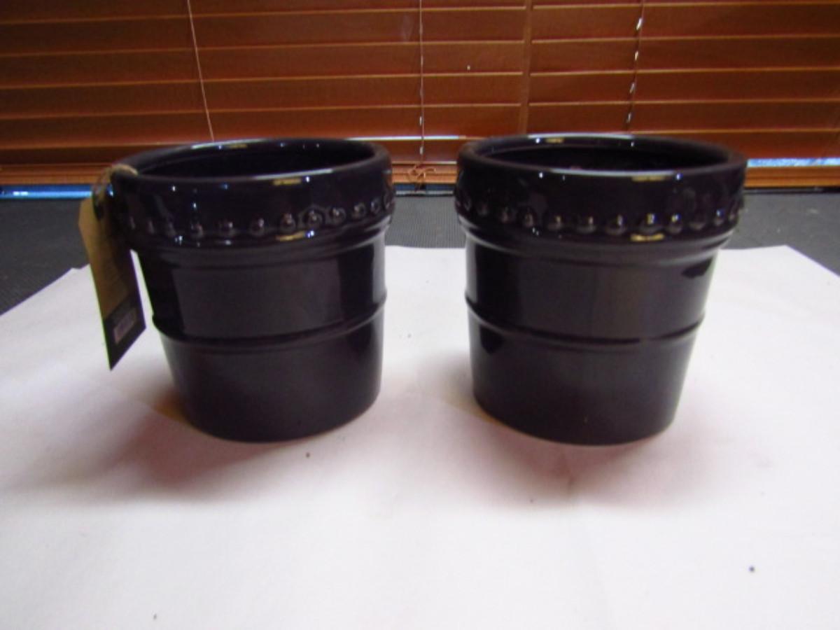 Pair of Glazed Pottery Planters (G). Pots have a hole for drainage, but also have plastic plugs. Measure approx 6" across x 6" tall.