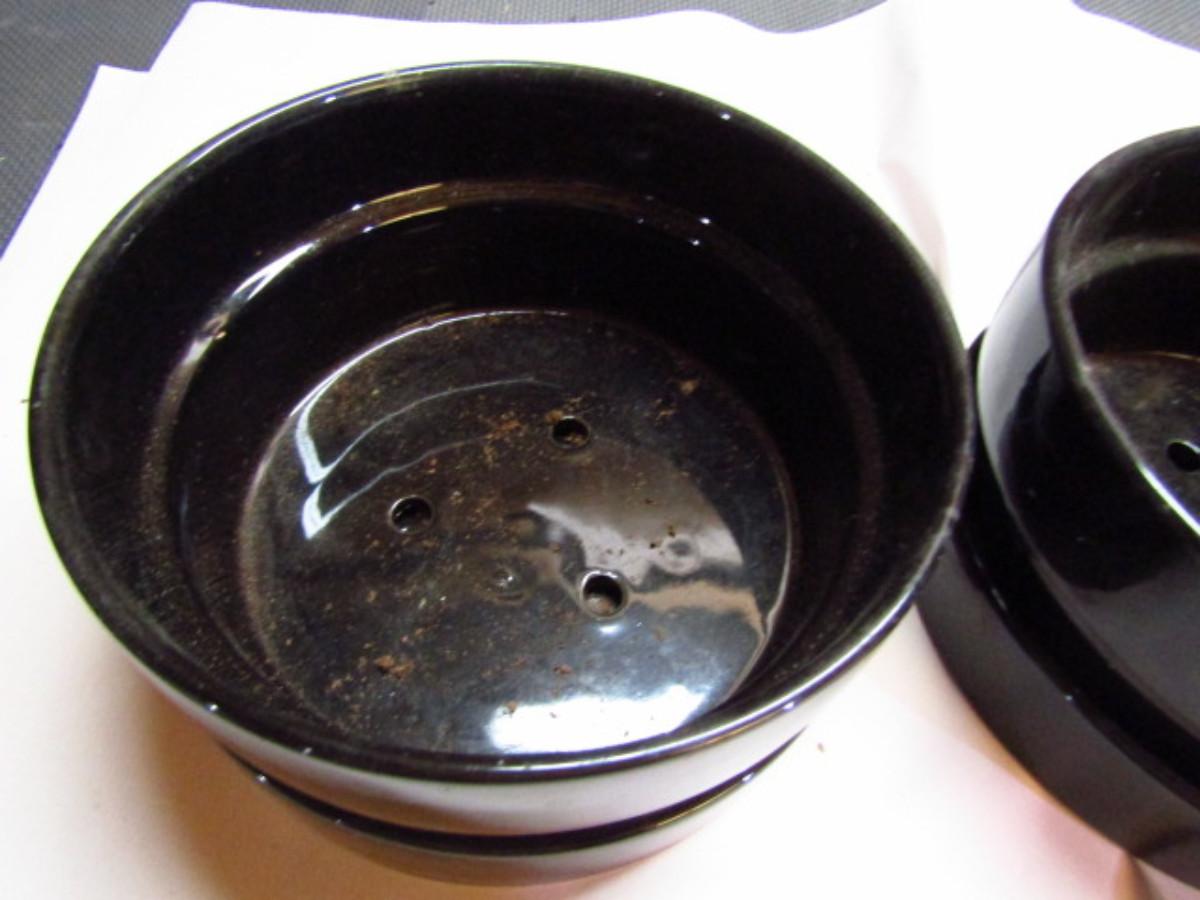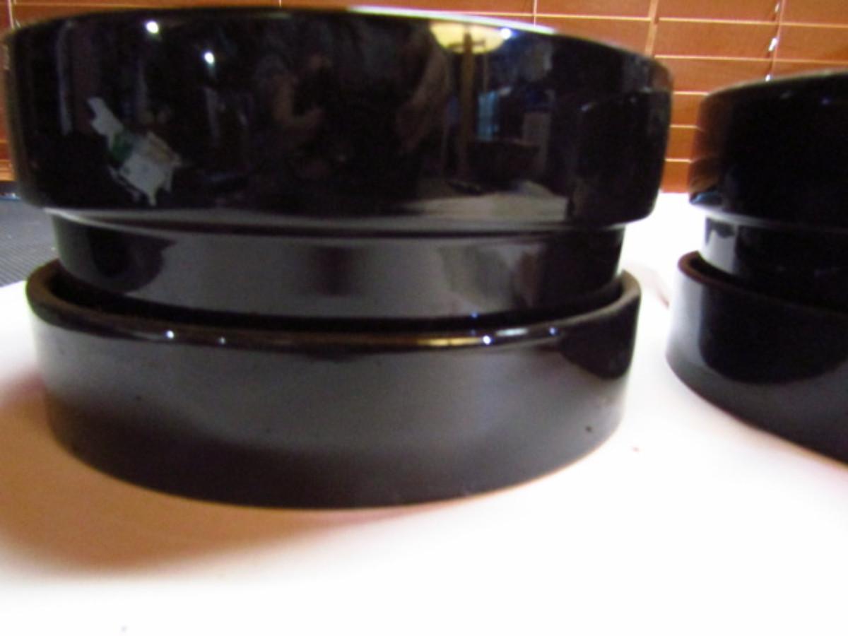 Pair of Glazed Pottery Planters (G). Complete with attached saucers. Measure approx 8 1/2" wide, 4 5/8" tall.