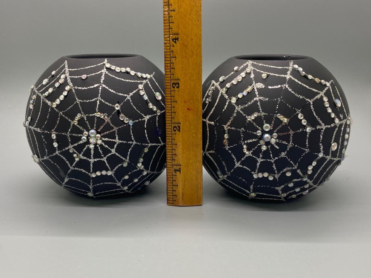 Pair of Glittery Spider Cobweb Black Candleholders, there is no significant damage to the candle holders and is in good displayabel condition. Check pictures for more details and for sizing.