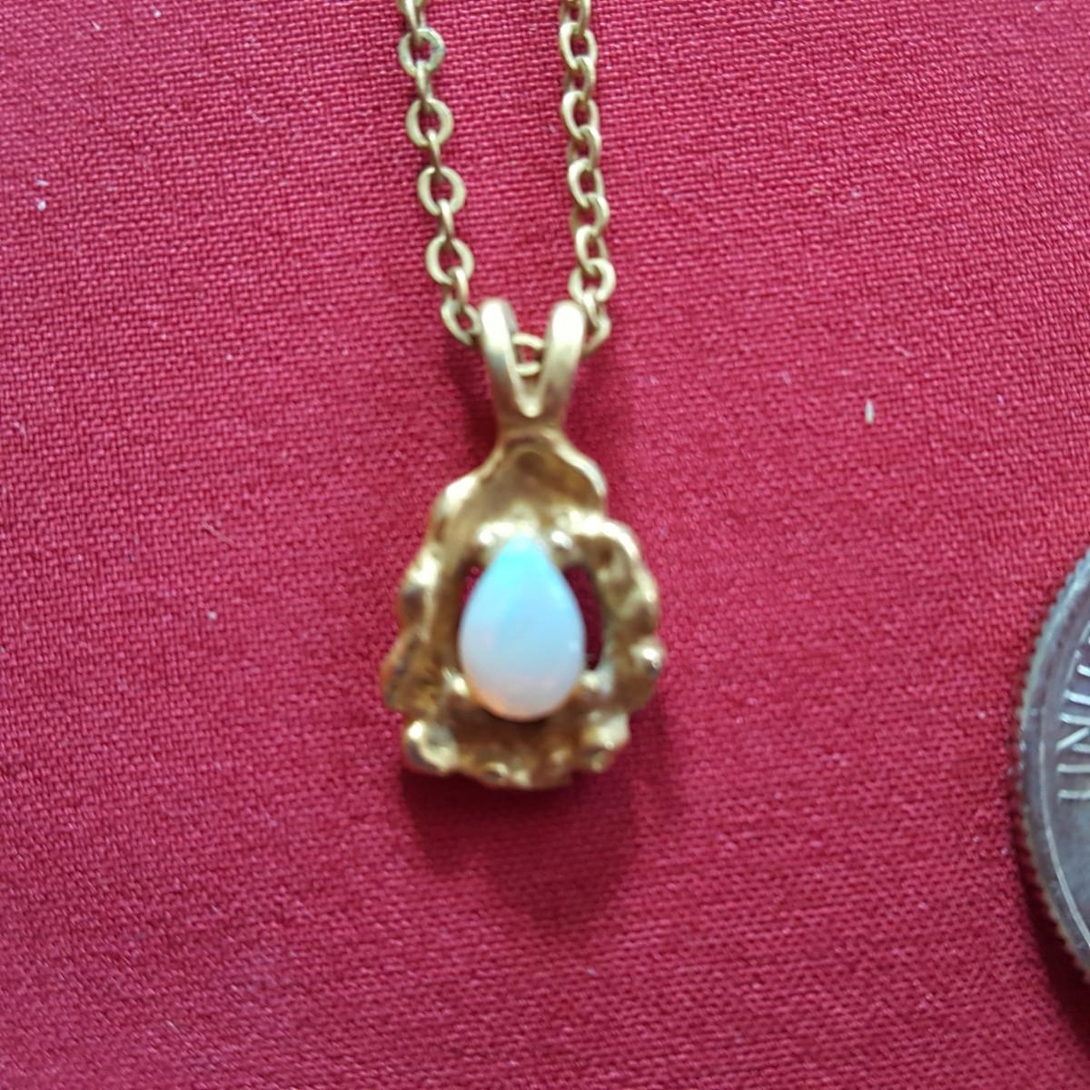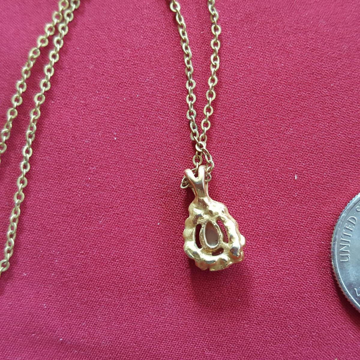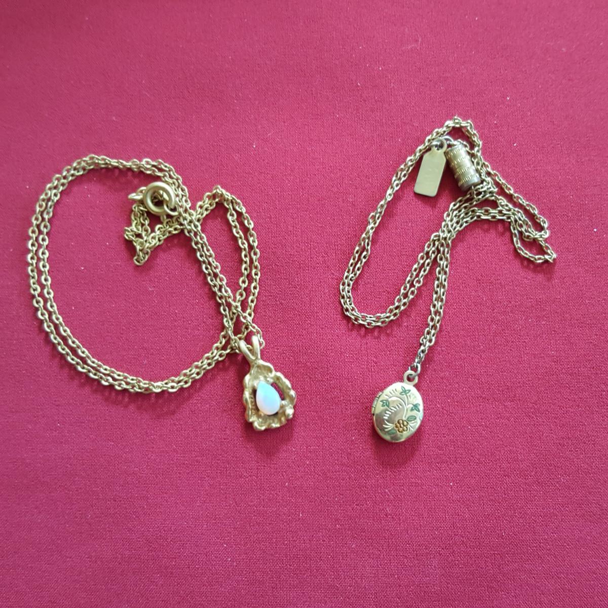 This auction lot is for a Pair of Gold Colored Necklaces. The chains measure about 16-inches long and show no markings. One of the necklaces bears a tag with the date 1928, One sports an openable locket and the other has an translucent Opal-like stone. We don't think they are true gold - but you be the judge.