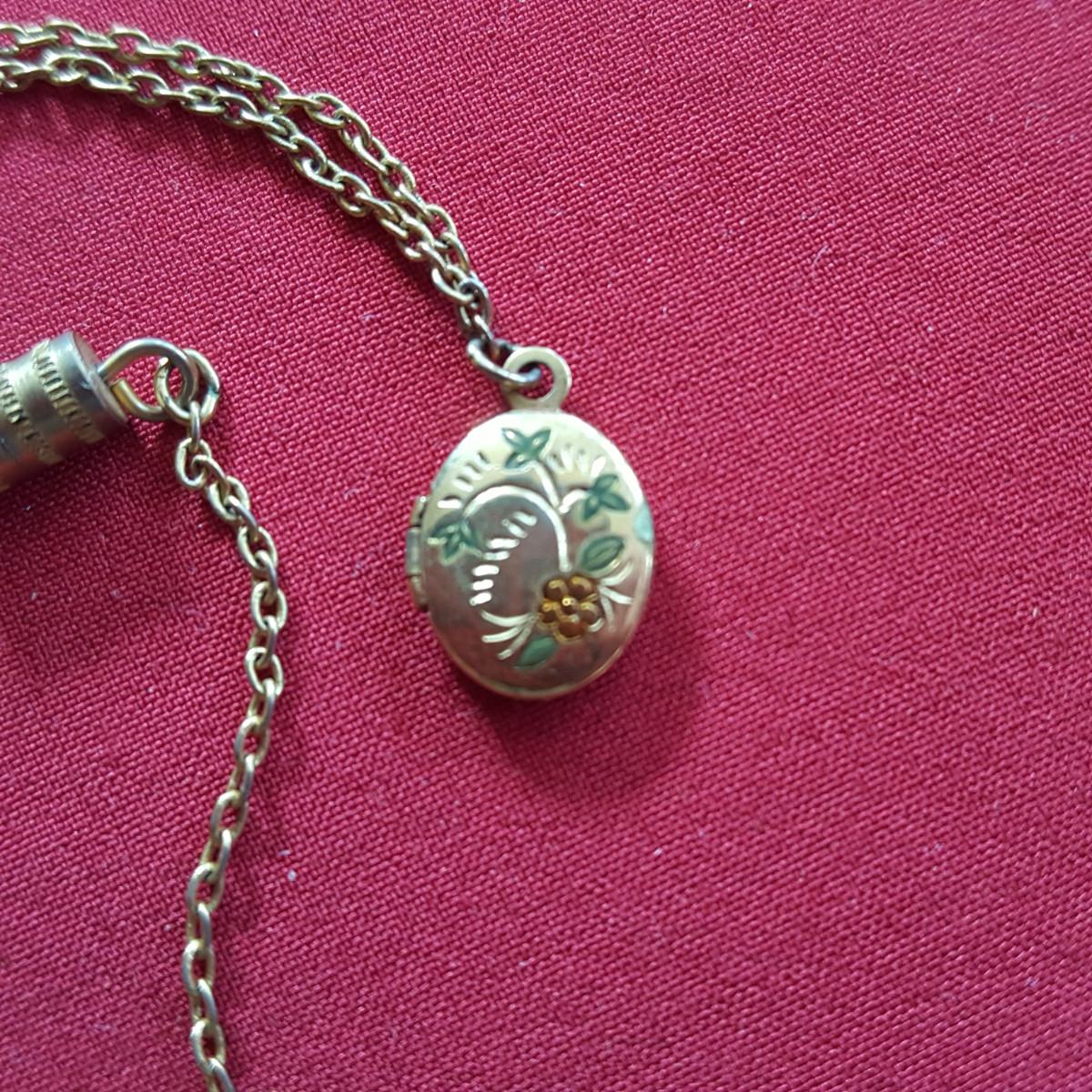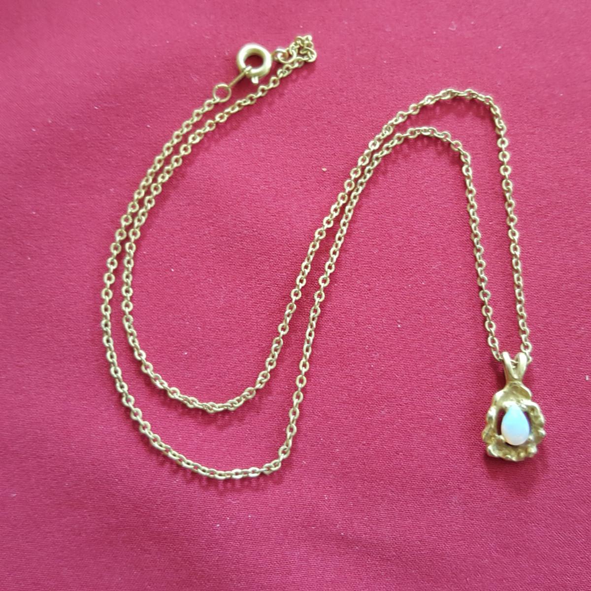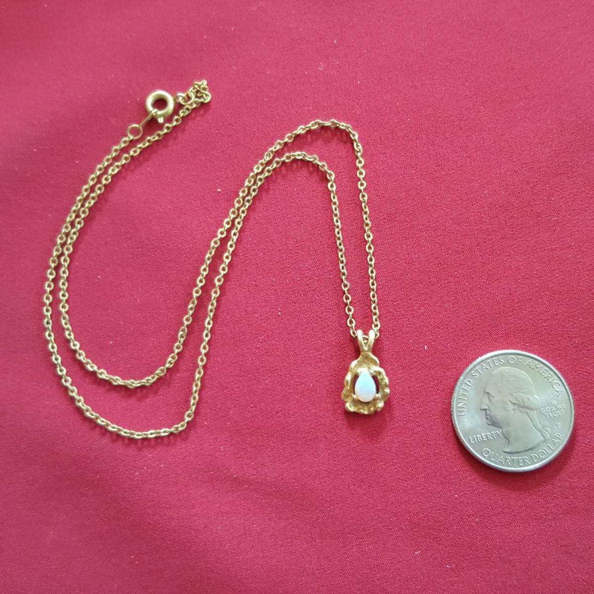 This auction lot is for a Pair of Gold Colored Necklaces. The chains measure about 16-inches long and show no markings. One of the necklaces bears a tag with the date 1928, One sports an openable locket and the other has an translucent Opal-like stone. We don't think they are true gold - but you be the judge.