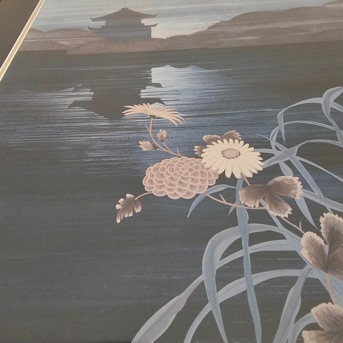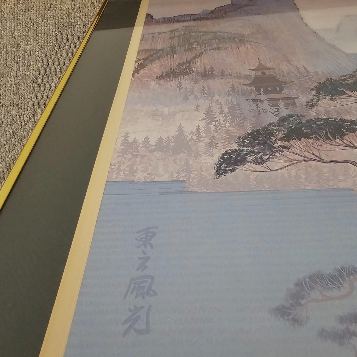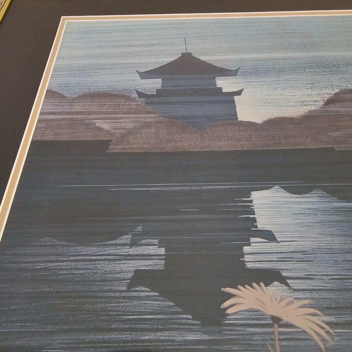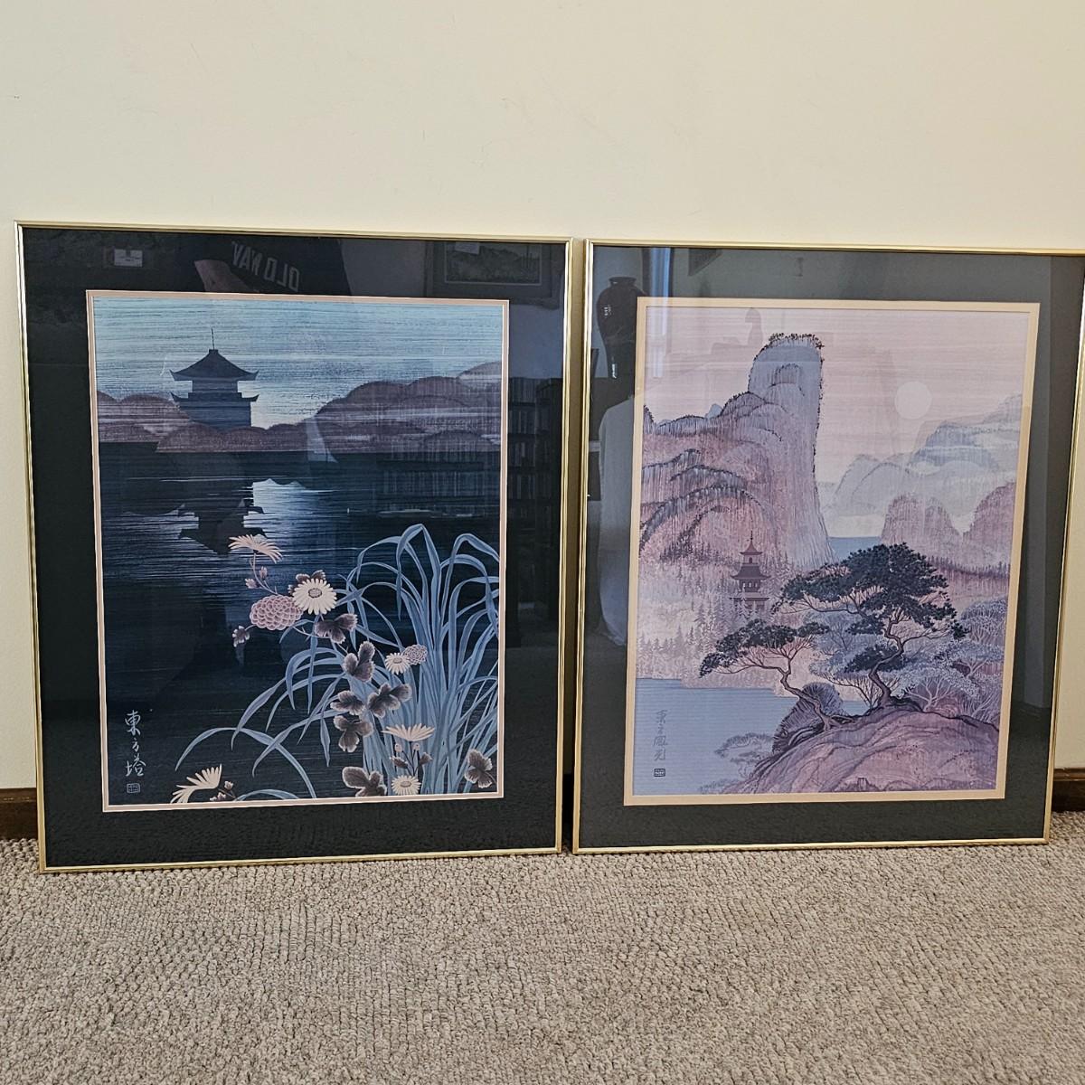 Gold toned metal frames form around these ethereal images of sky, water and land. Iconic pagoda structures stand guard over calm lakes and traditional foliage. Each image measures 28" x 34"H. See photos for details. Shipping available. Shipping can be costly. We suggest contacting our preferred local shipping provider, Postage Express, with dimensions and getting an estimate before bidding: (828) 255-9250 or shipping@postageexpressnc.com.